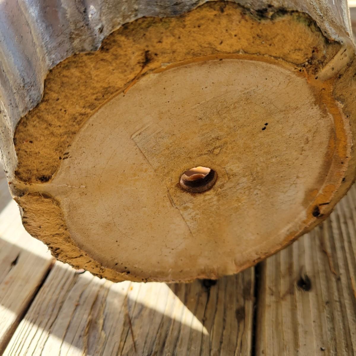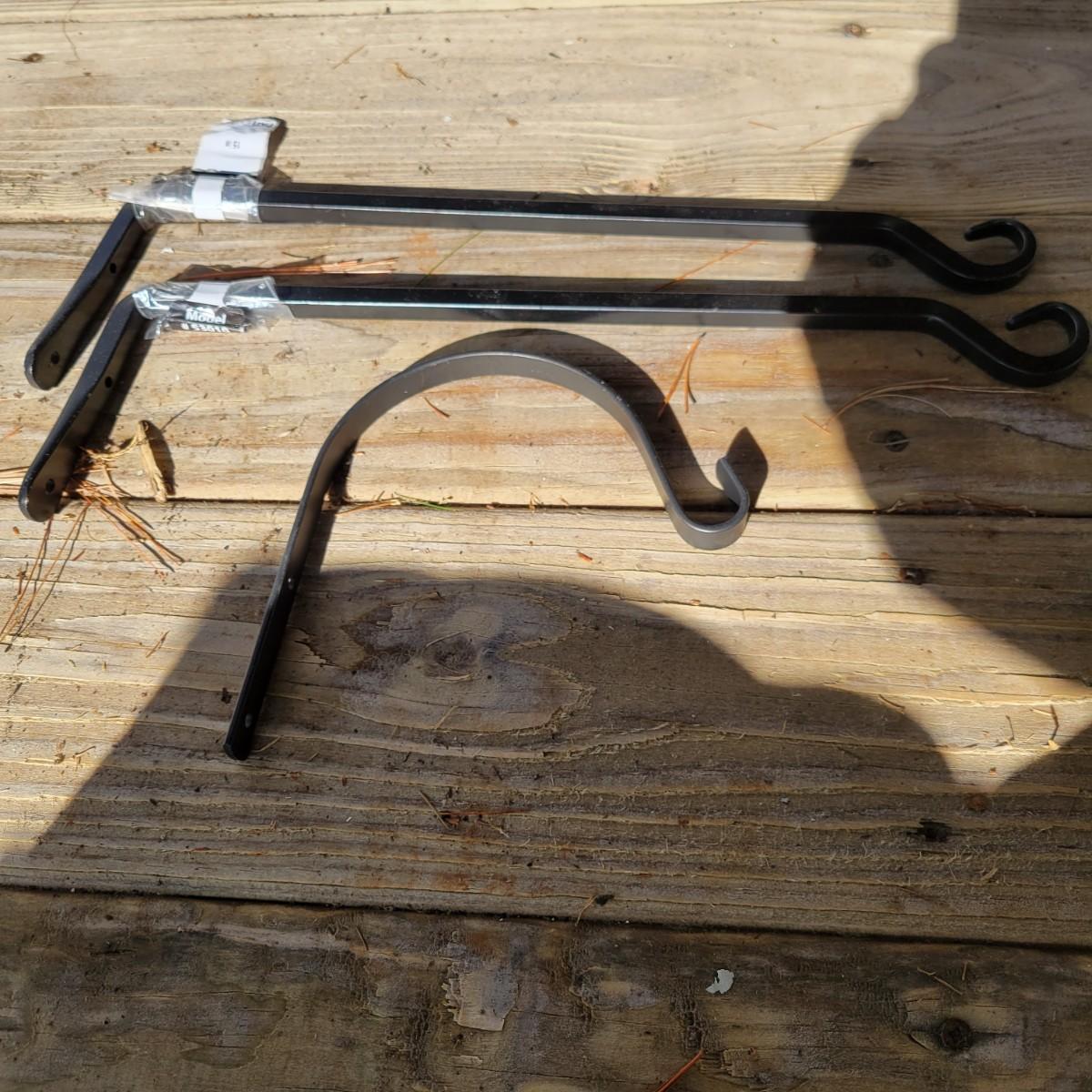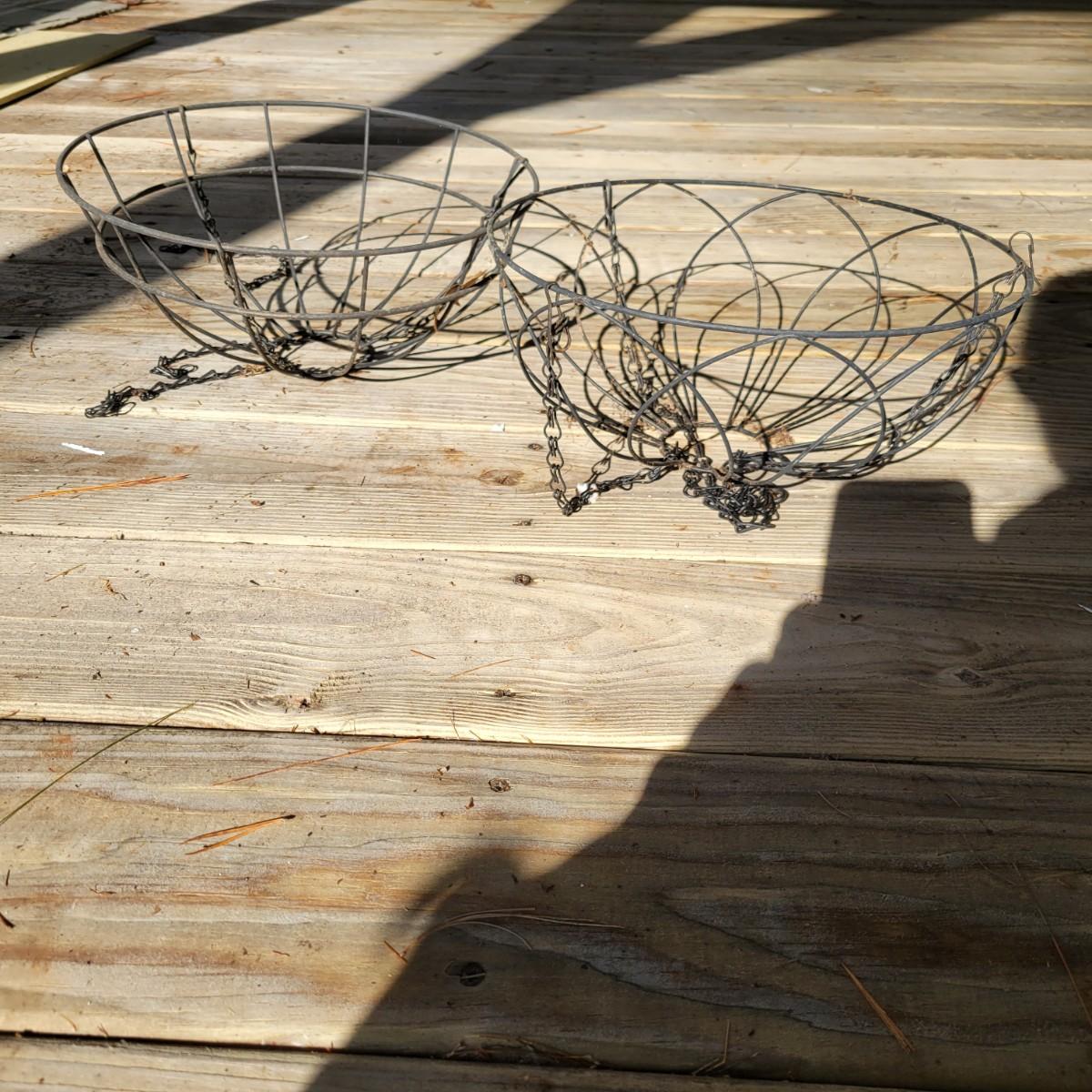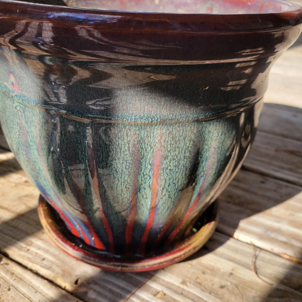 An assortment of ceramic pots, hanging planters, stands and other items in good condition with some damage. Two large ceramic planters that include terracotta bases and metal plants stands. One pot does have a piece missing from its lip. Pots measure approximately 16" x 12". Two smaller ceramic, glazed Pots are included. A pair of hand gardening tools, three metal wall mounted hanger, seven hanging planters that are a Mix of plastic and metal, two bags of bamboo plant stakes and two shepards hooks, one of which has a clamp base for mounting to a deck rail. The large flower pot with pansies is full of soil and very heavy. It measures approximately 22" x 16" and is a ceramic pot. Local pickup only. Winning bidder must bring assistance to help move and load this item due to its weight and/or size
