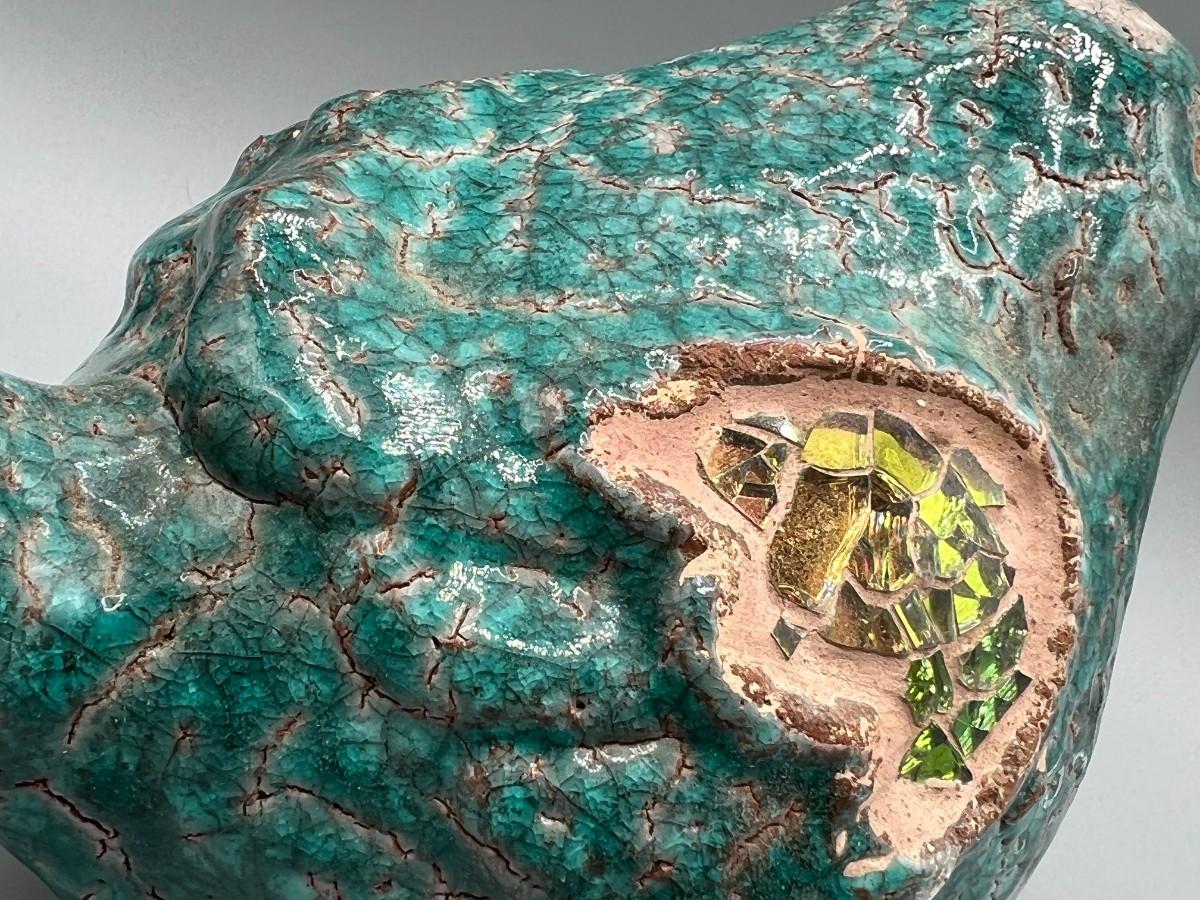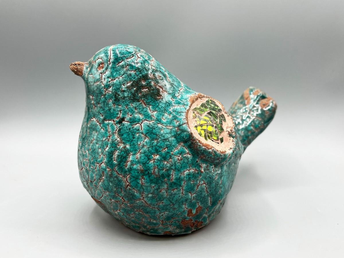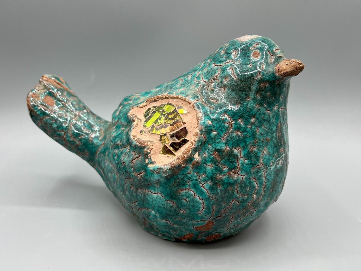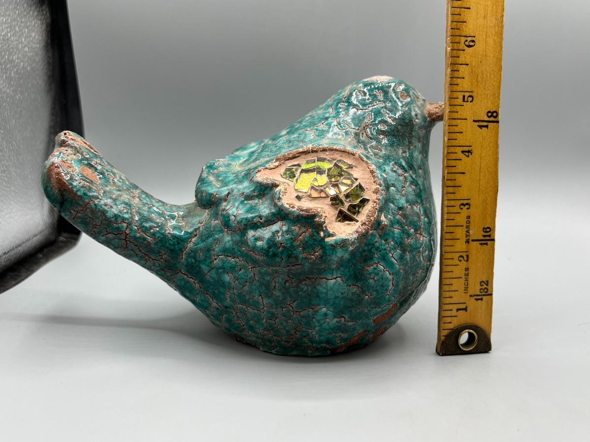 Ceramic bird garden art bird. Green crackle finish, with mosaic wings. Looks like it has signs of age but not sure if that is how it is supposed to look. Great yard and garden decor.
