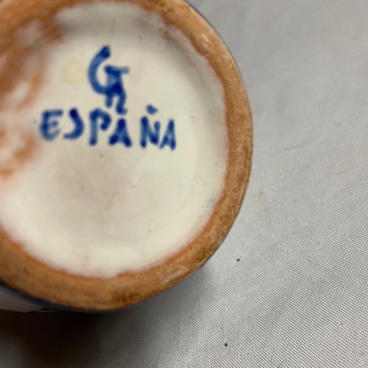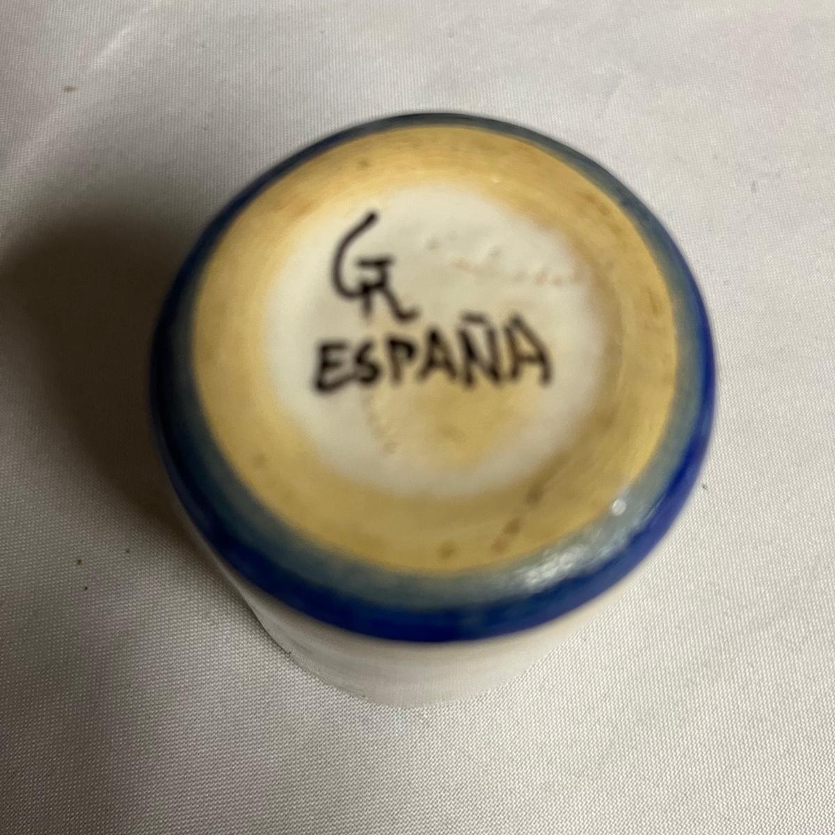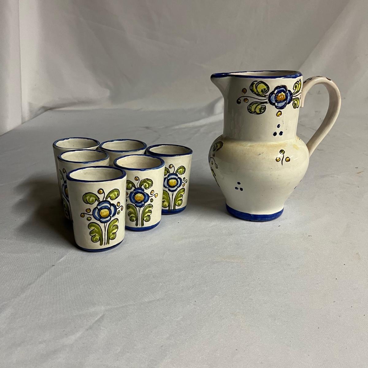 Lot includes a pitcher with six matching cups. All pieces are marked GR España. Pitcher measures 5” x 6.5” x 7.5”.