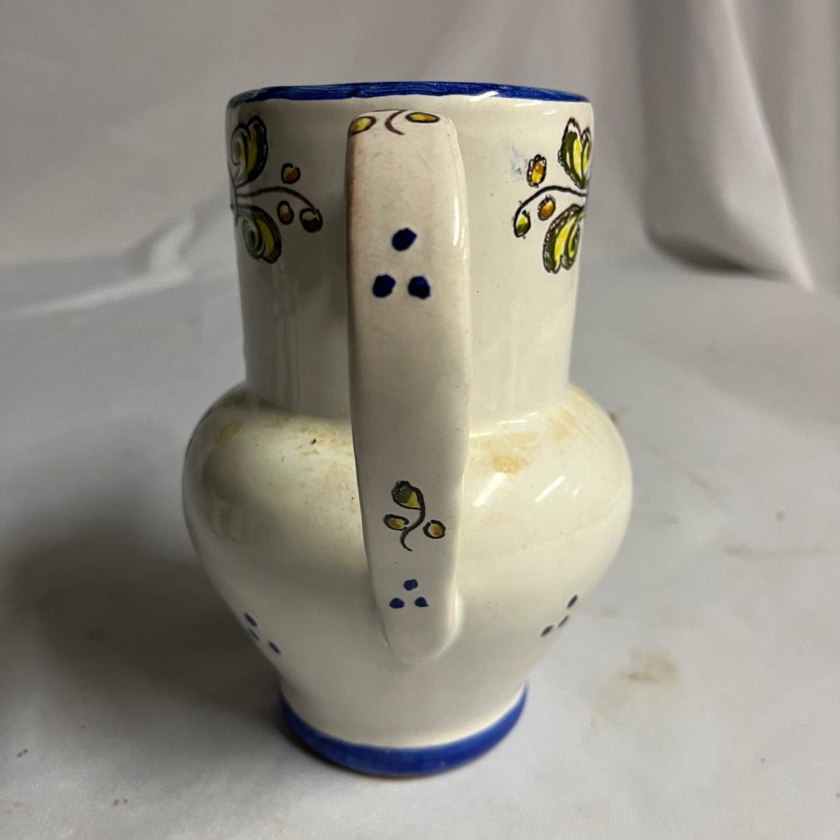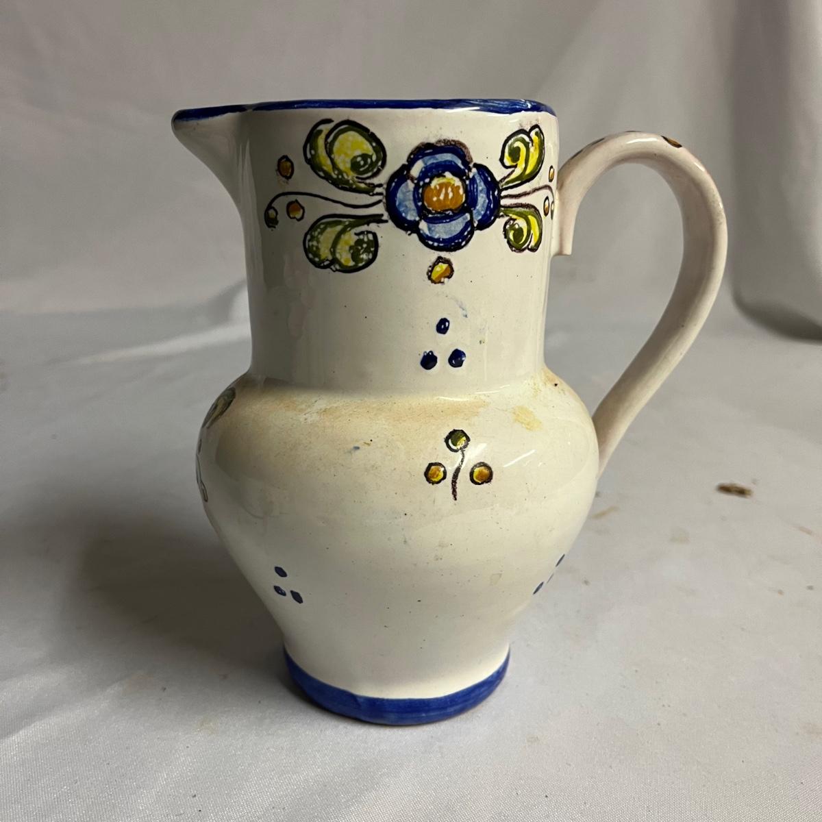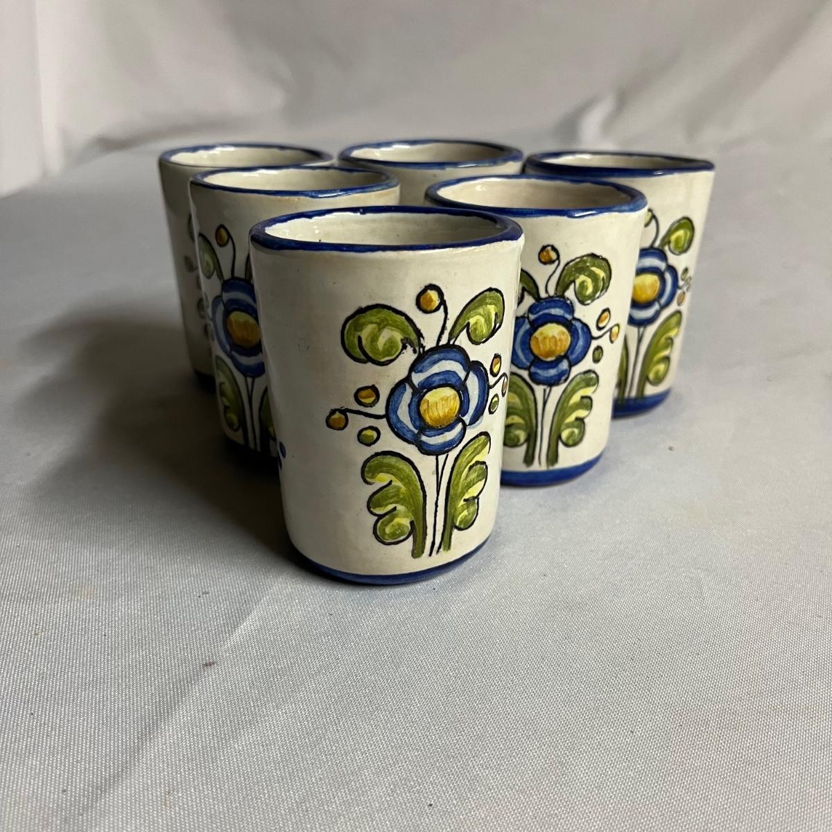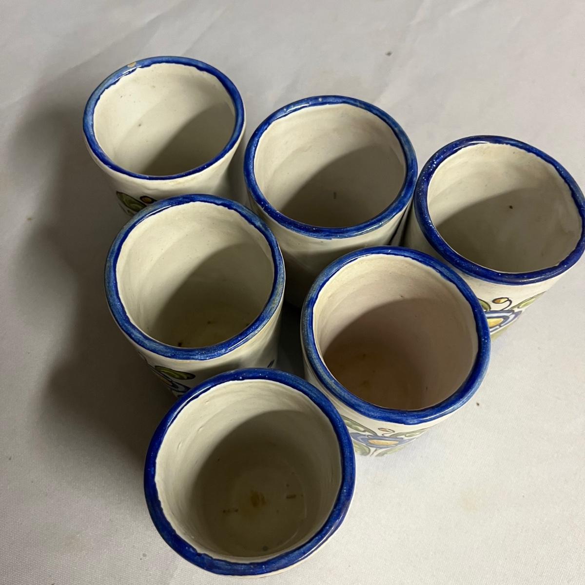 Lot includes a pitcher with six matching cups. All pieces are marked GR España. Pitcher measures 5” x 6.5” x 7.5”.