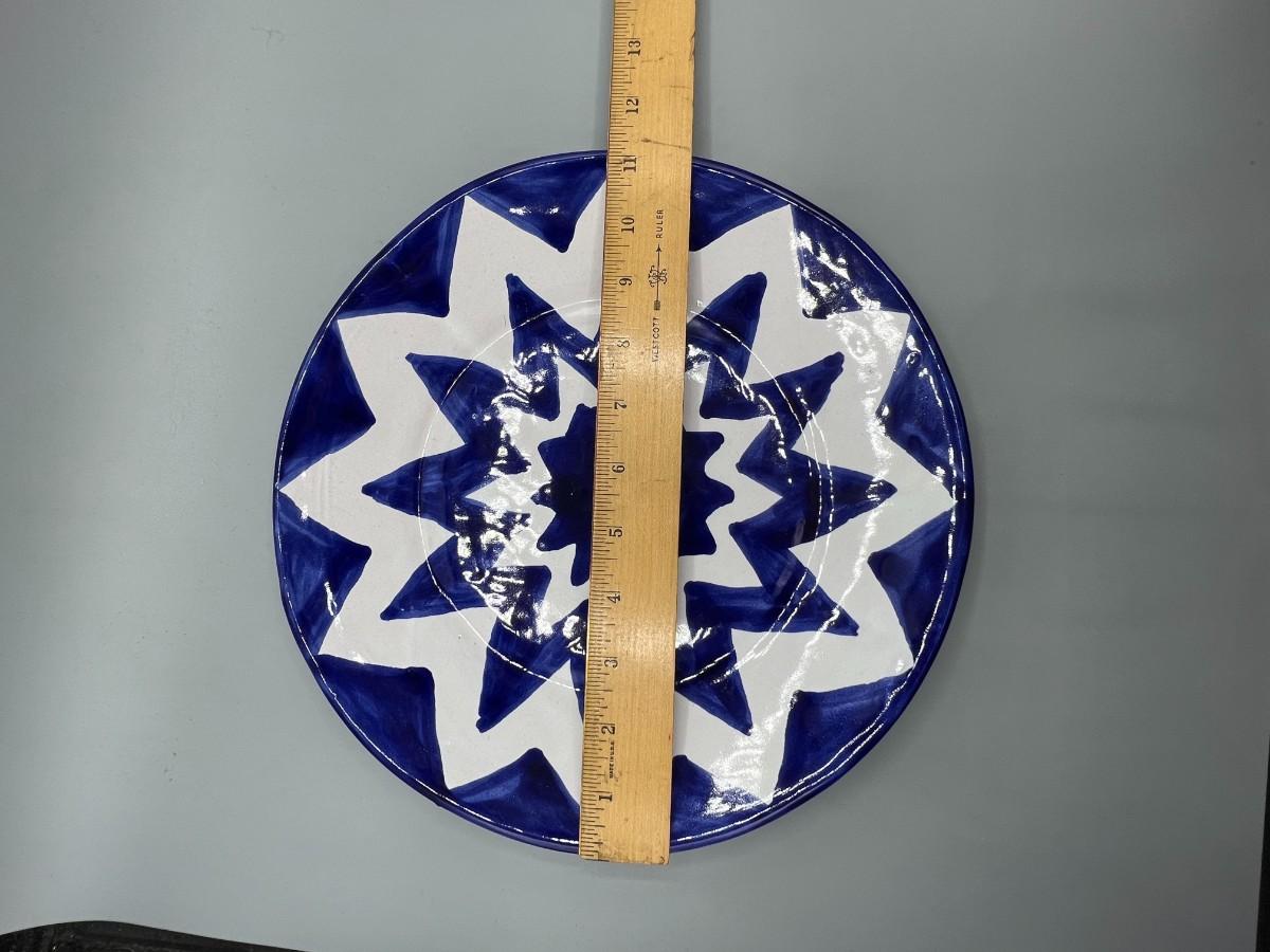 Ceramic pottery wall hanging decorative plate. White with a hand painted blue star design. Unsigned. About 11" diameter.