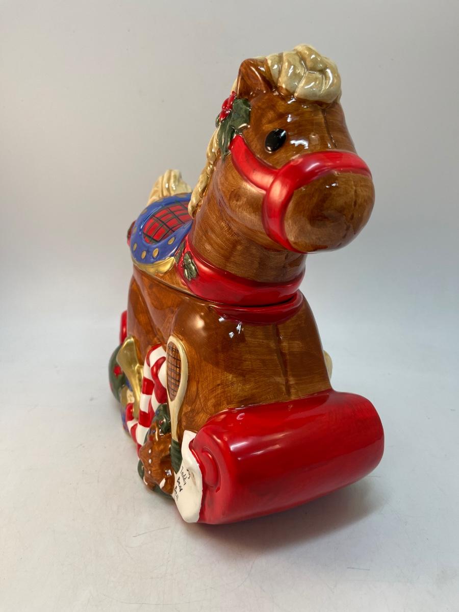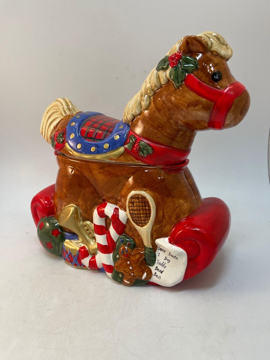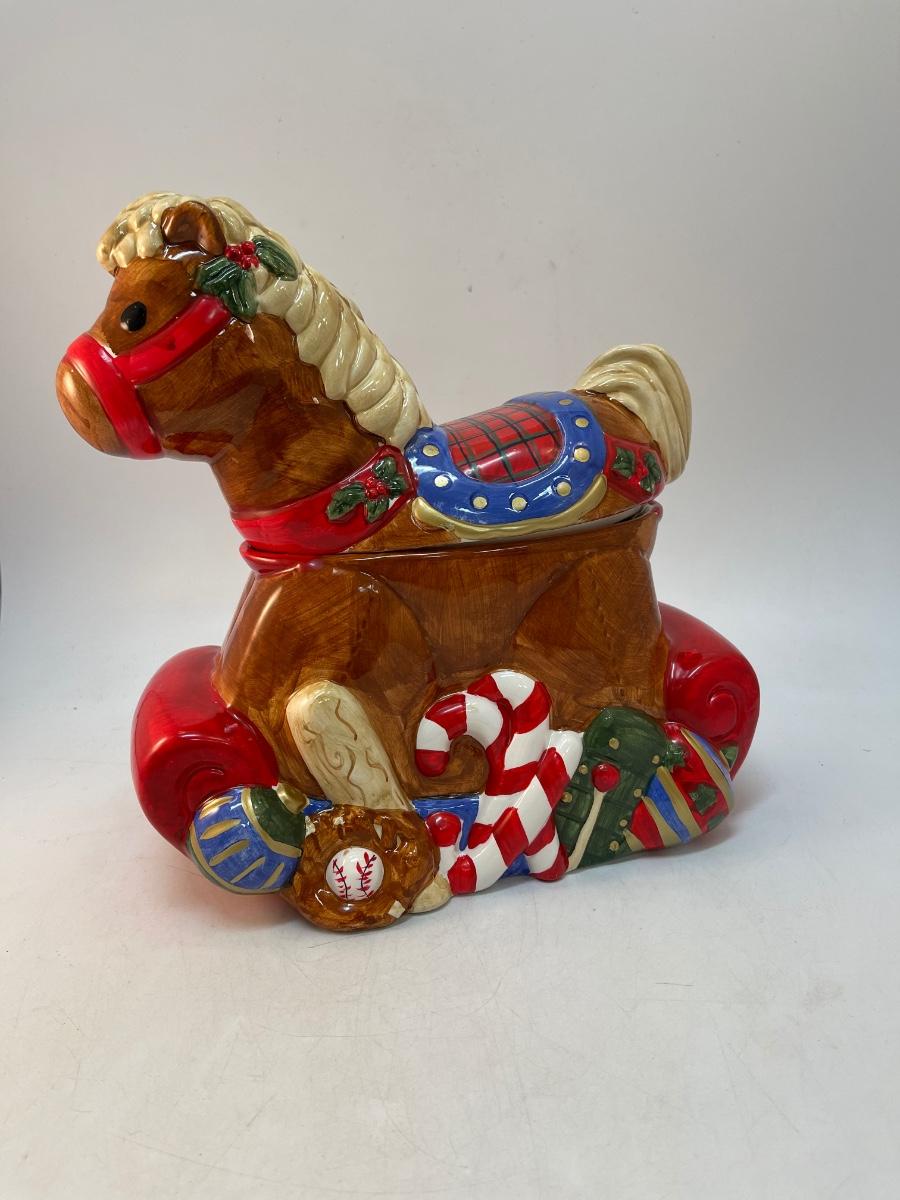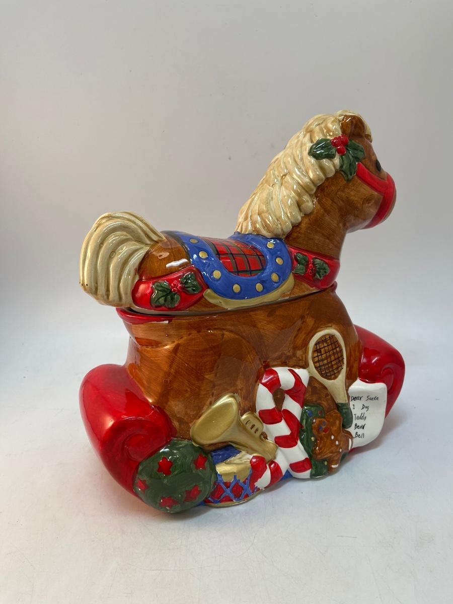 Ceramic Rockinghorse cookie jar Christmas holiday. In new condition in box. Top sits a little funny on base, I think there is more of a gap than there should be.