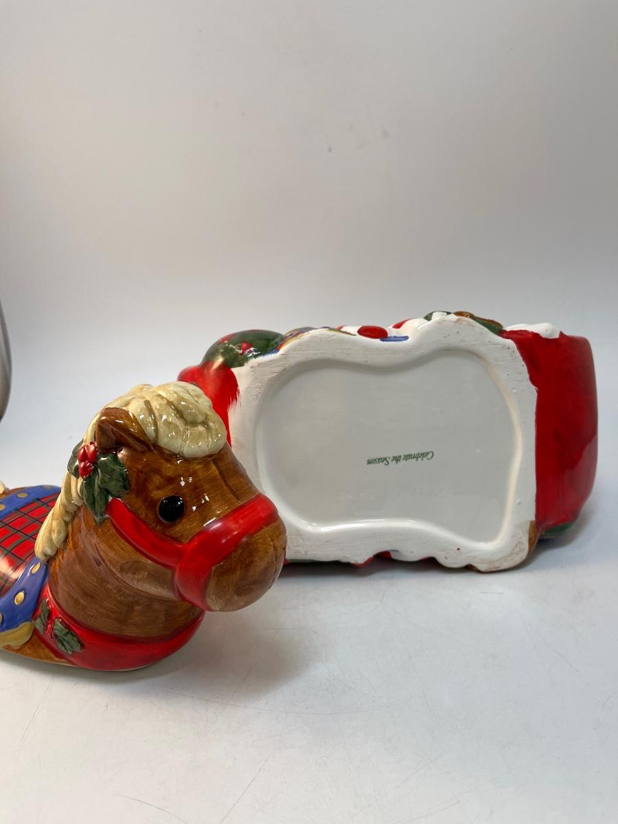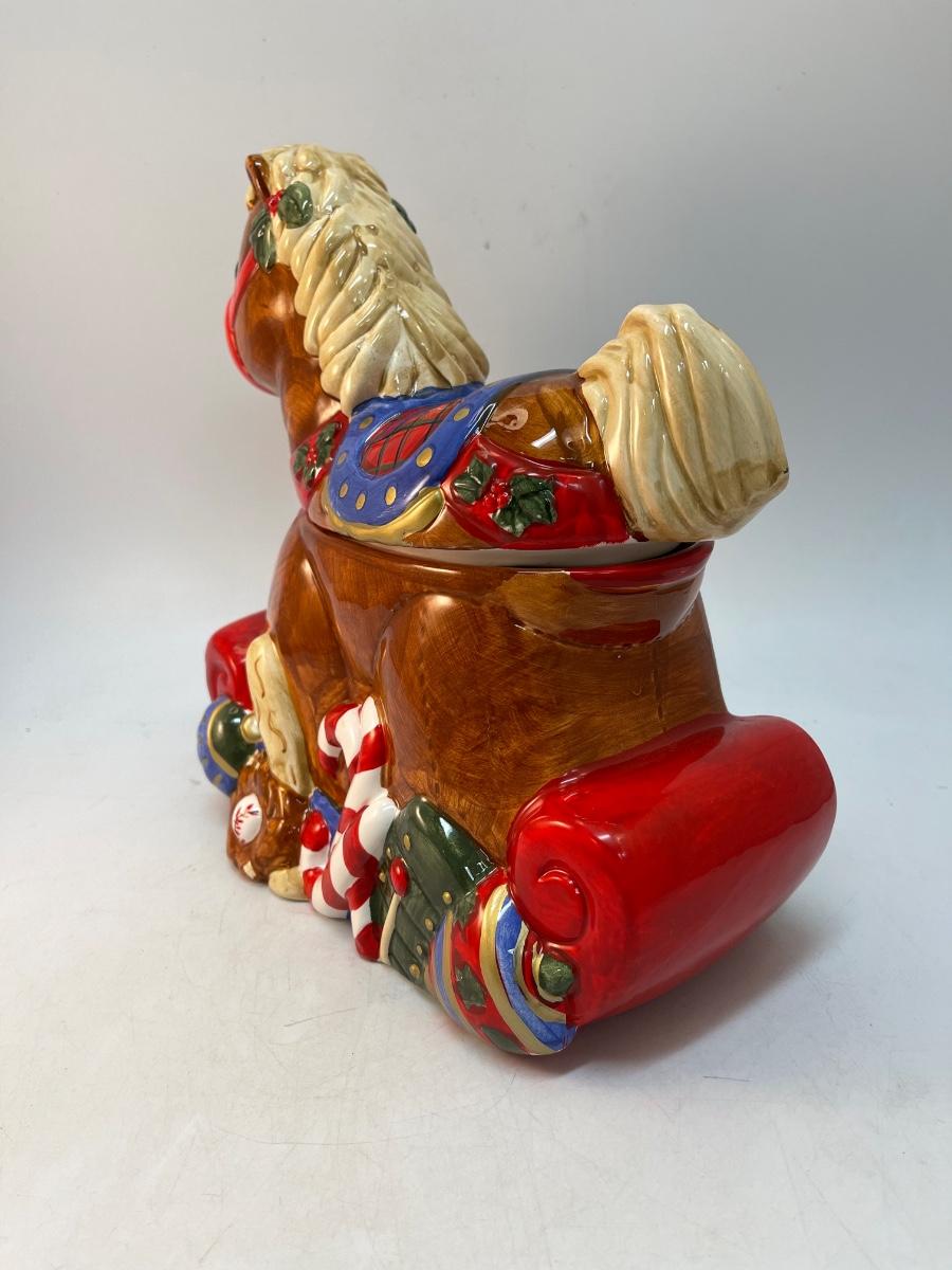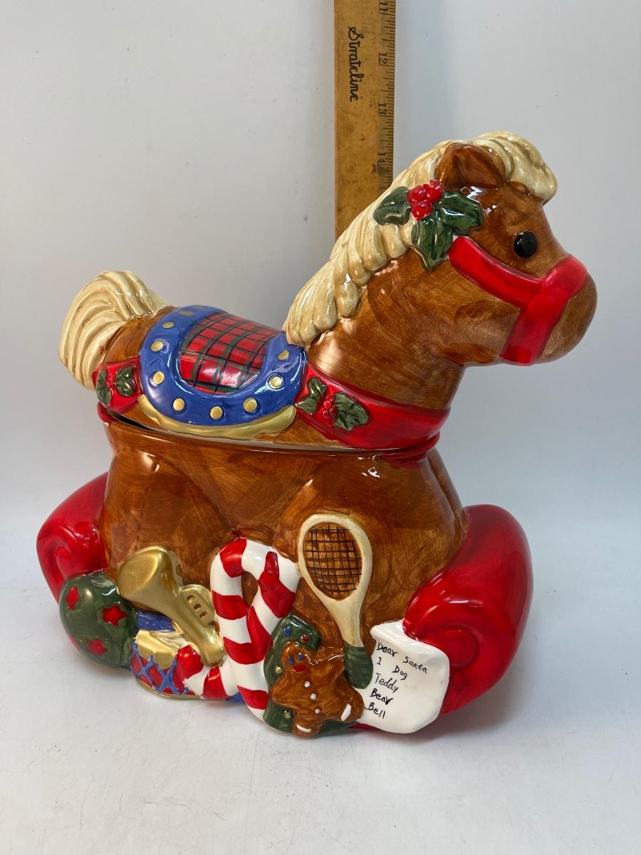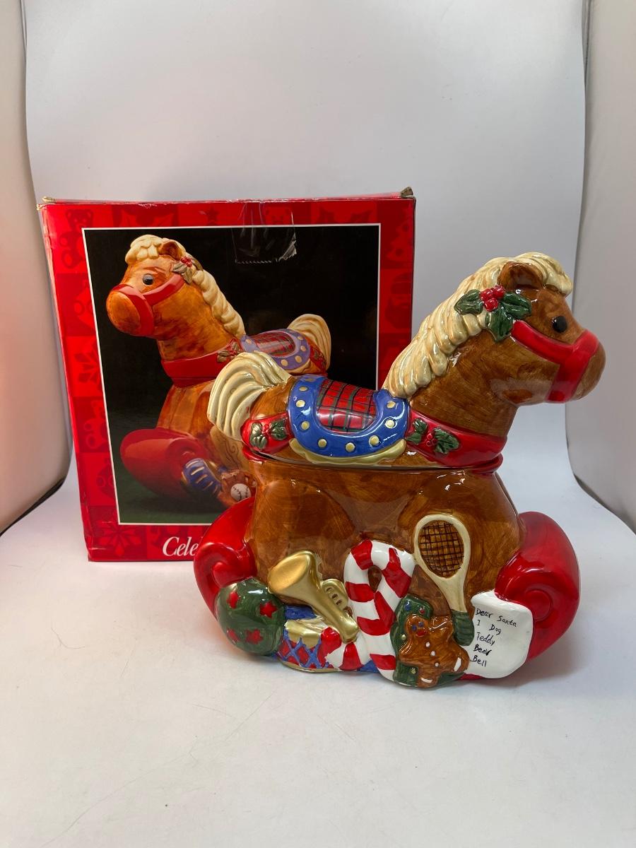 Ceramic Rockinghorse cookie jar Christmas holiday. In new condition in box. Top sits a little funny on base, I think there is more of a gap than there should be.
