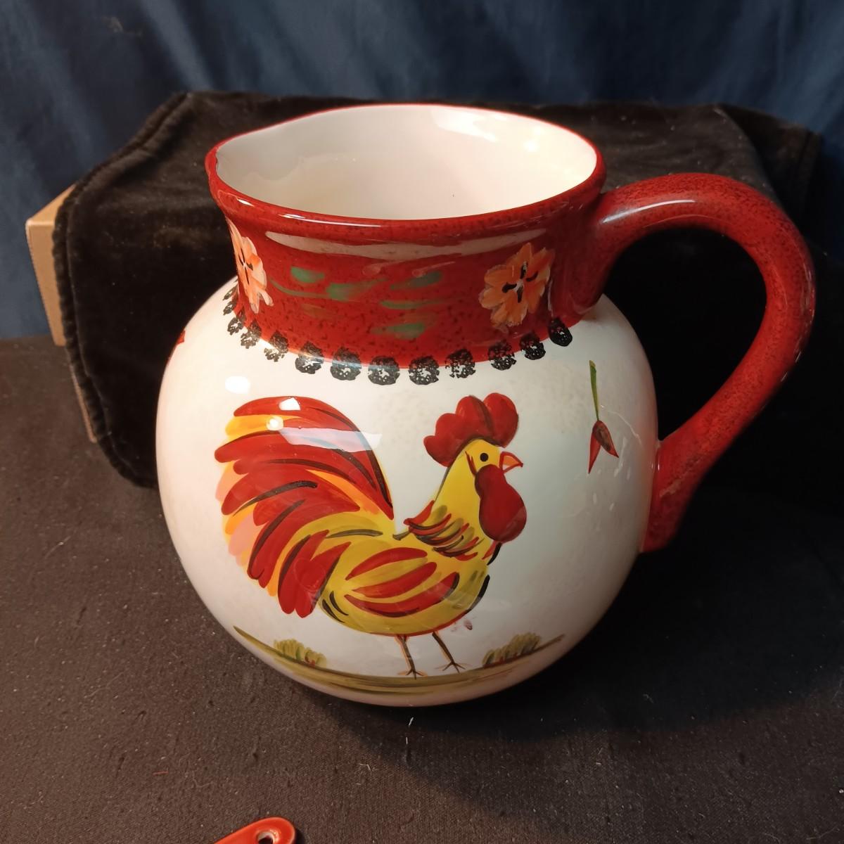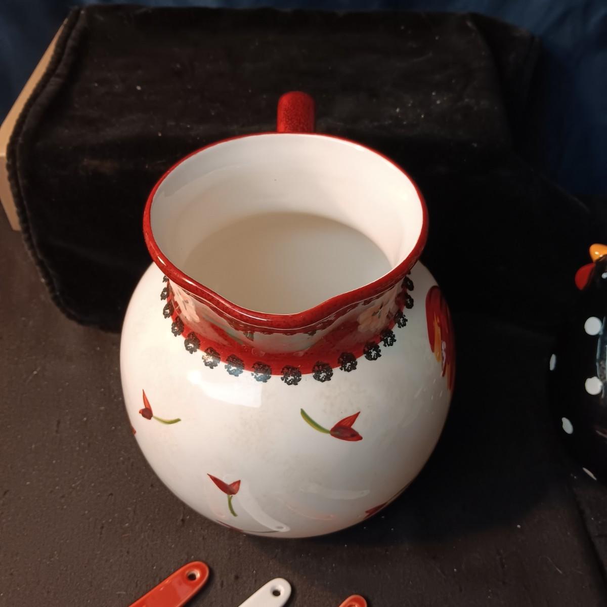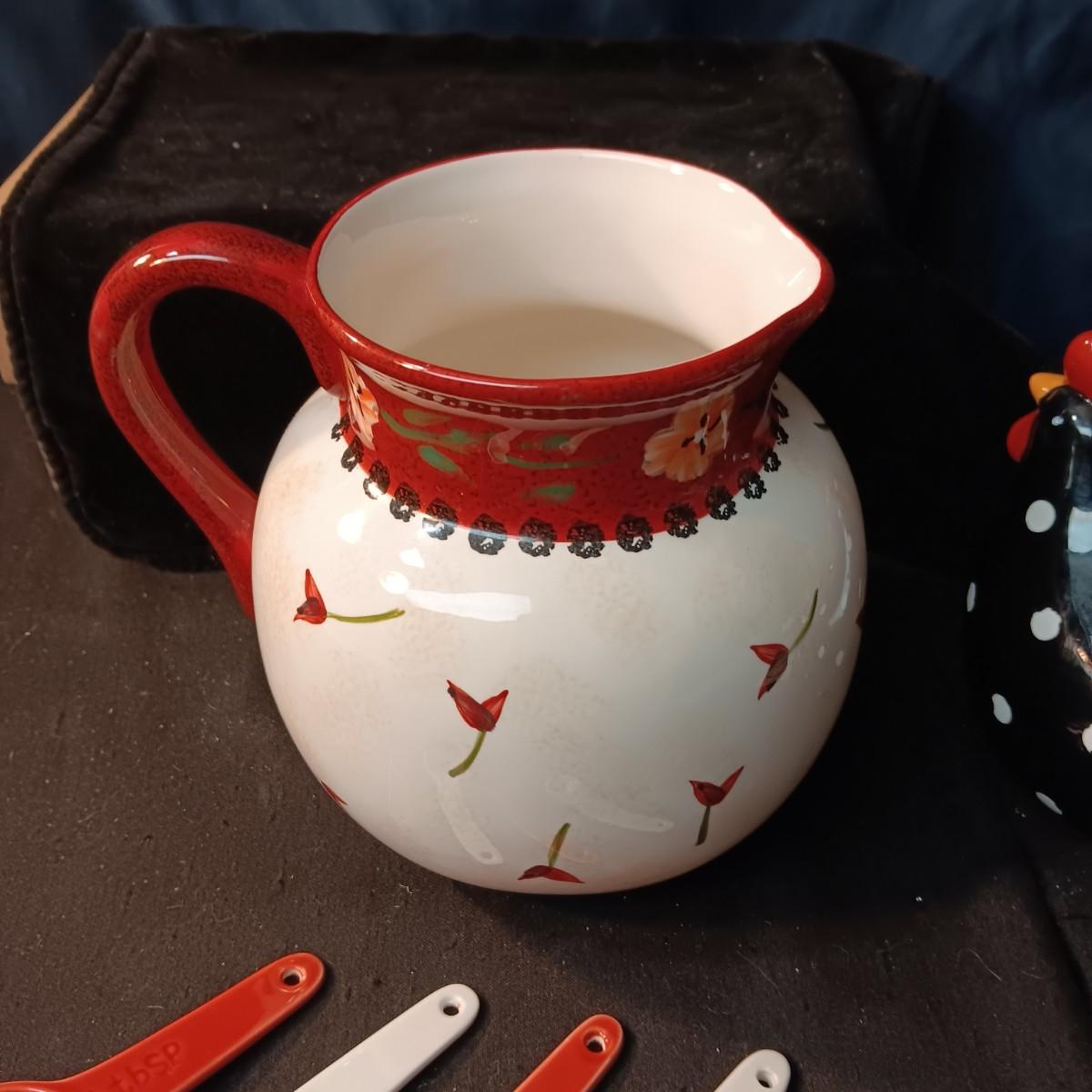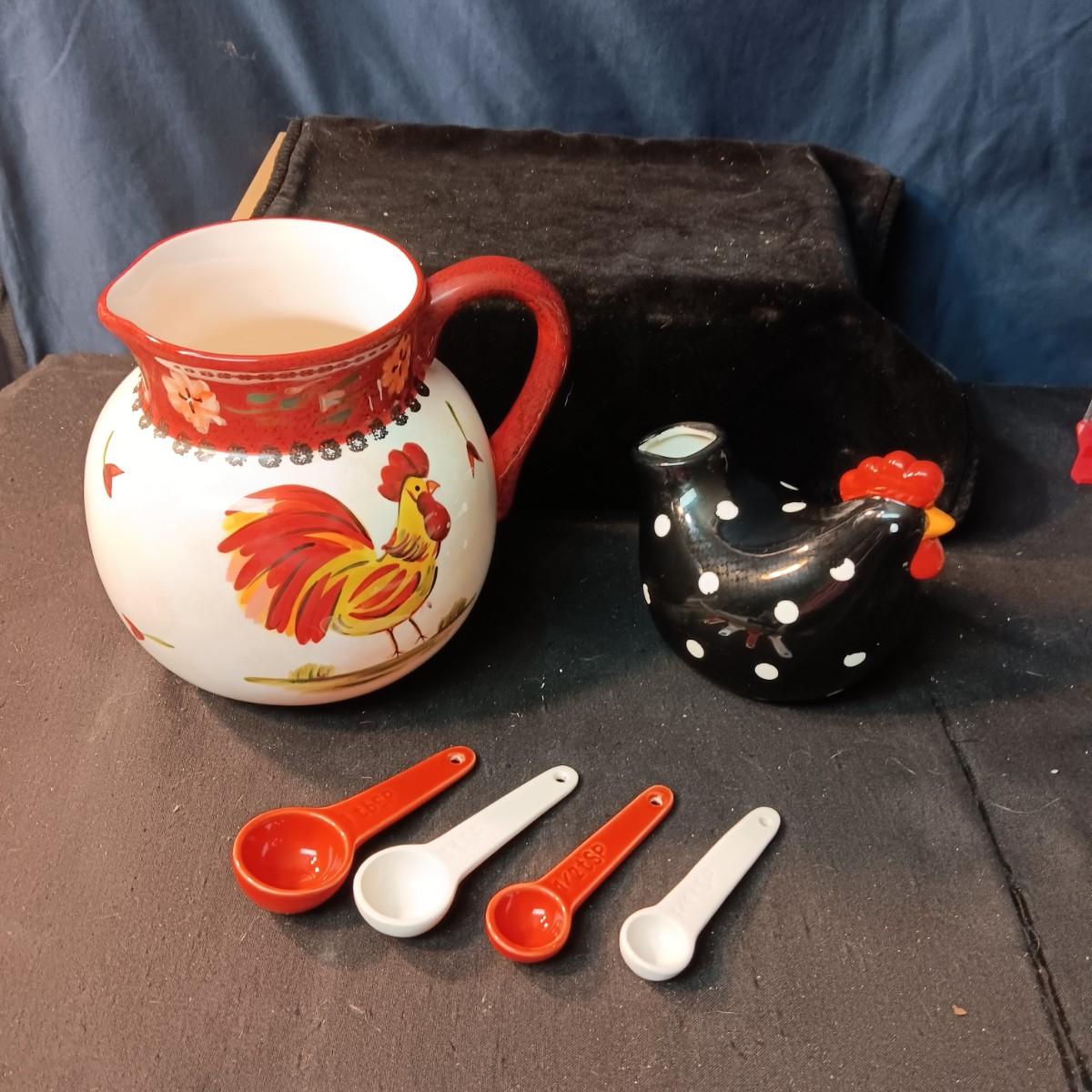 CERAMIC ROOSTER PITCHER, MEASURING SPOONS AND CREAMER