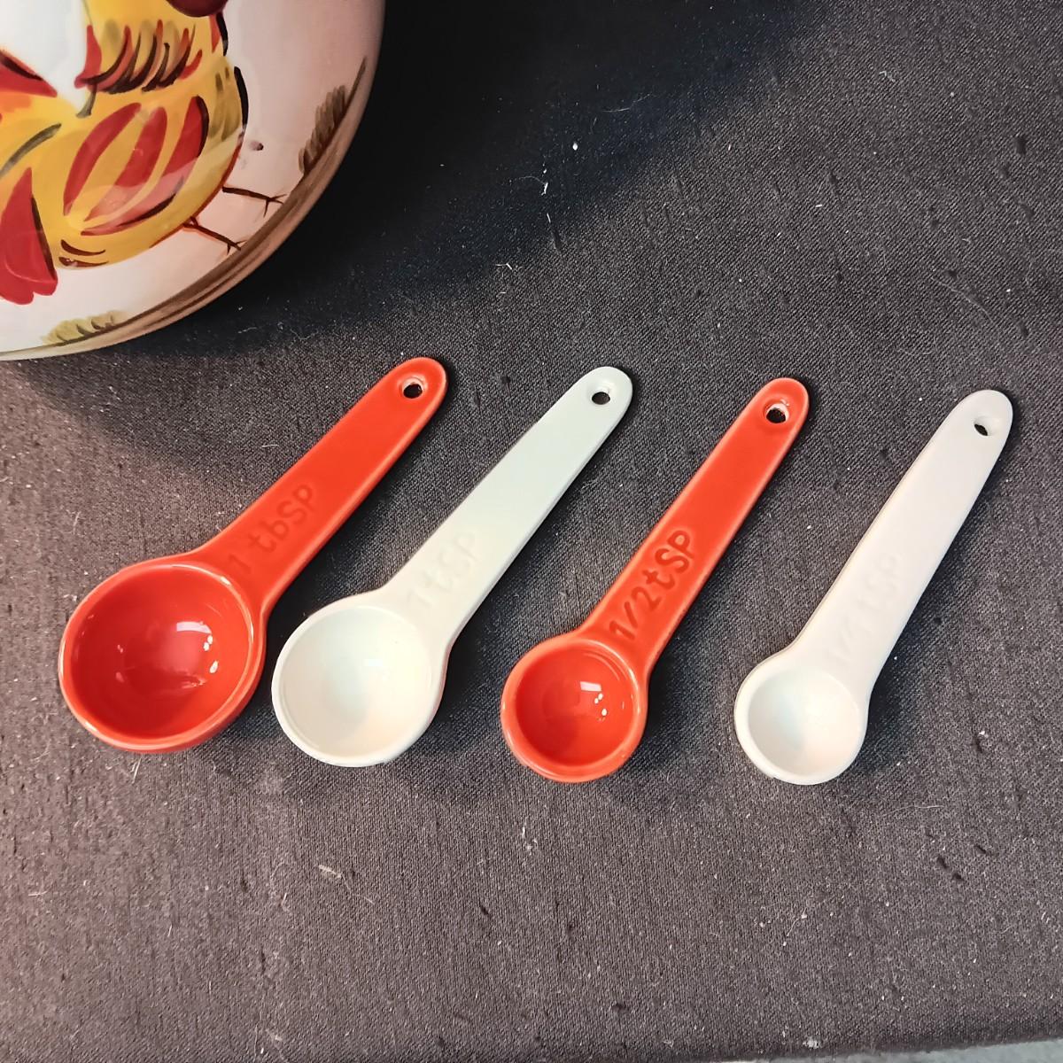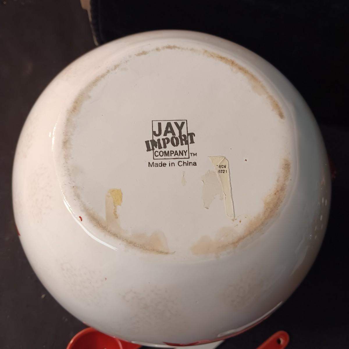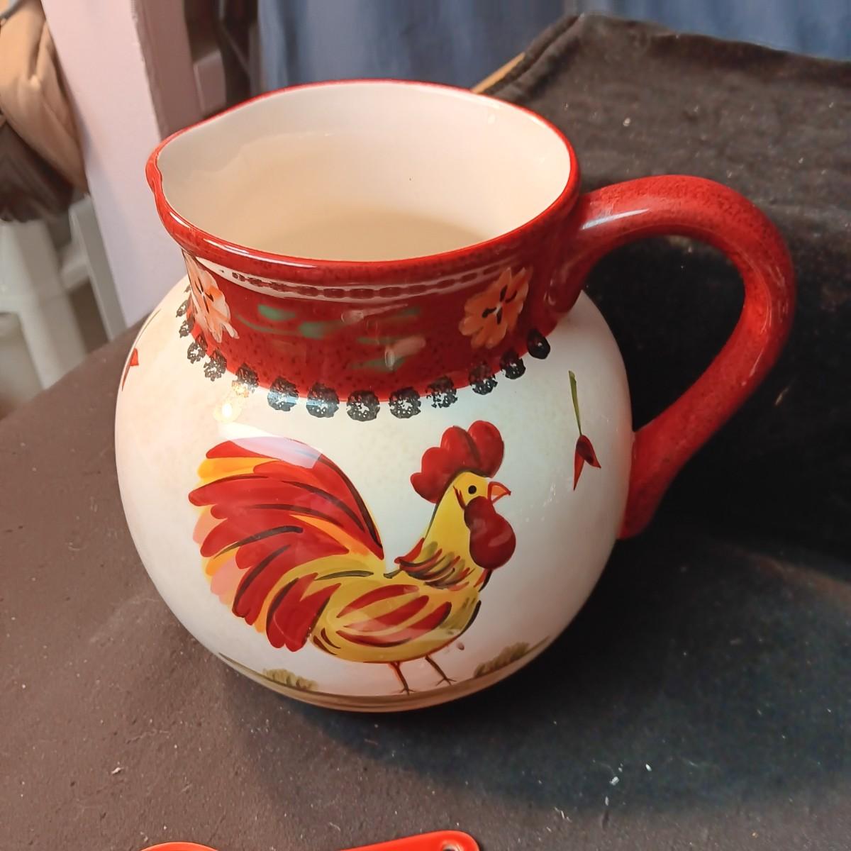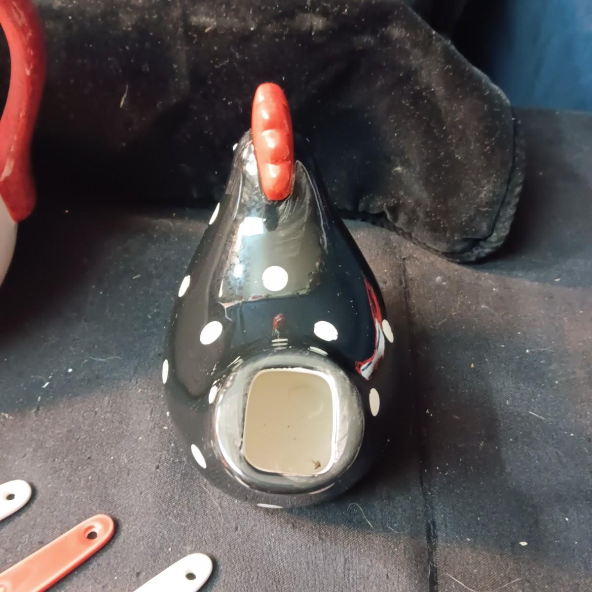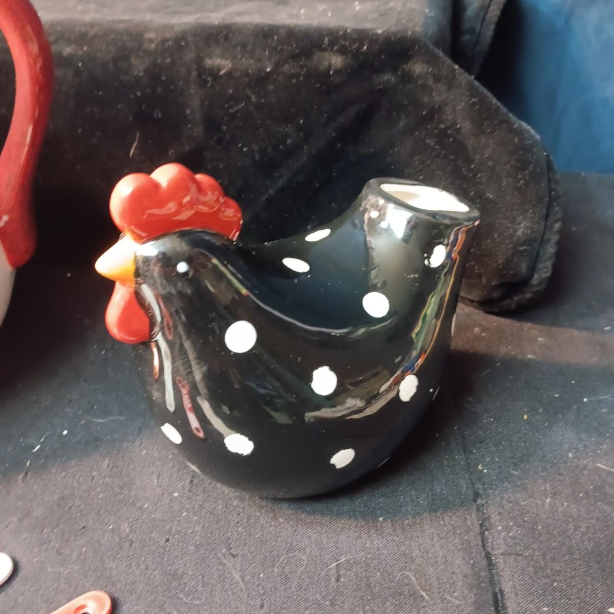 CERAMIC ROOSTER PITCHER, MEASURING SPOONS AND CREAMER