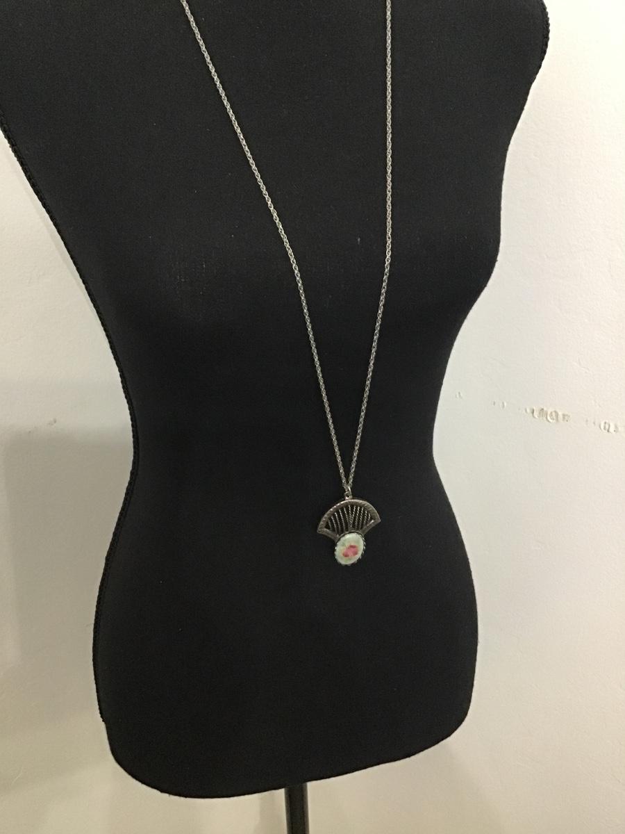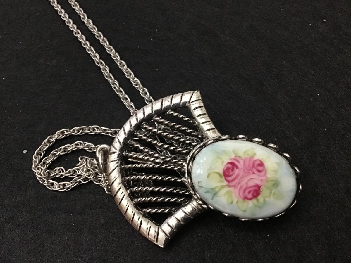 Ceramic Rose Brooch Pendant Necklace with Chain Vintage
