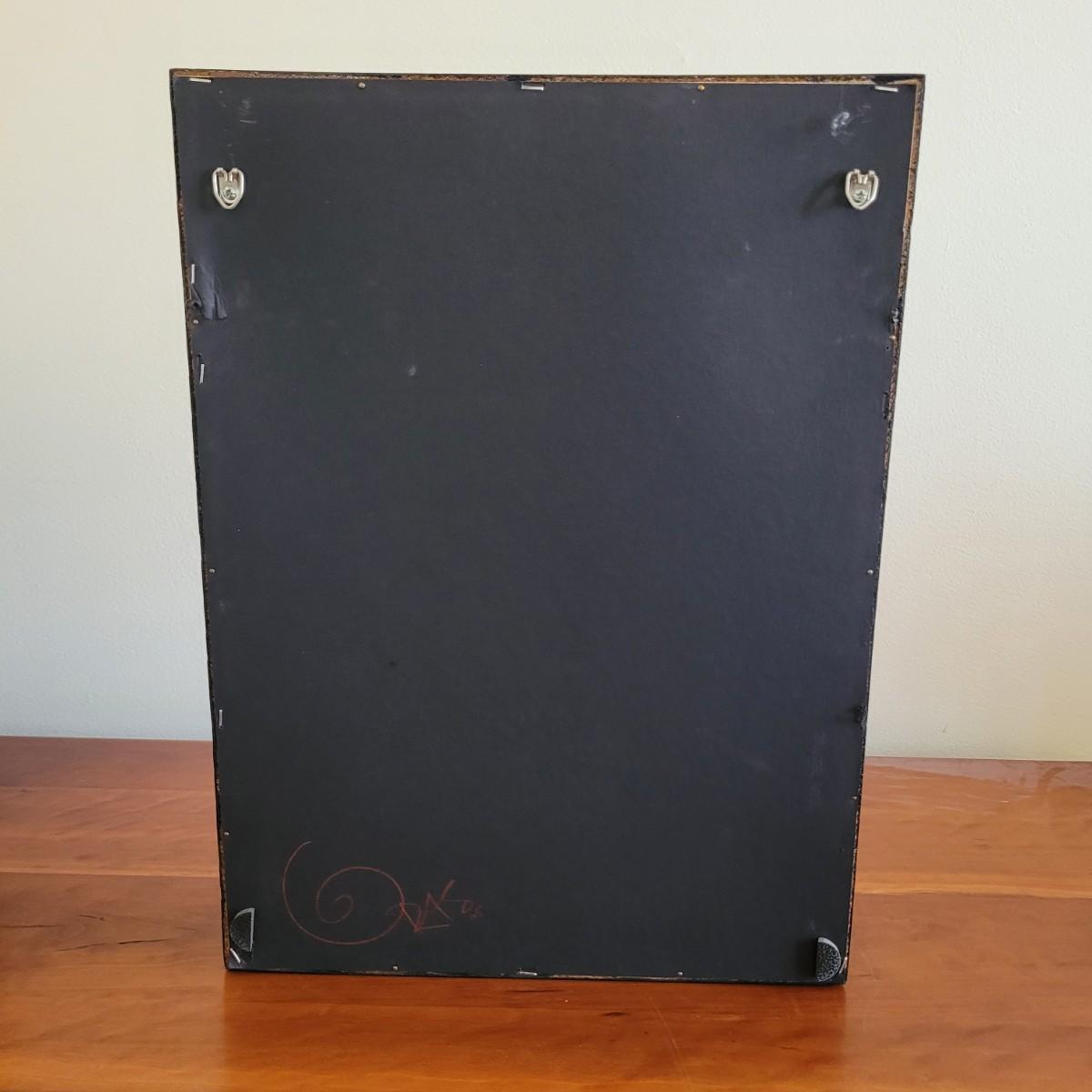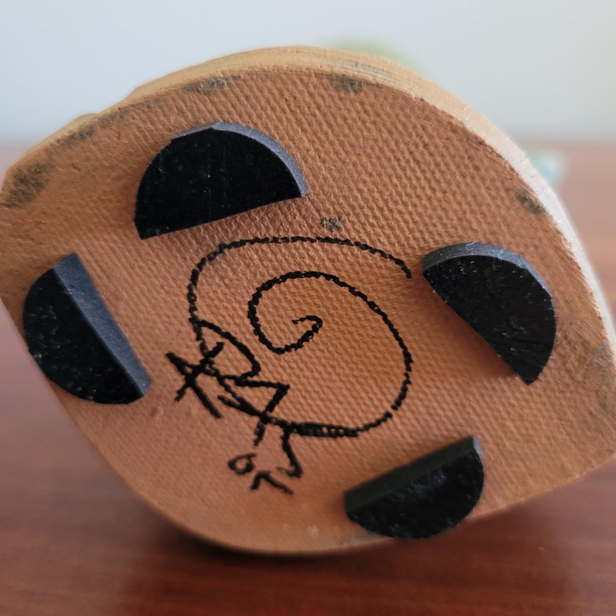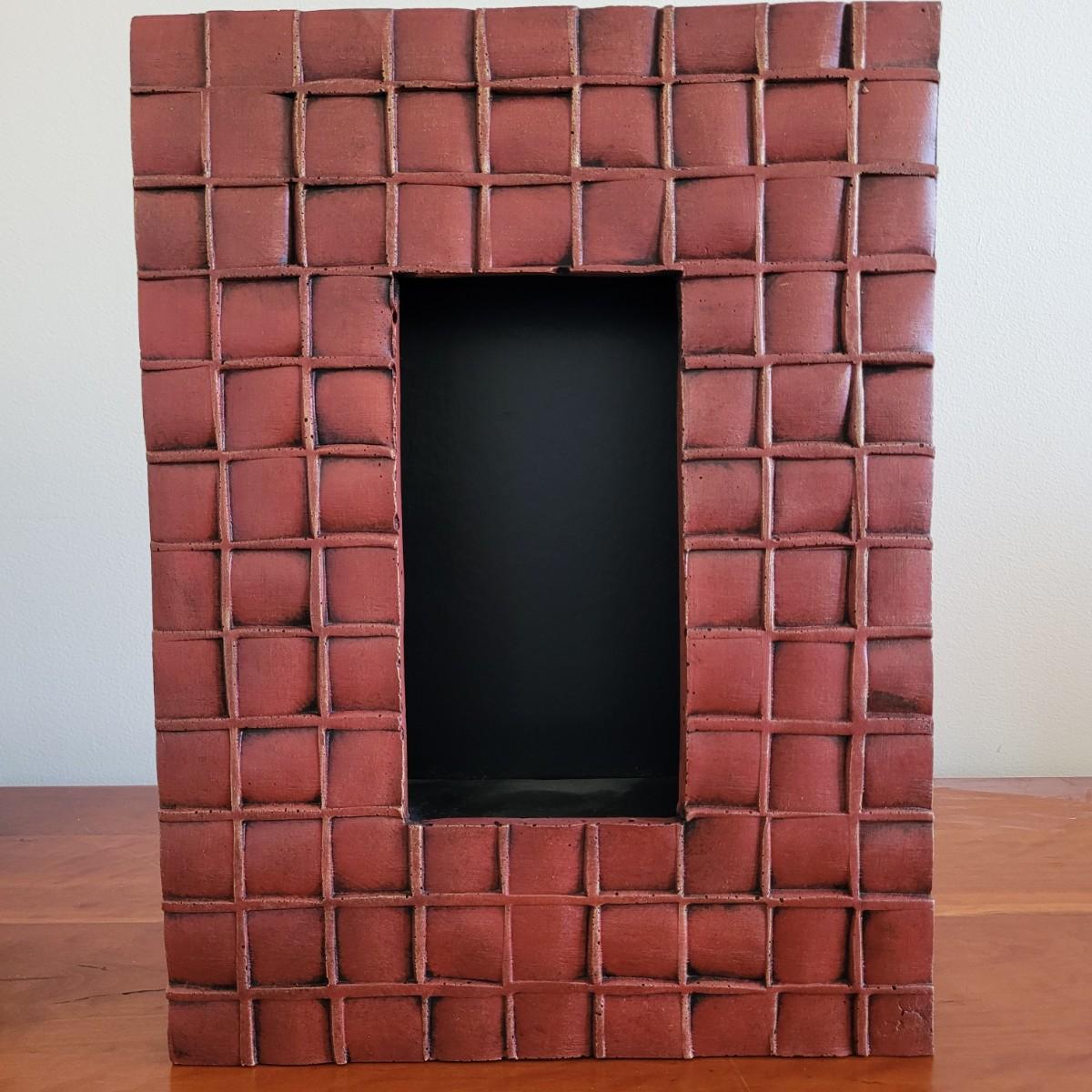 This lot includes an original ceramic sculpture in a hand made wooden shadowbox. The sculpture is green and gold and resembles a pitcher. It is signed "RAS" with a spiral and dated '05 on the bottom. The box is made from wood and is painted maroon on the front and black on the sides. It is also signed "RAS" with a spiral and dated '05 on the backside. The box measures 15" x 4" x 20"H and is designed to be mounted on the wall.