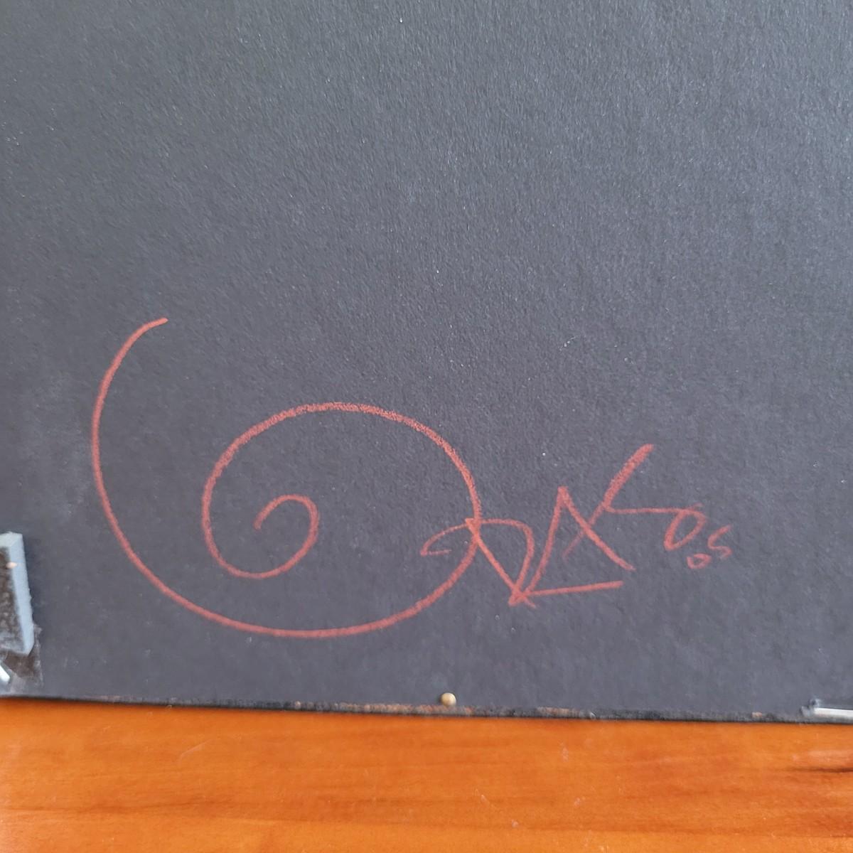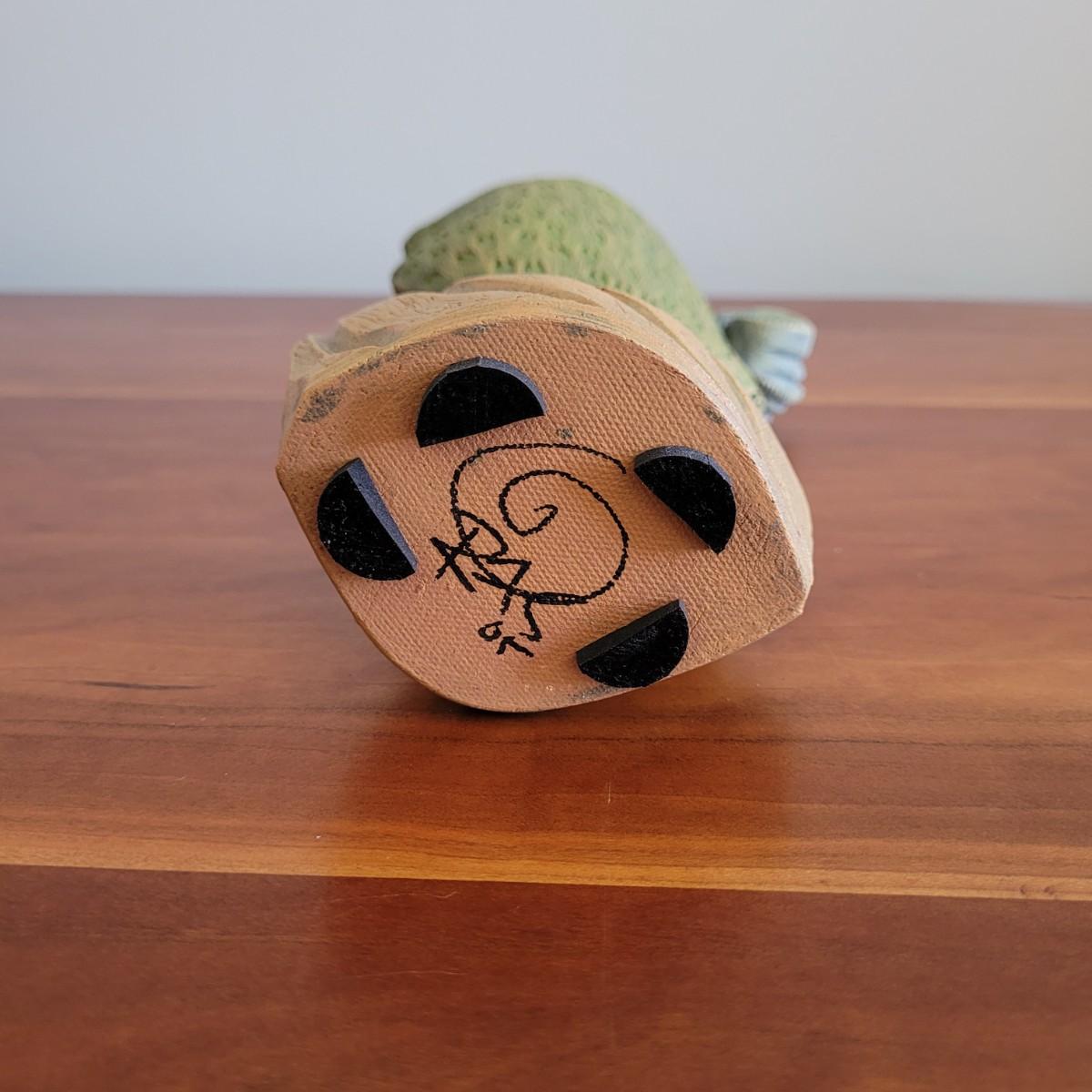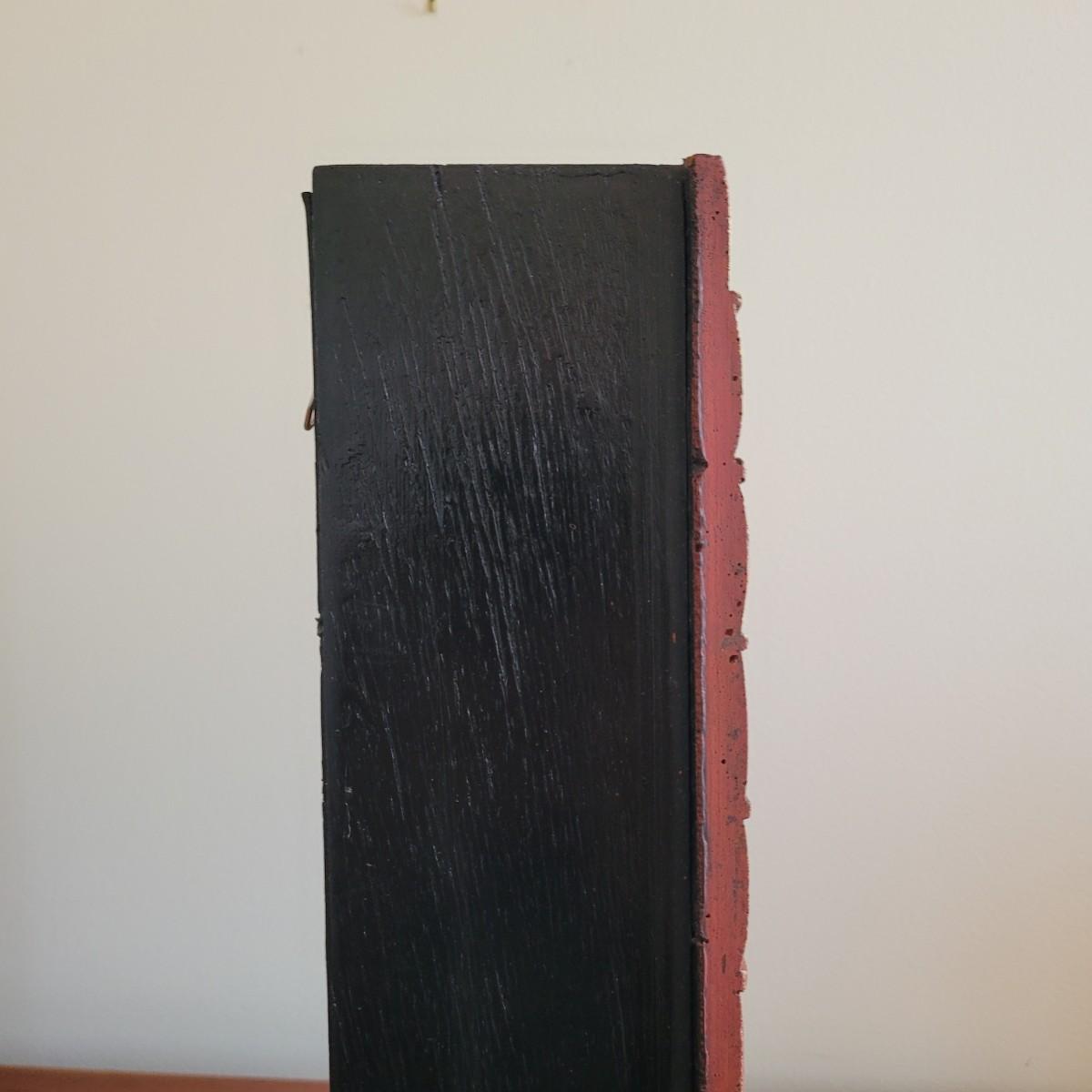 This lot includes an original ceramic sculpture in a hand made wooden shadowbox. The sculpture is green and gold and resembles a pitcher. It is signed "RAS" with a spiral and dated '05 on the bottom. The box is made from wood and is painted maroon on the front and black on the sides. It is also signed "RAS" with a spiral and dated '05 on the backside. The box measures 15" x 4" x 20"H and is designed to be mounted on the wall.