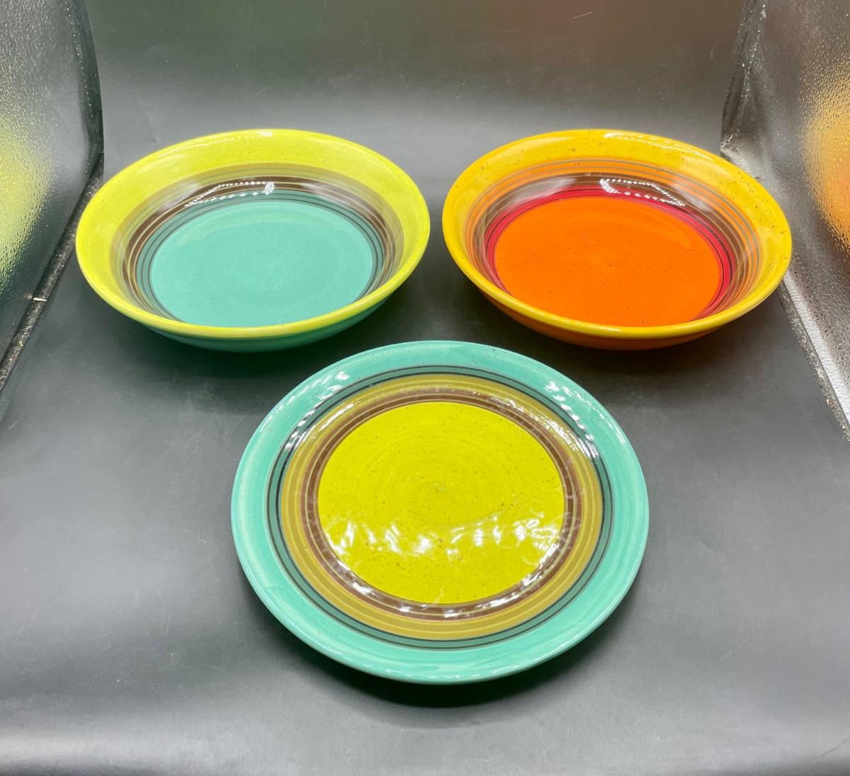 By Certified International. Dishwasher and microwave safe. 2 multi-color bowls and 1 multi-color platter. All in new condition, bowls are 9.5” across and the platter is 8.75” across.