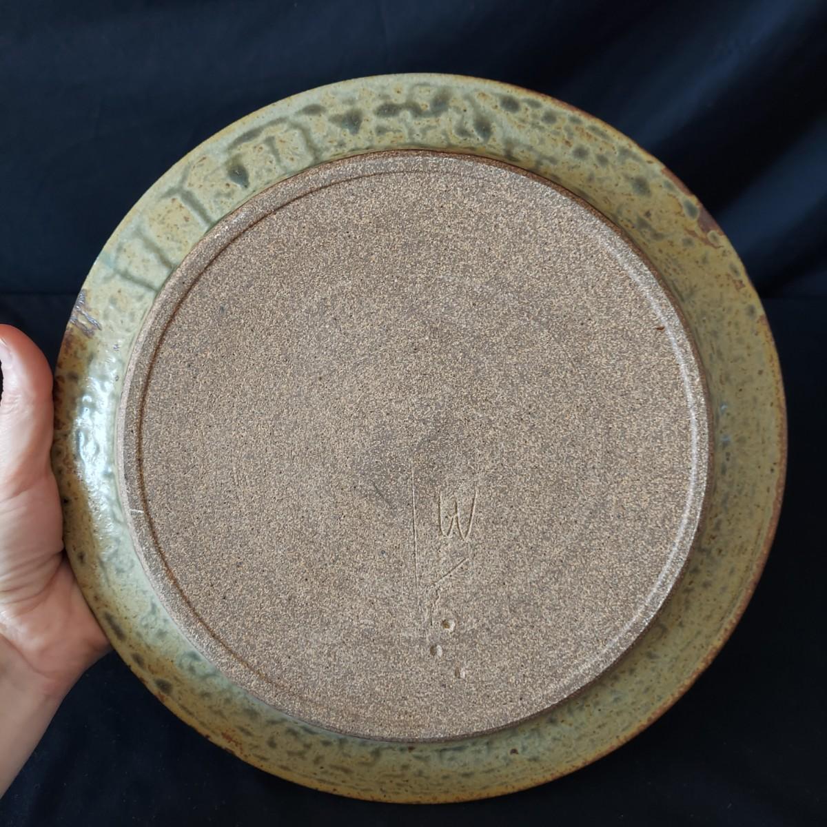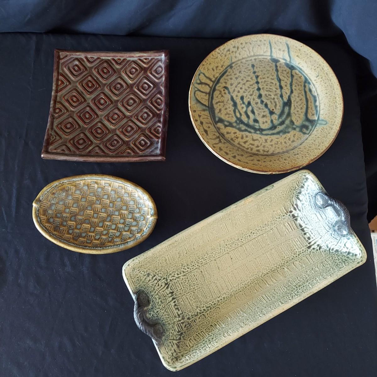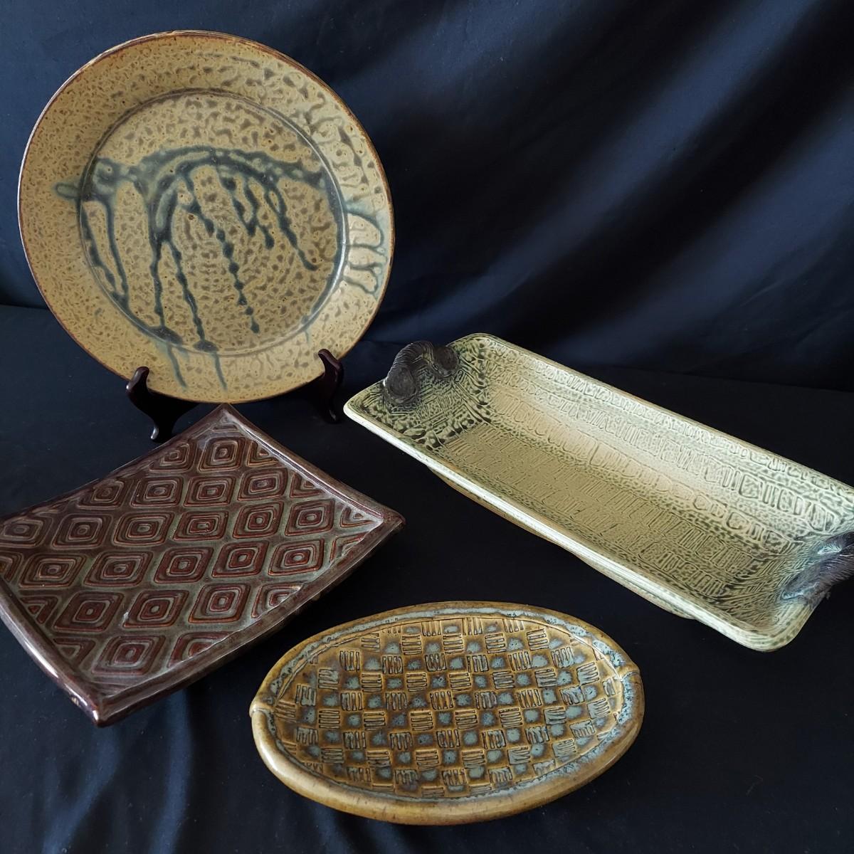 Three ceramic platters and a rectangular dish. The round plate measures 11"D across. The large dish measures approximately 14” x 7” x 3"H. Two pieces appear to have signatures on the bottom. Please see photos for details. Shipping available