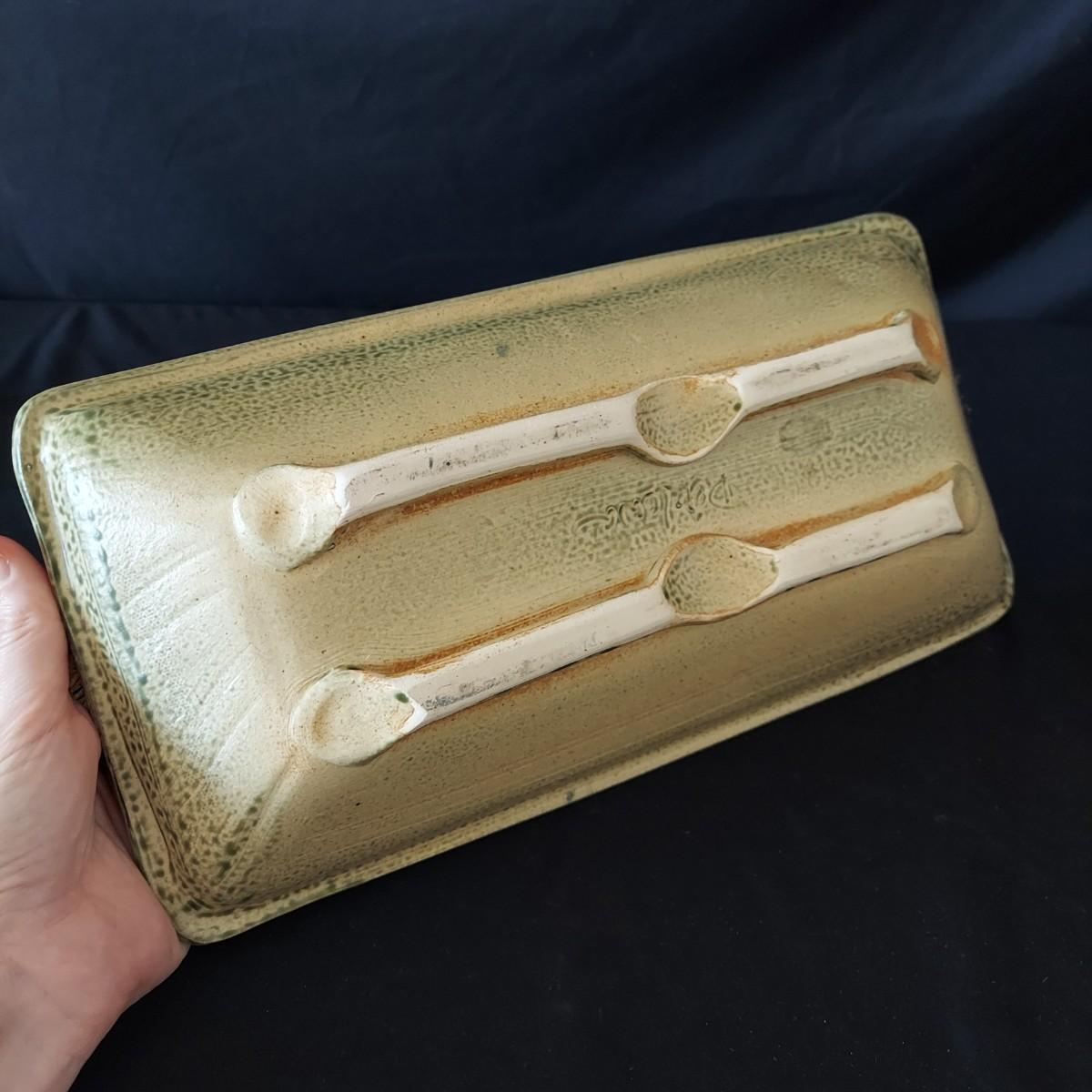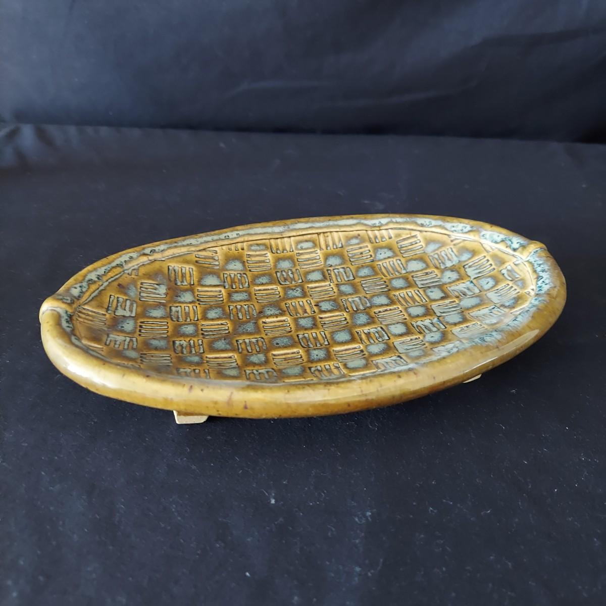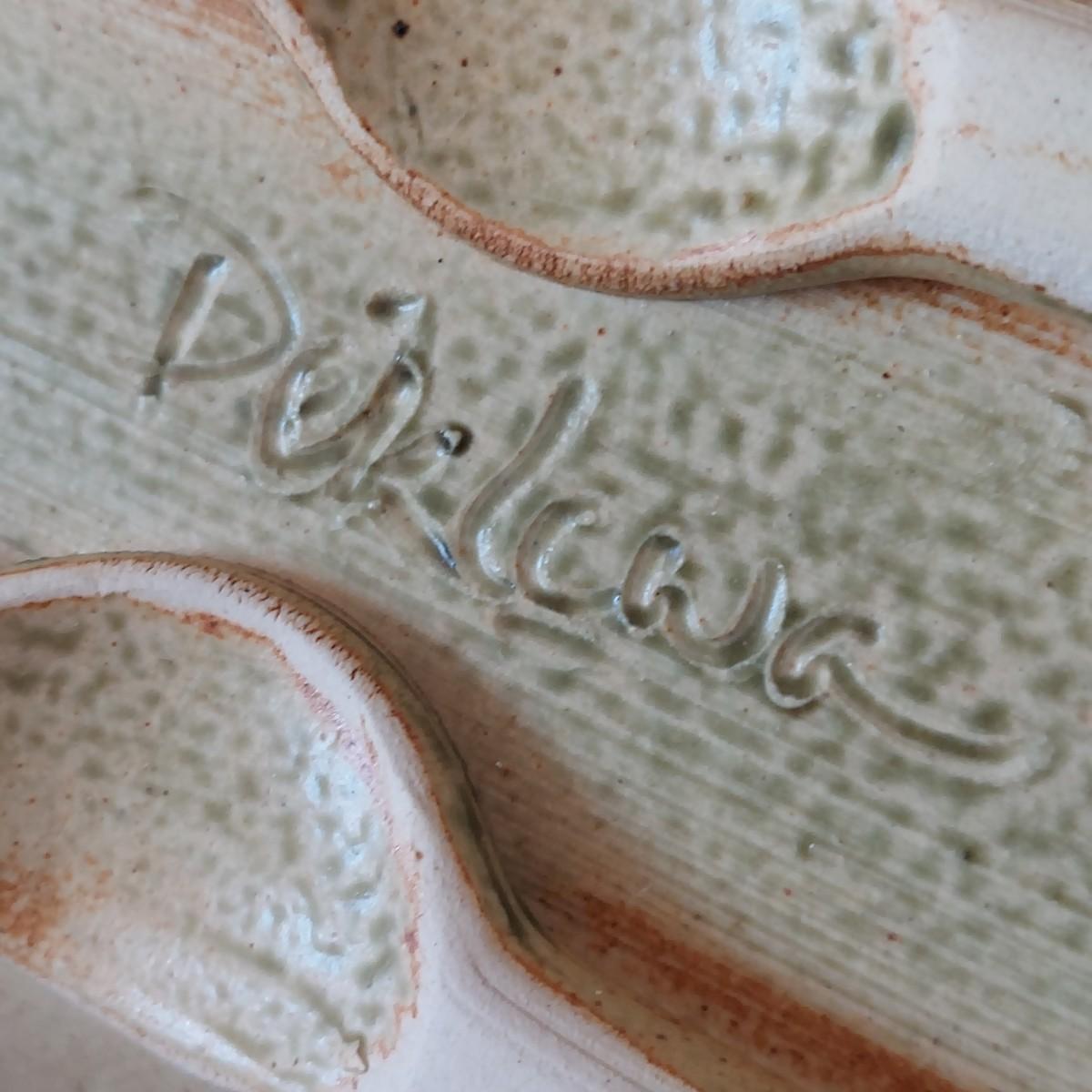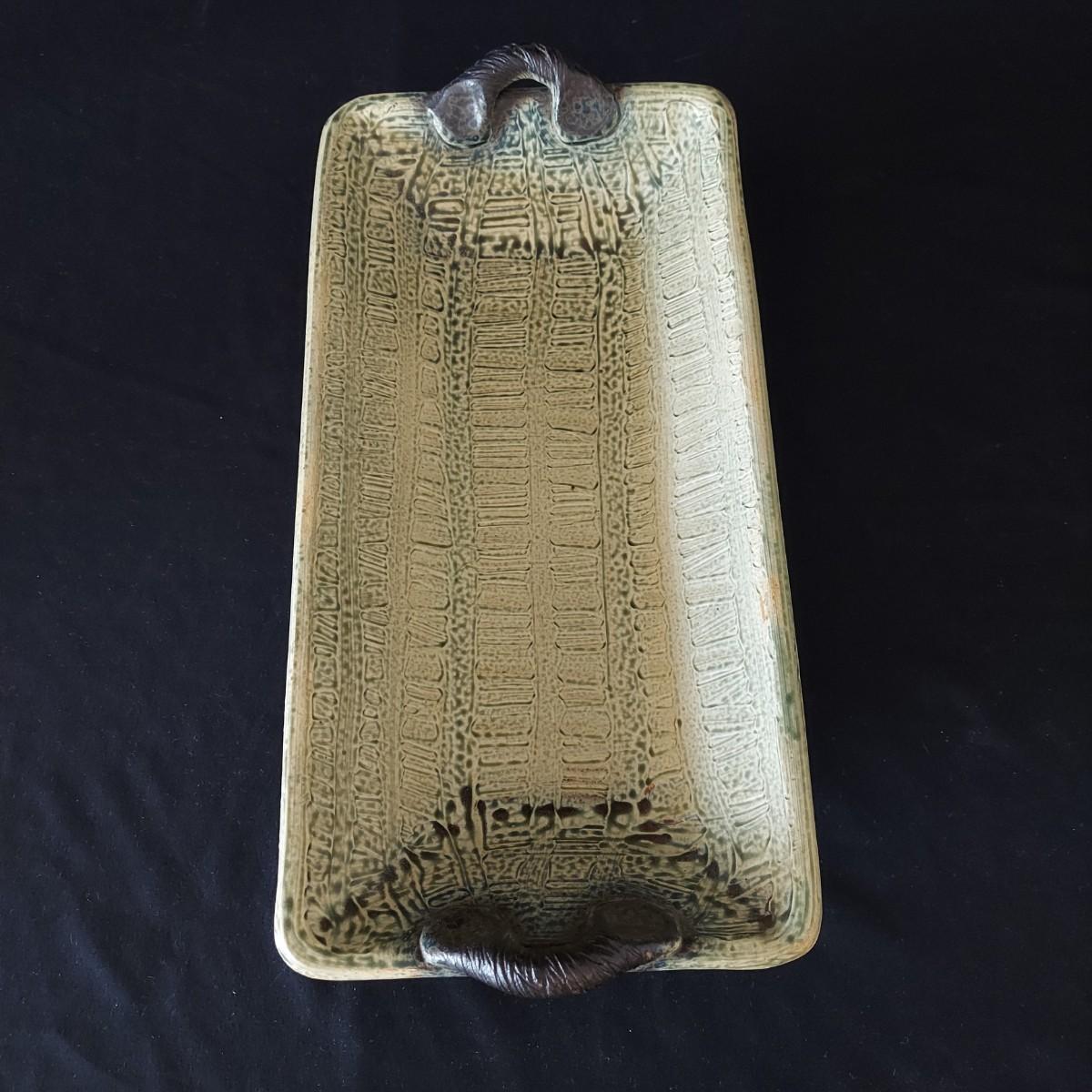 Three ceramic platters and a rectangular dish. The round plate measures 11"D across. The large dish measures approximately 14” x 7” x 3"H. Two pieces appear to have signatures on the bottom. Please see photos for details. Shipping available