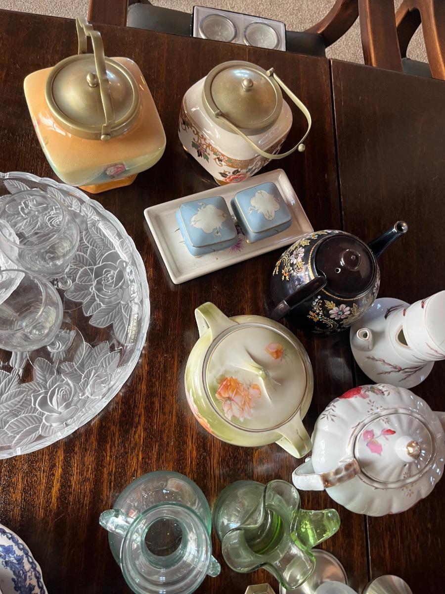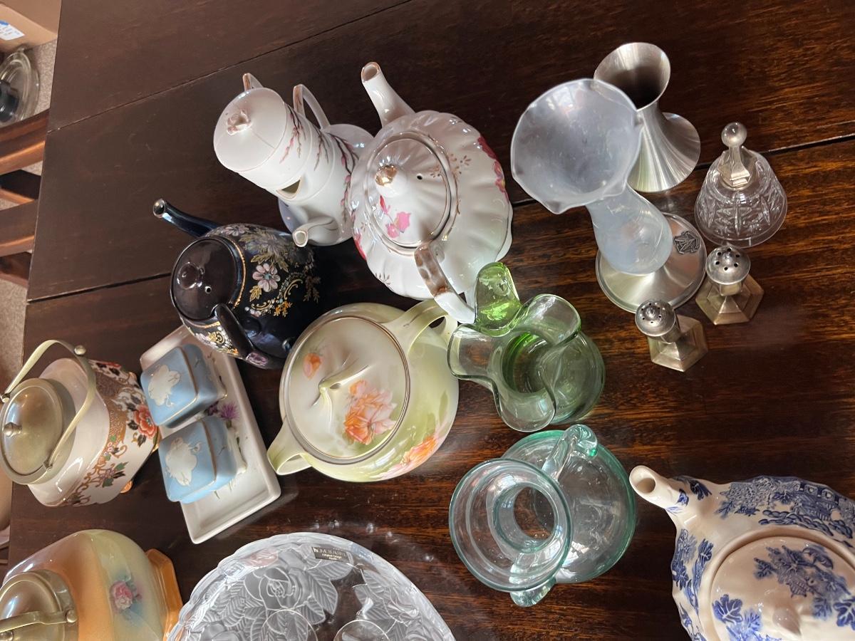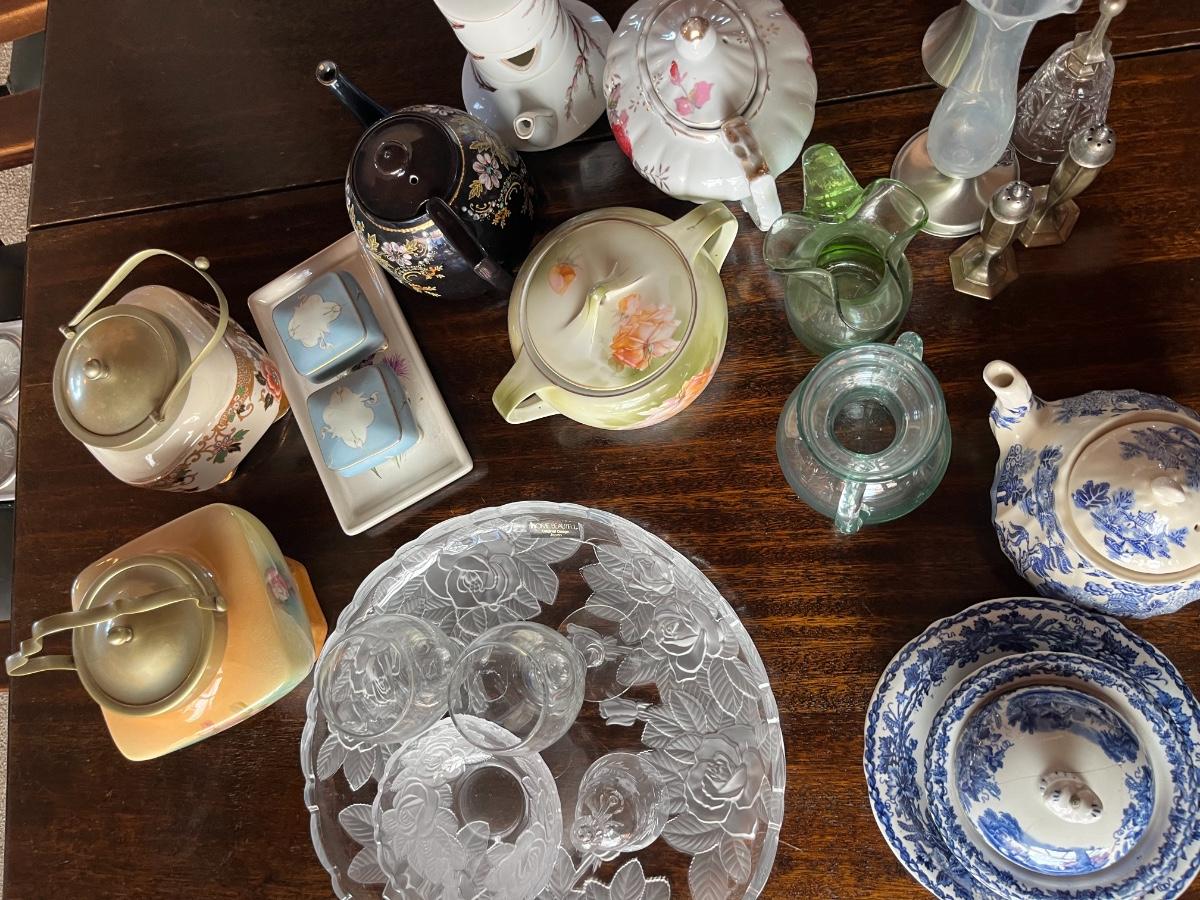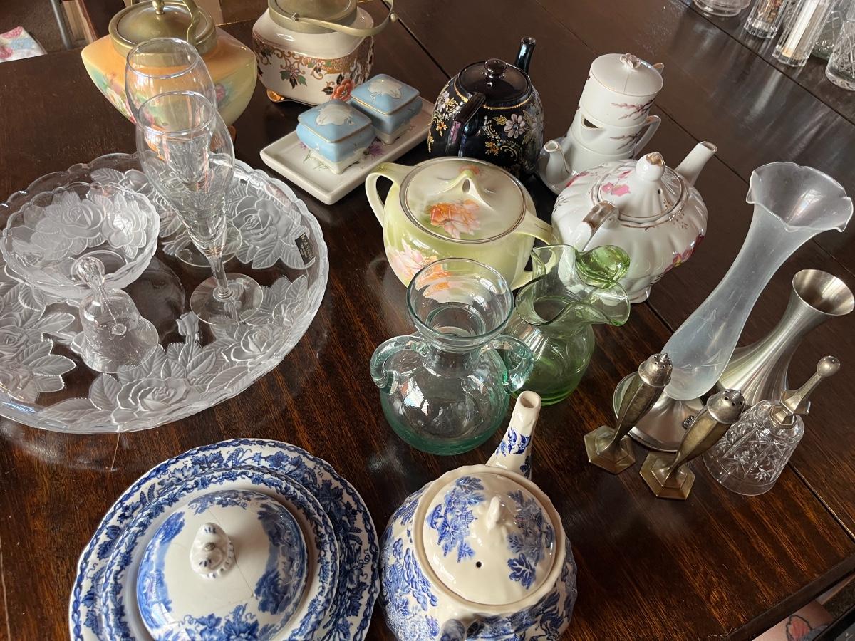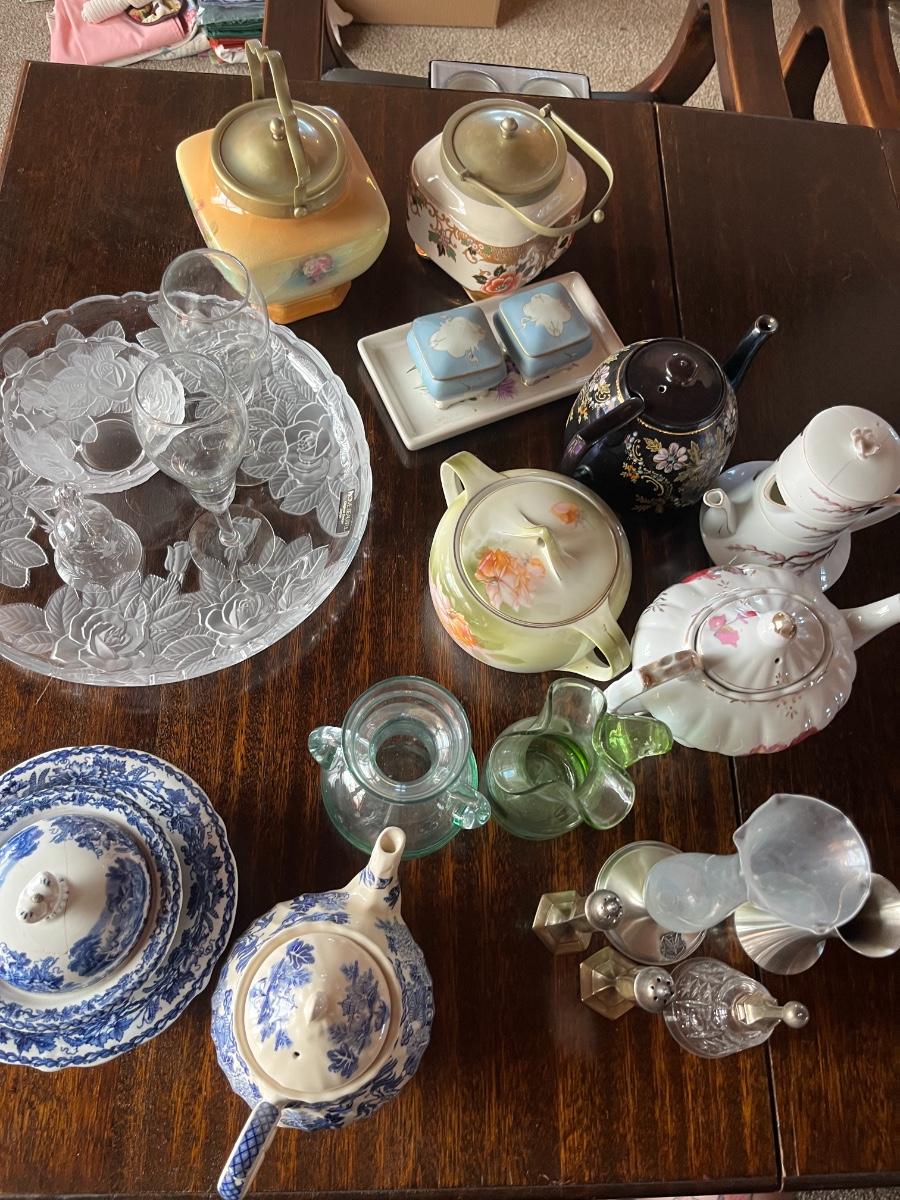 Ceramic teapots and cups and bowls with misc glassware. Some of the ceramics have cracks in the lids as pictured.