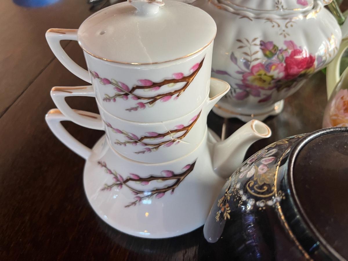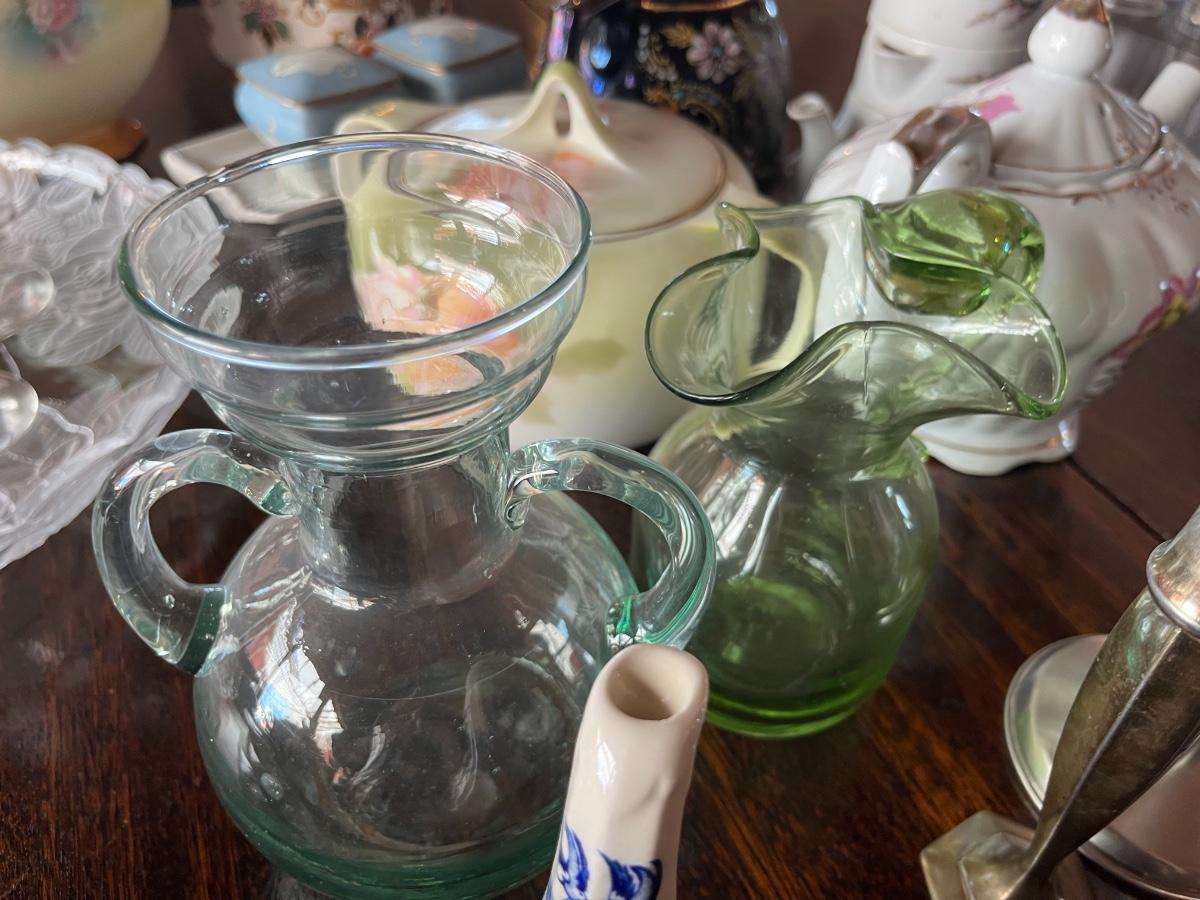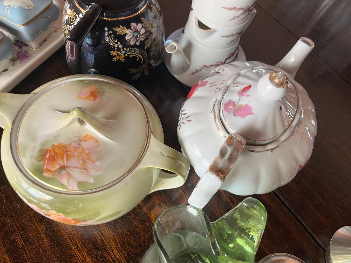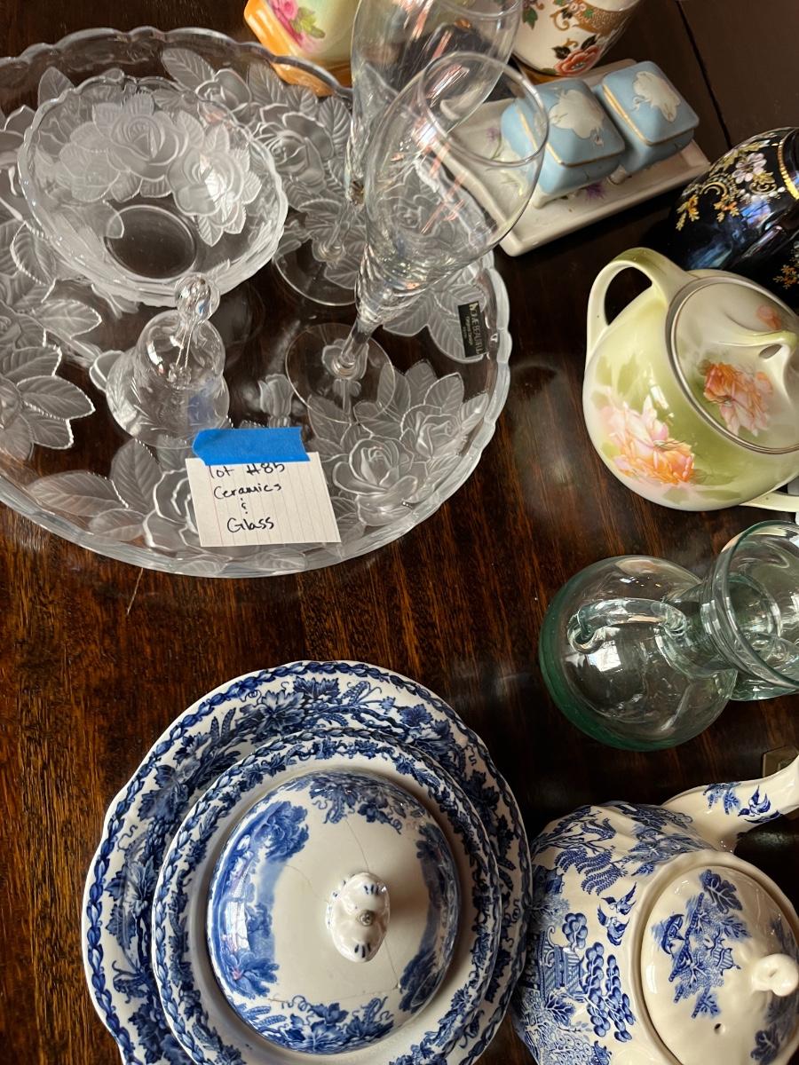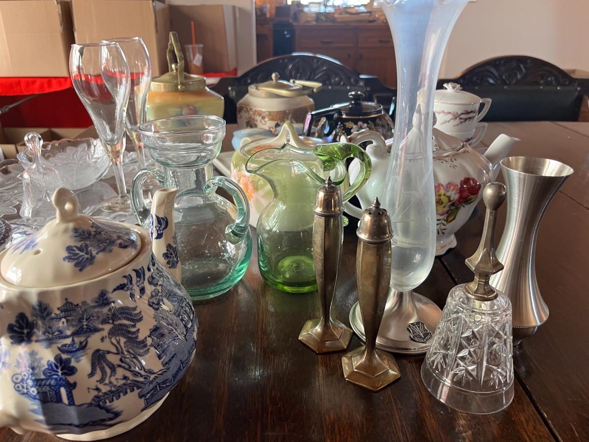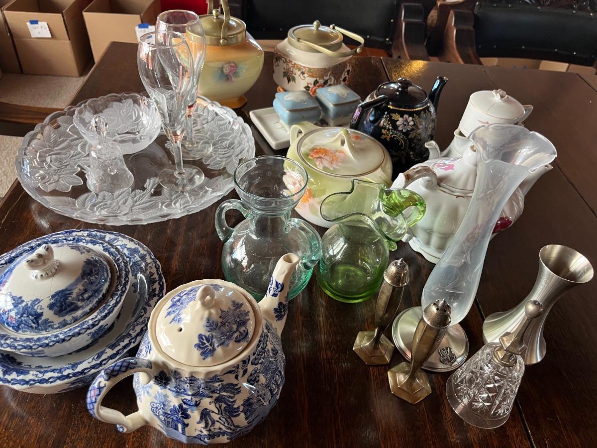 Ceramic teapots and cups and bowls with misc glassware. Some of the ceramics have cracks in the lids as pictured.