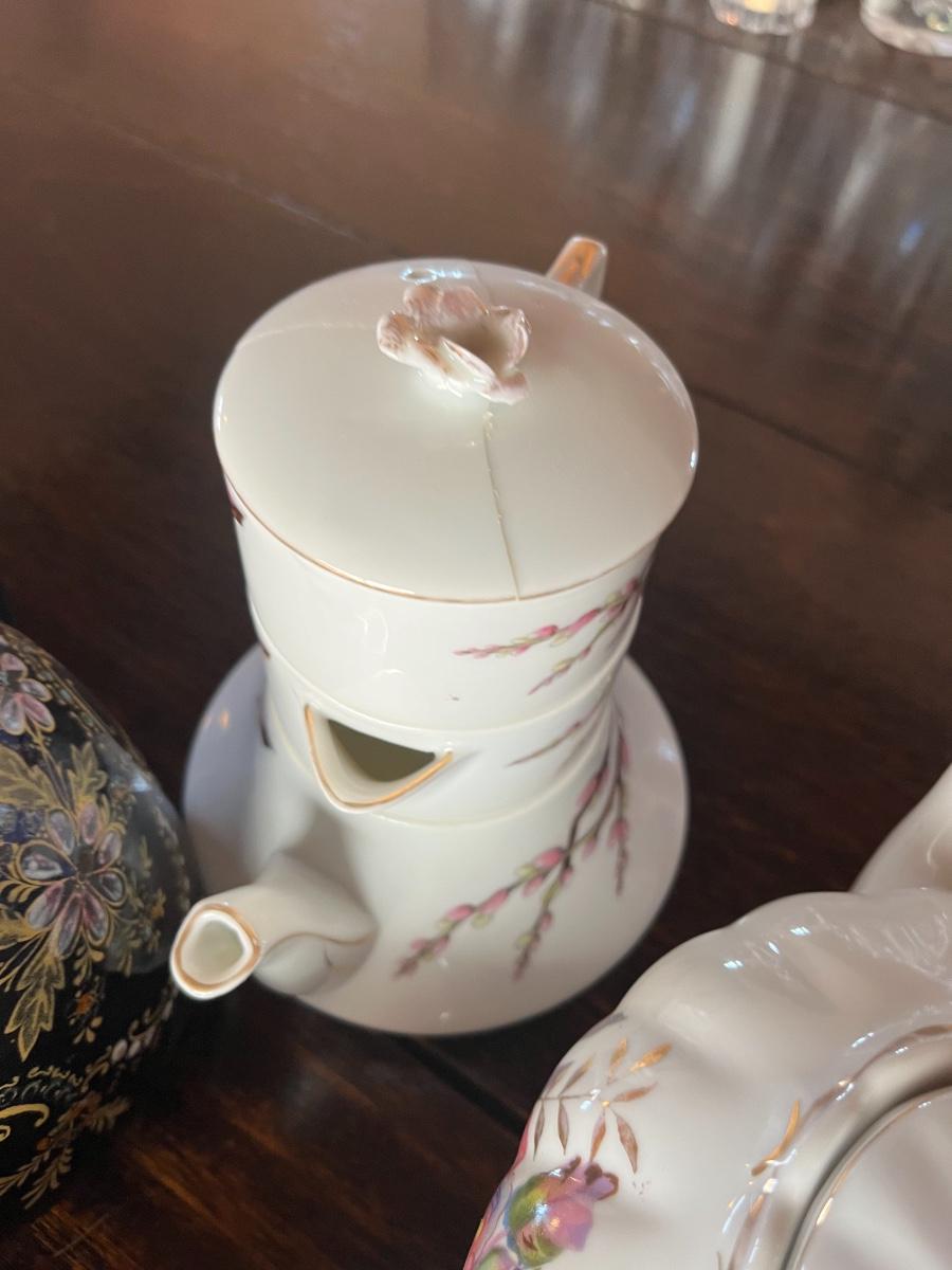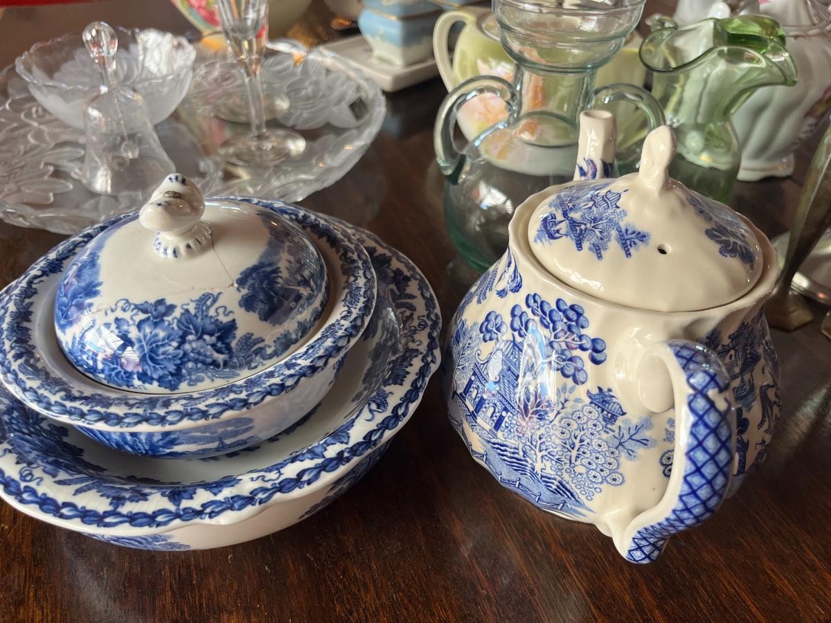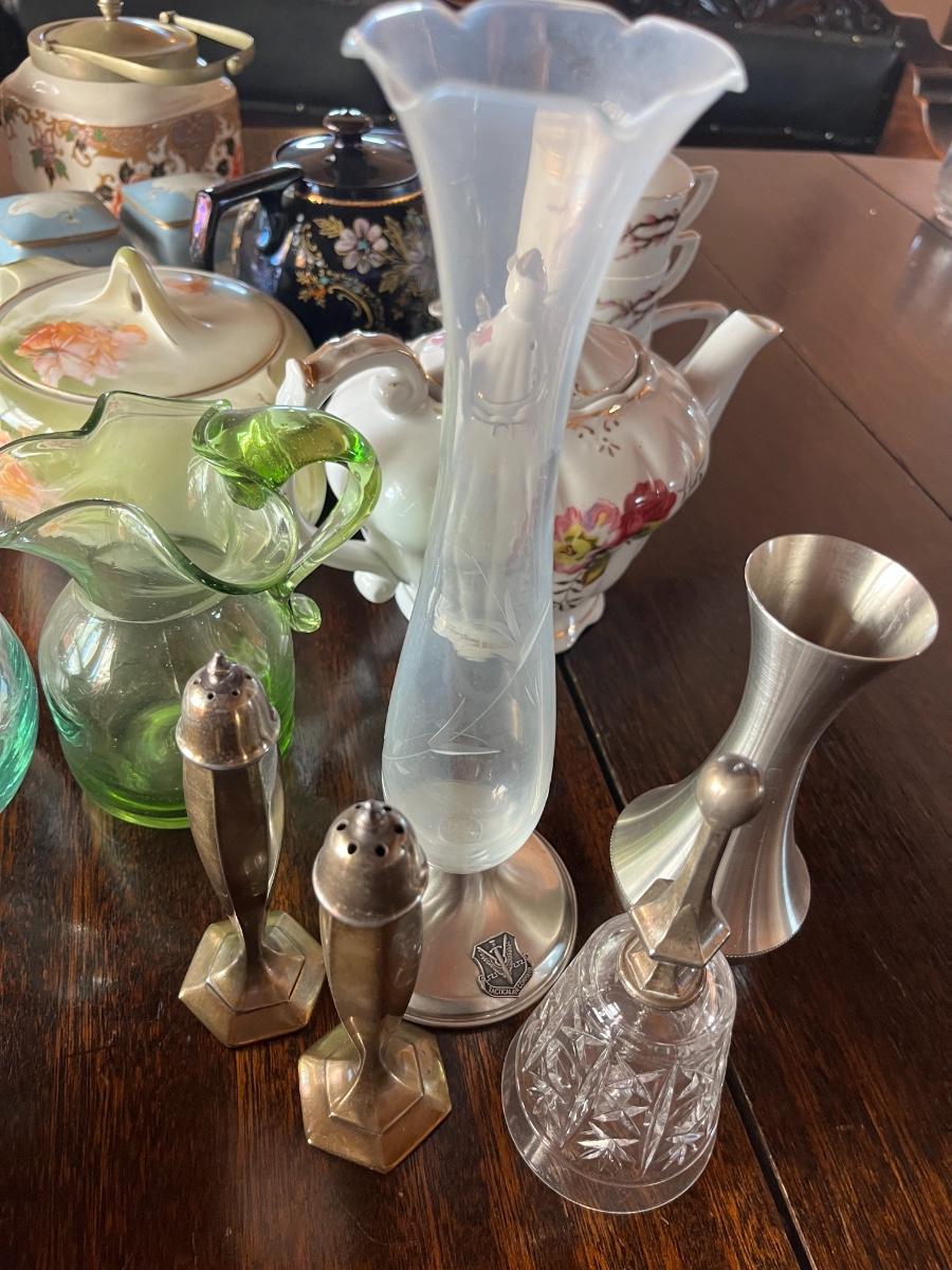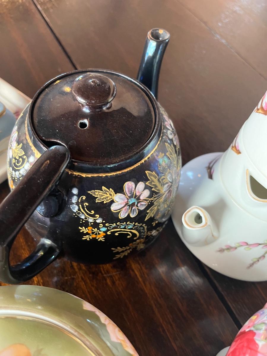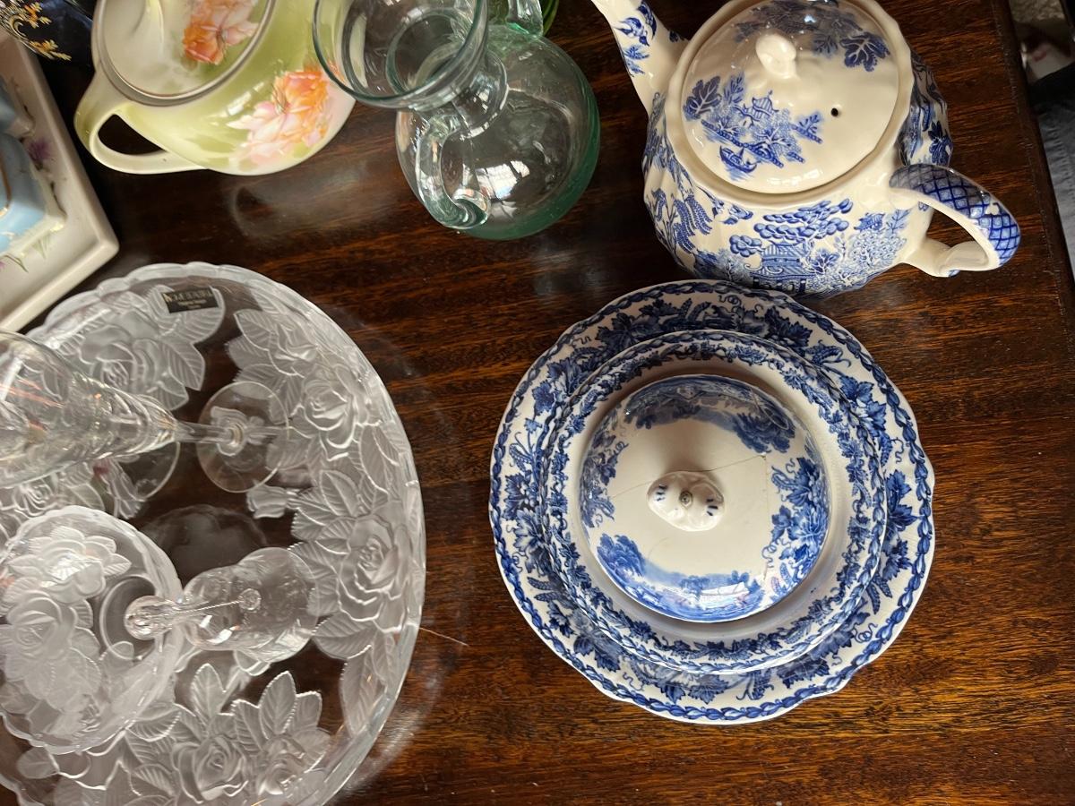 Ceramic teapots and cups and bowls with misc glassware. Some of the ceramics have cracks in the lids as pictured.