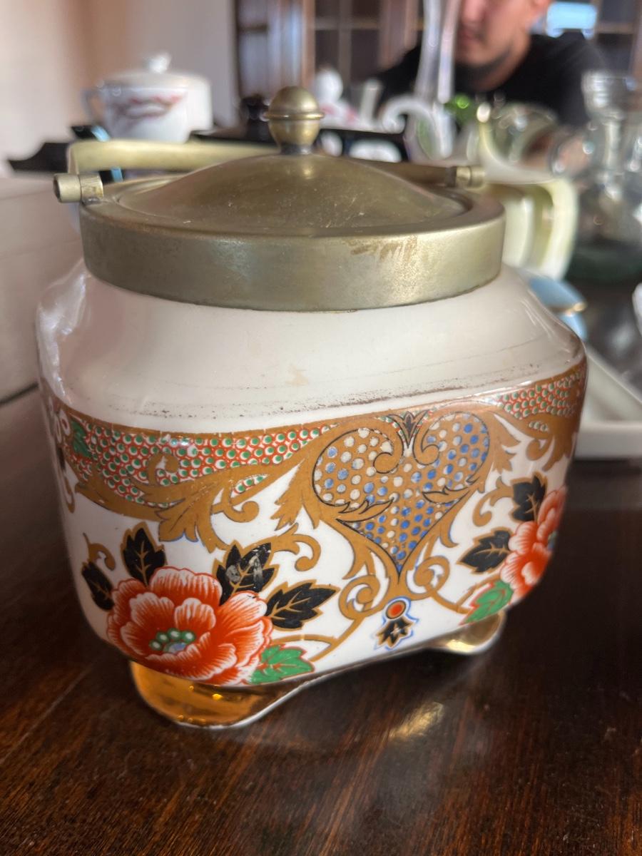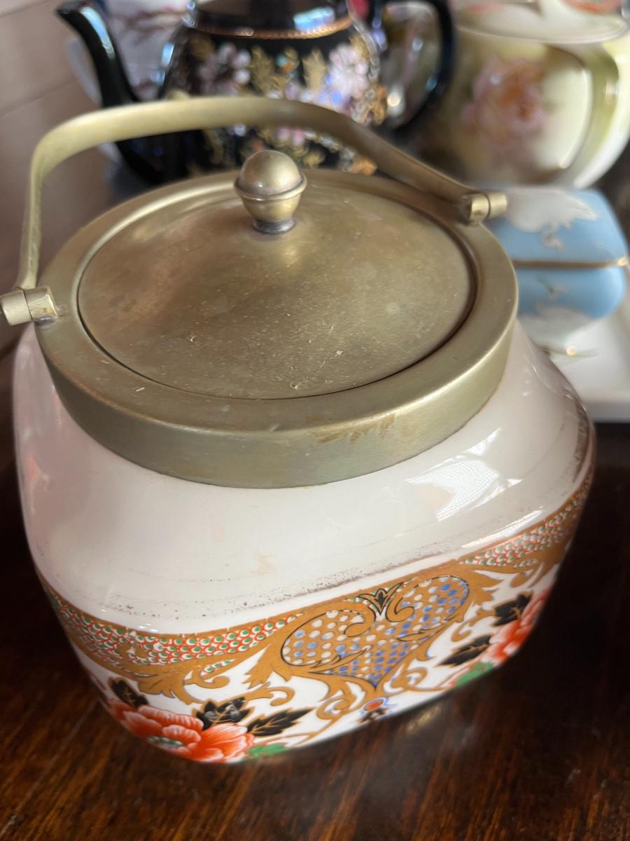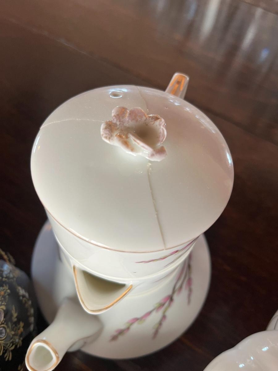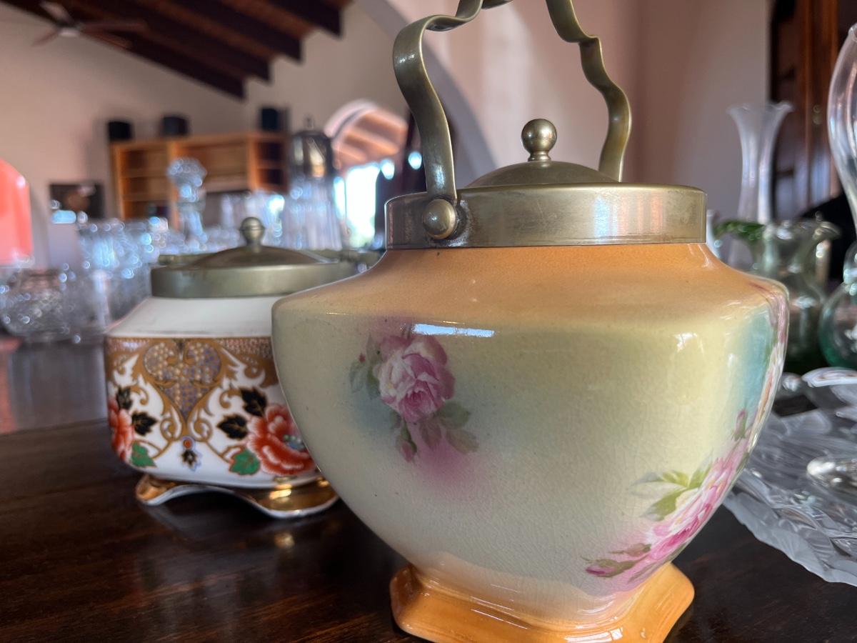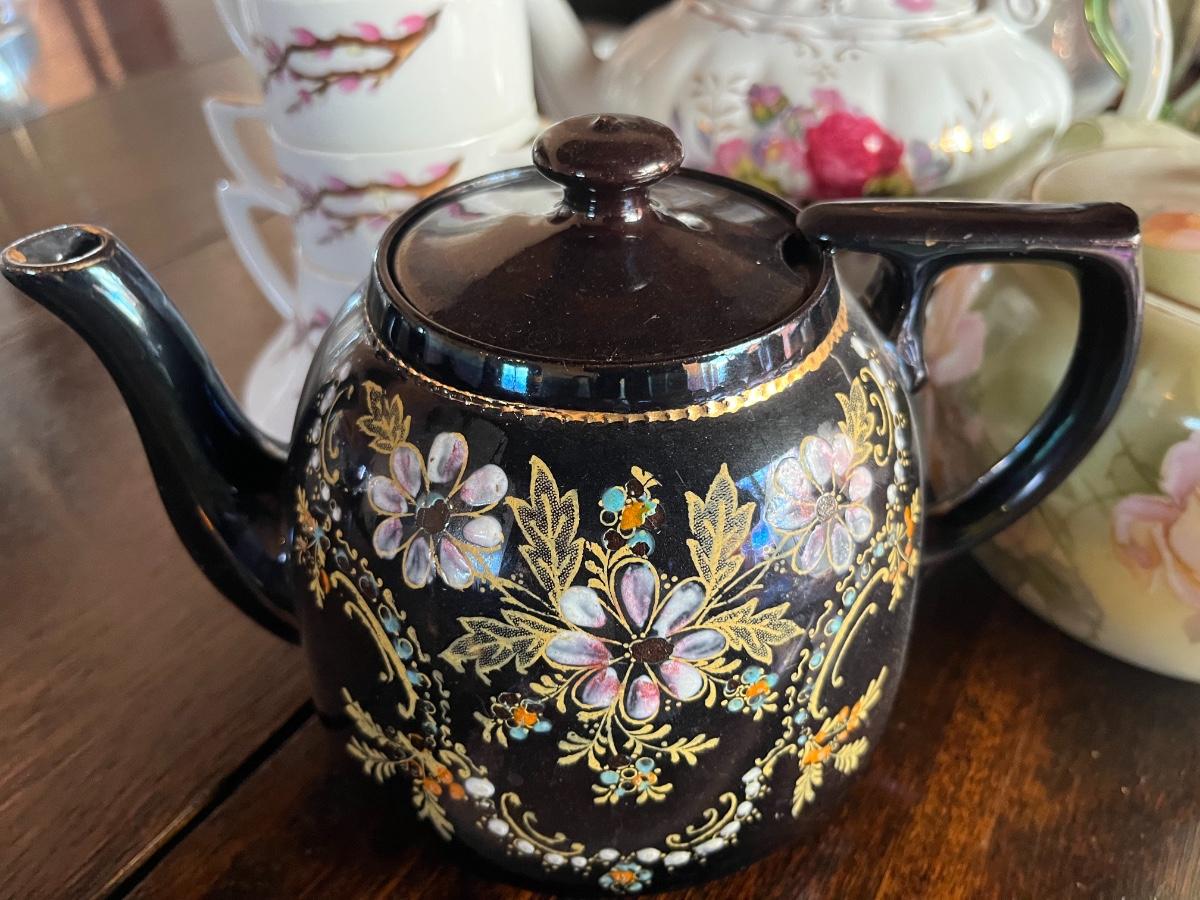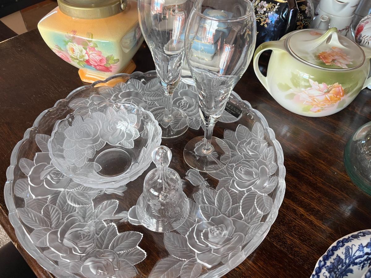 Ceramic teapots and cups and bowls with misc glassware. Some of the ceramics have cracks in the lids as pictured.