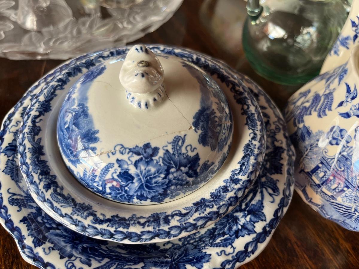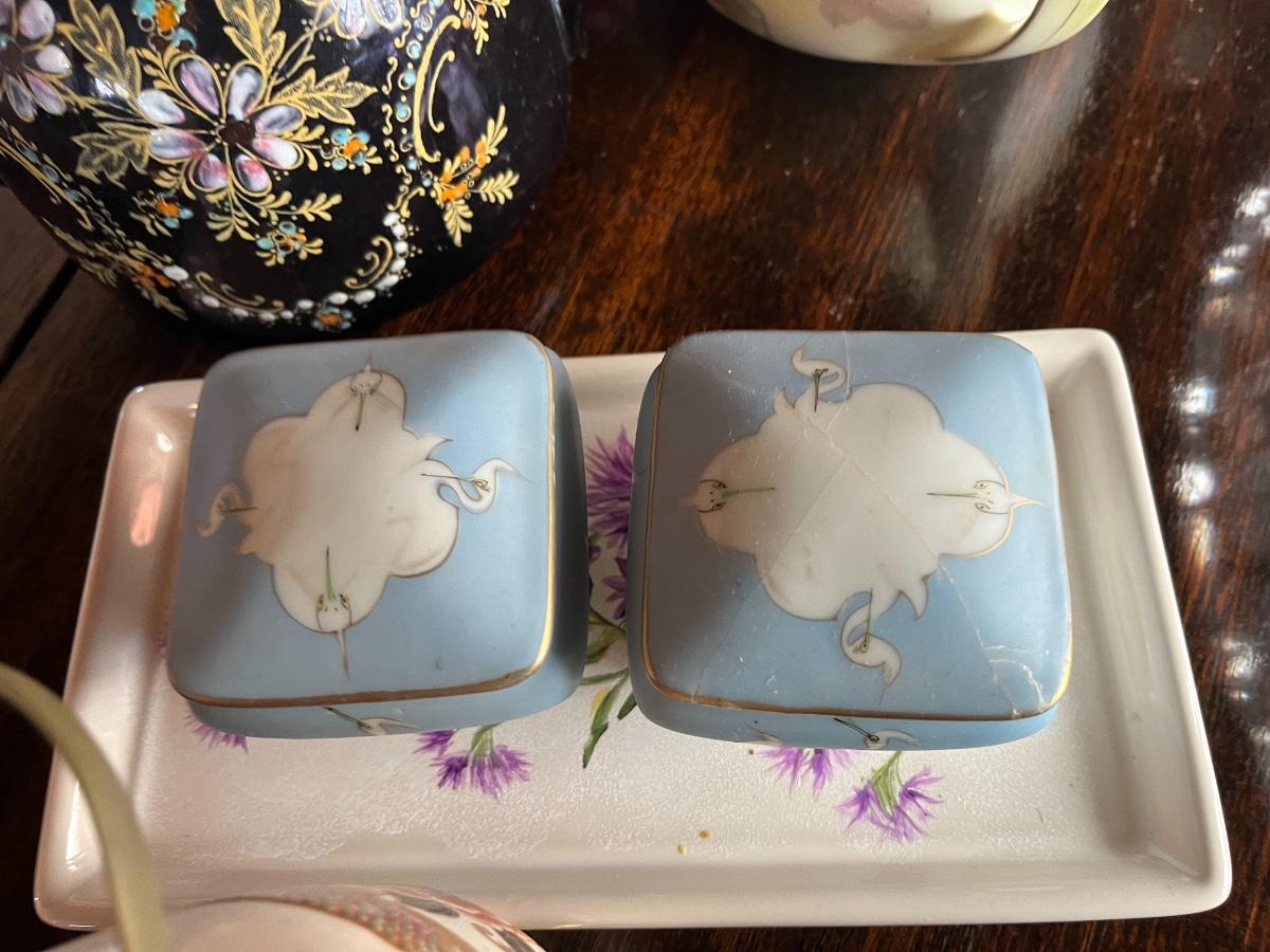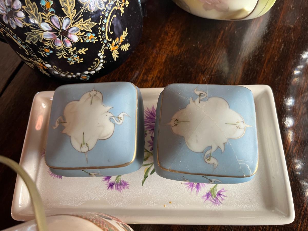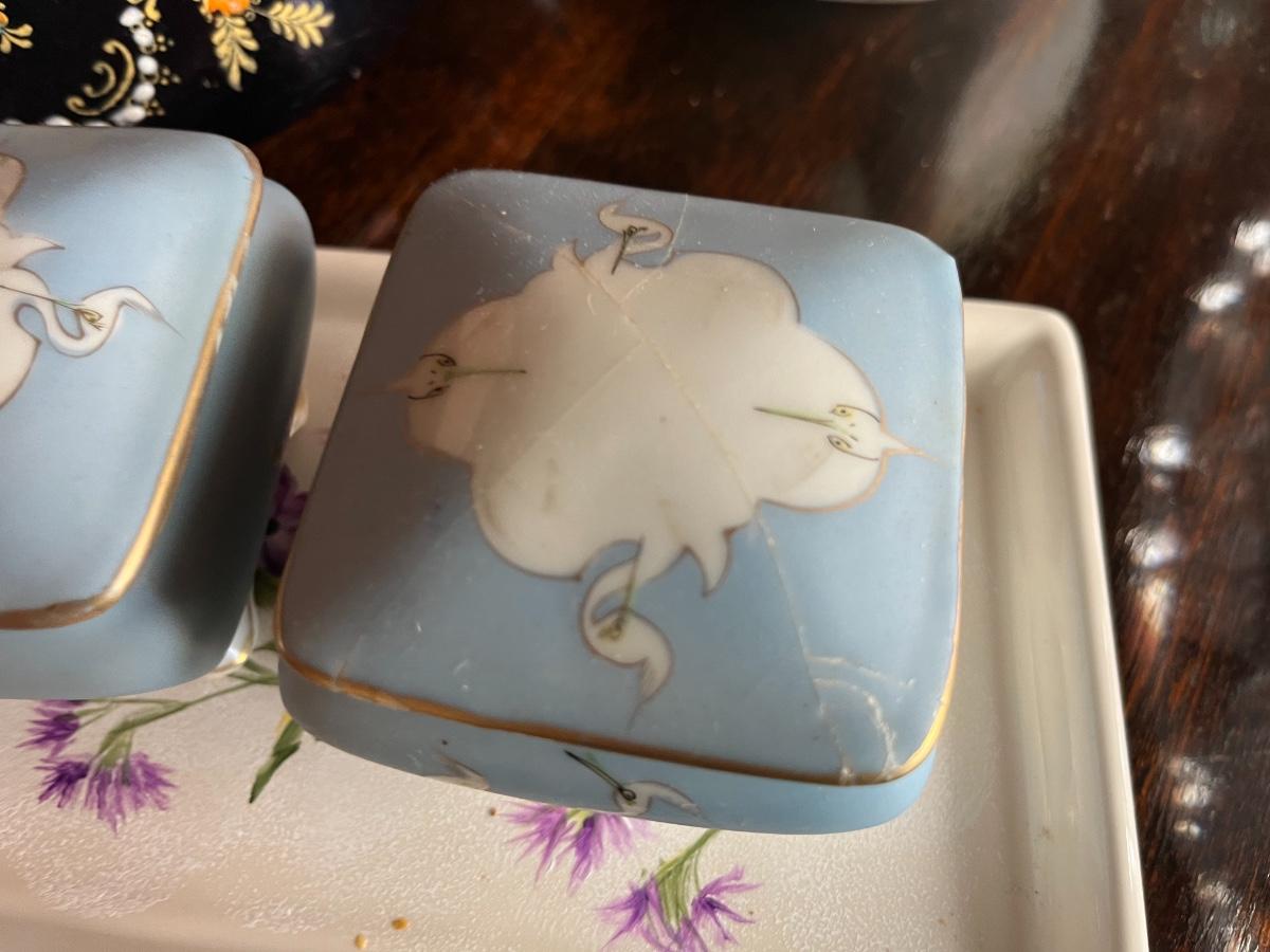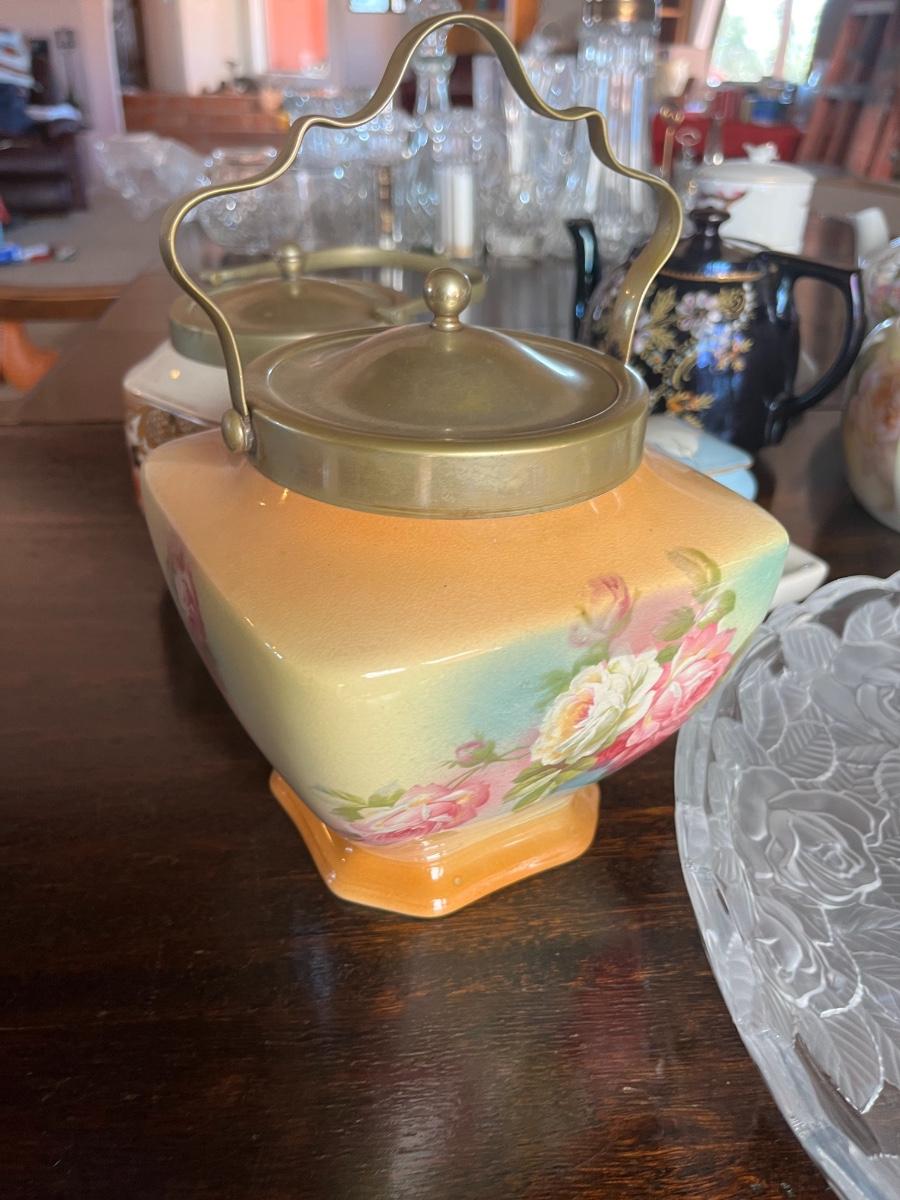 Ceramic teapots and cups and bowls with misc glassware. Some of the ceramics have cracks in the lids as pictured.