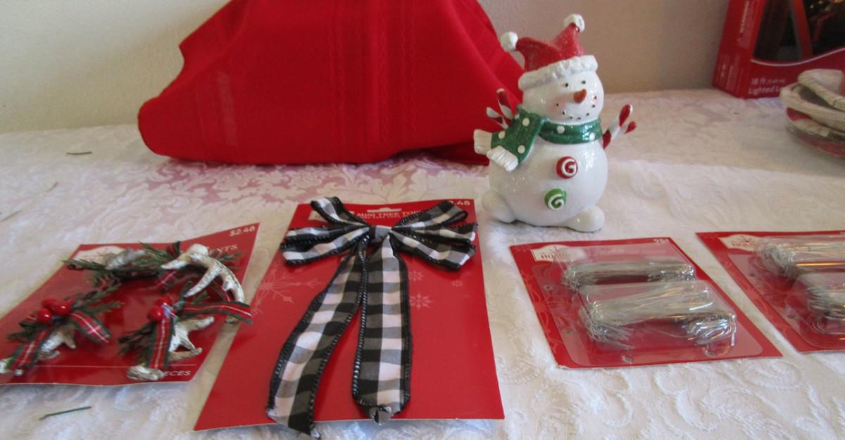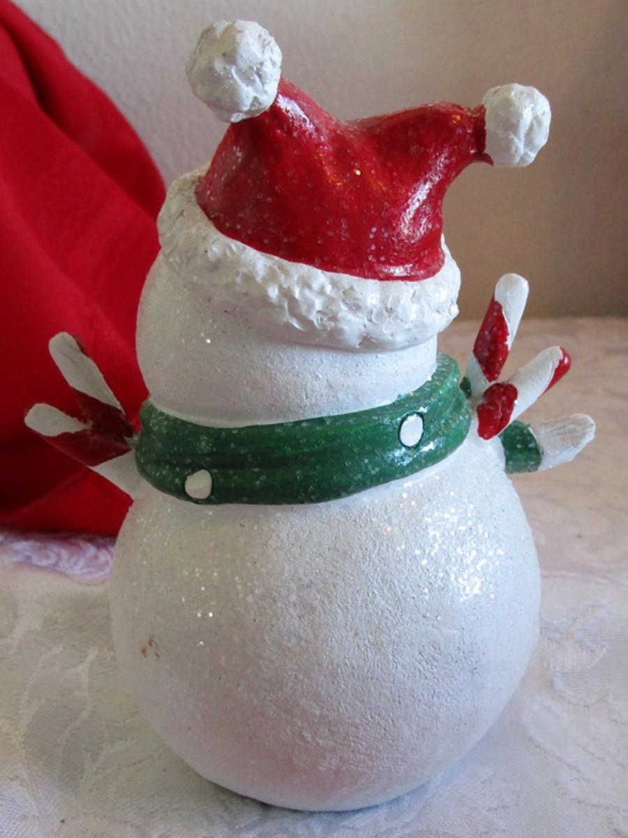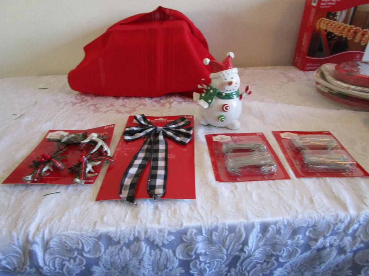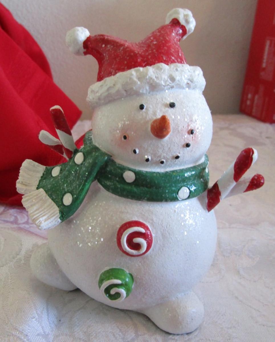 Ceramic snowman, 2 pkg ornament hooks; mini tree topper and 4 mini ornaments