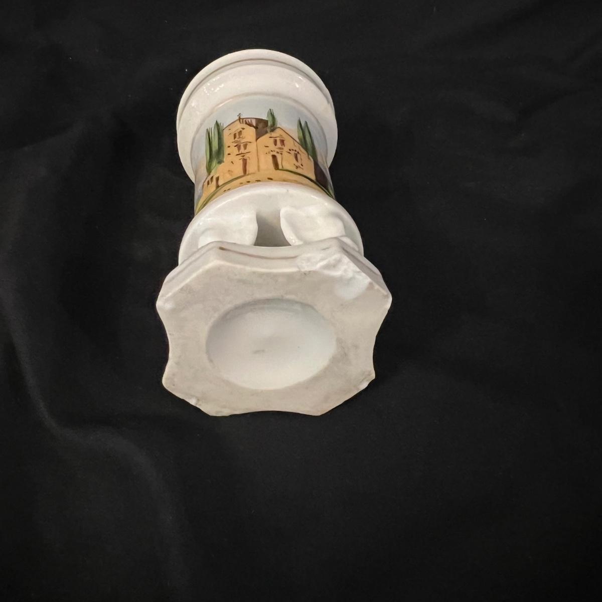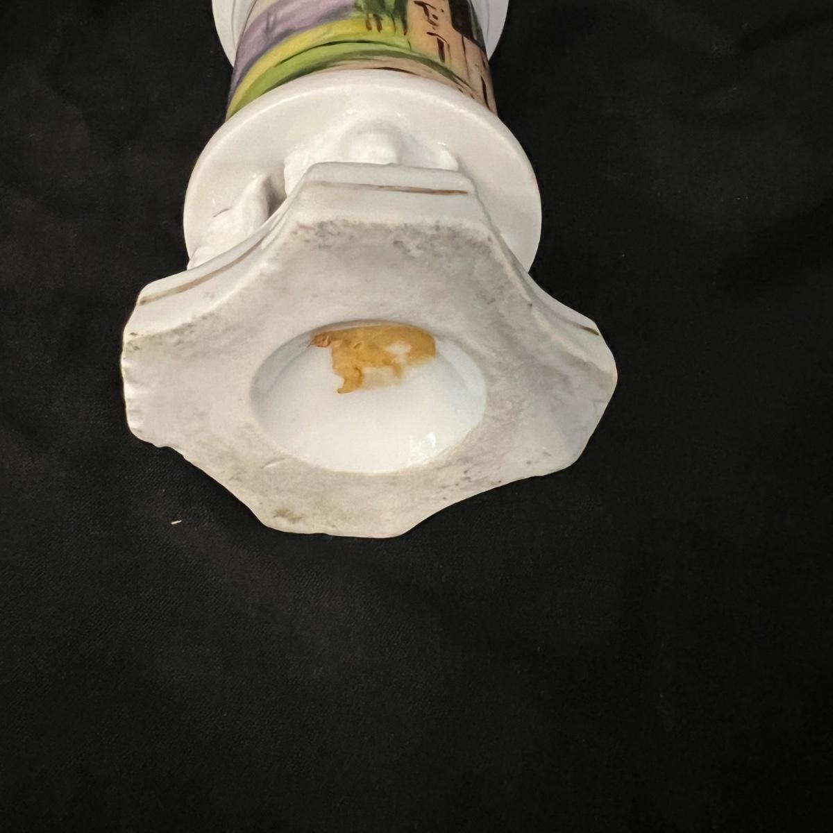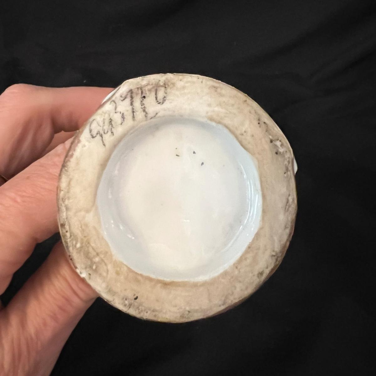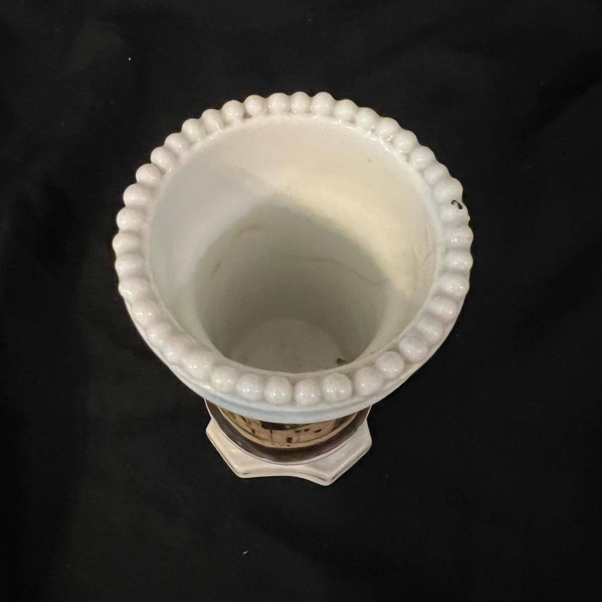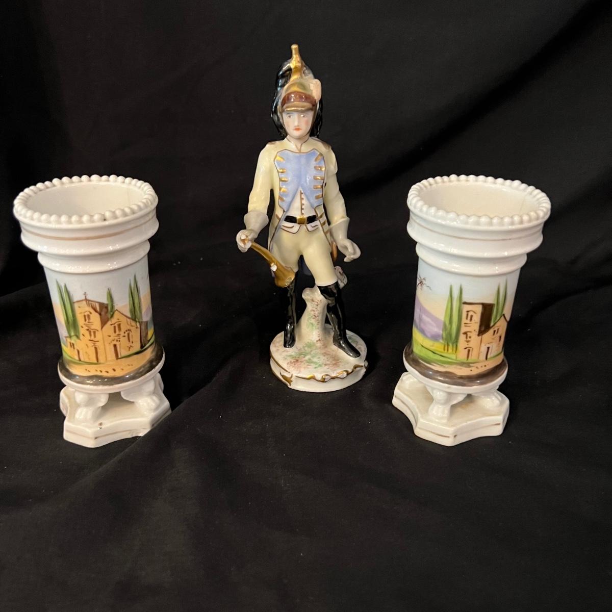 Ceramic soldier figurine, holding what appears to be a bugle (handle missing). The soldier measures approximately 2.5"D x 7"H. The two ceramic vases measure 2.25"D x 4.5"H.
