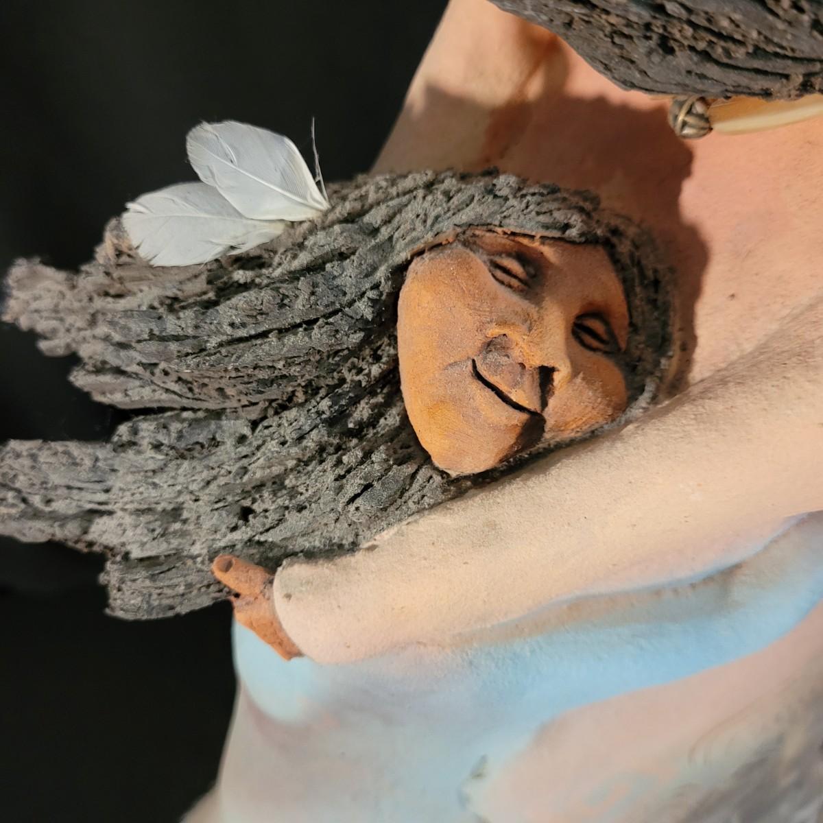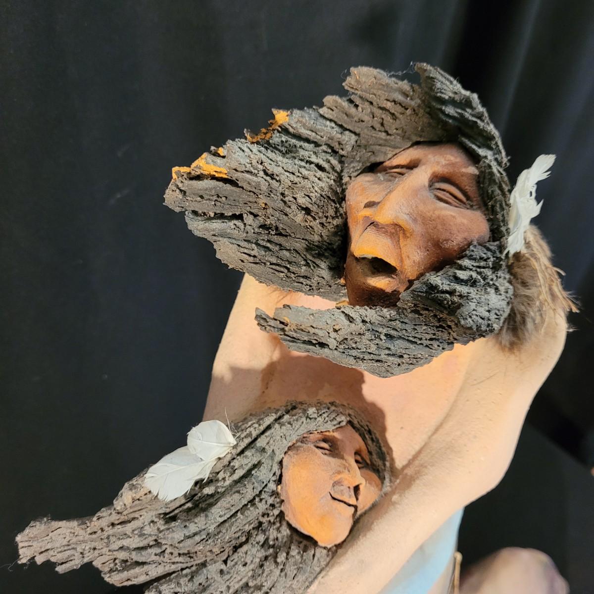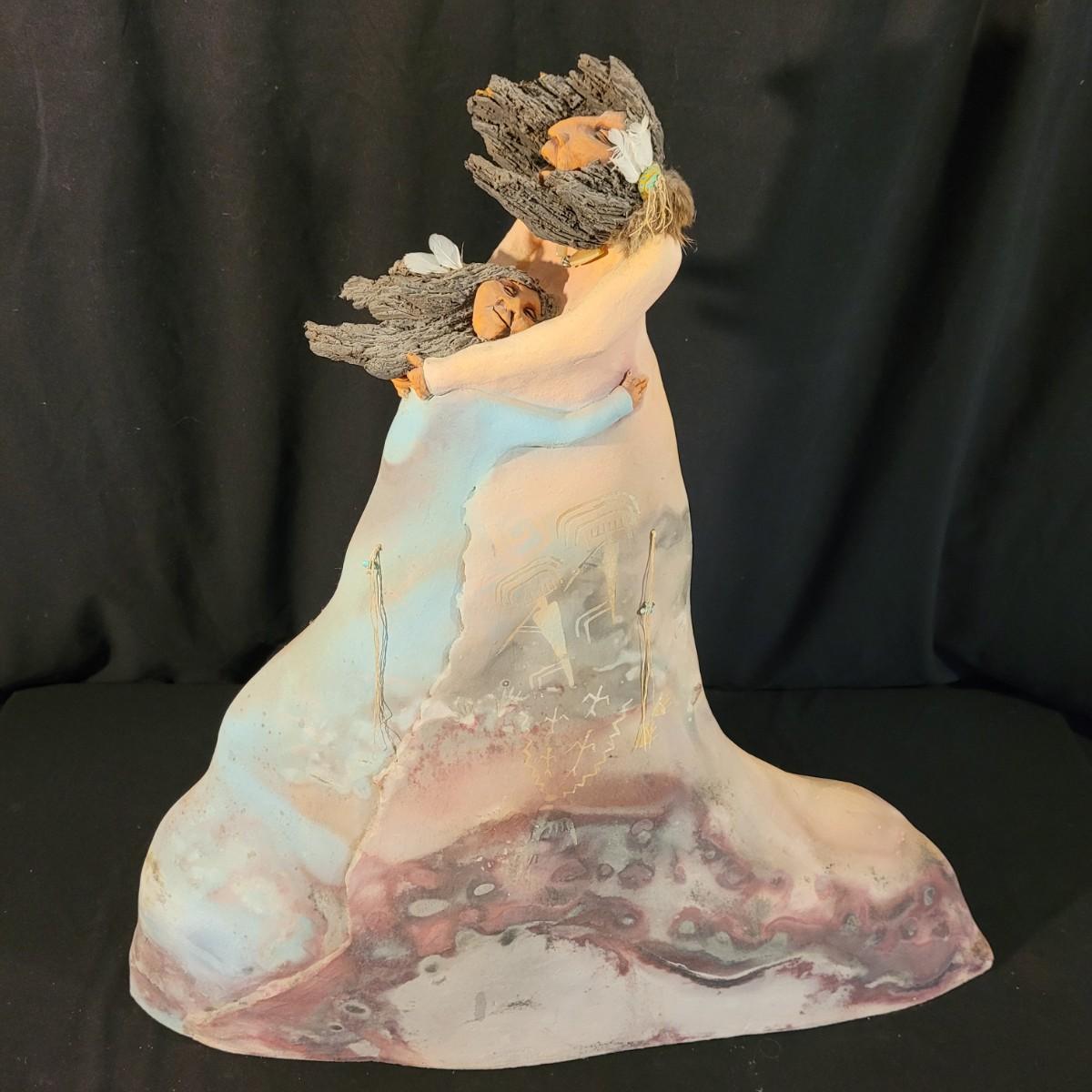 Ceramic sculpture depicting a native Southwest American mother and daughter in a loving embrace. Sculpture is very heavy and fragile. Pieces of hair have broken off but remain with the piece and can be reattached if desired. Besides this slight damage, sculpture is in excellent condition. Measures approximately 31"L x31"H. Local pickup only.