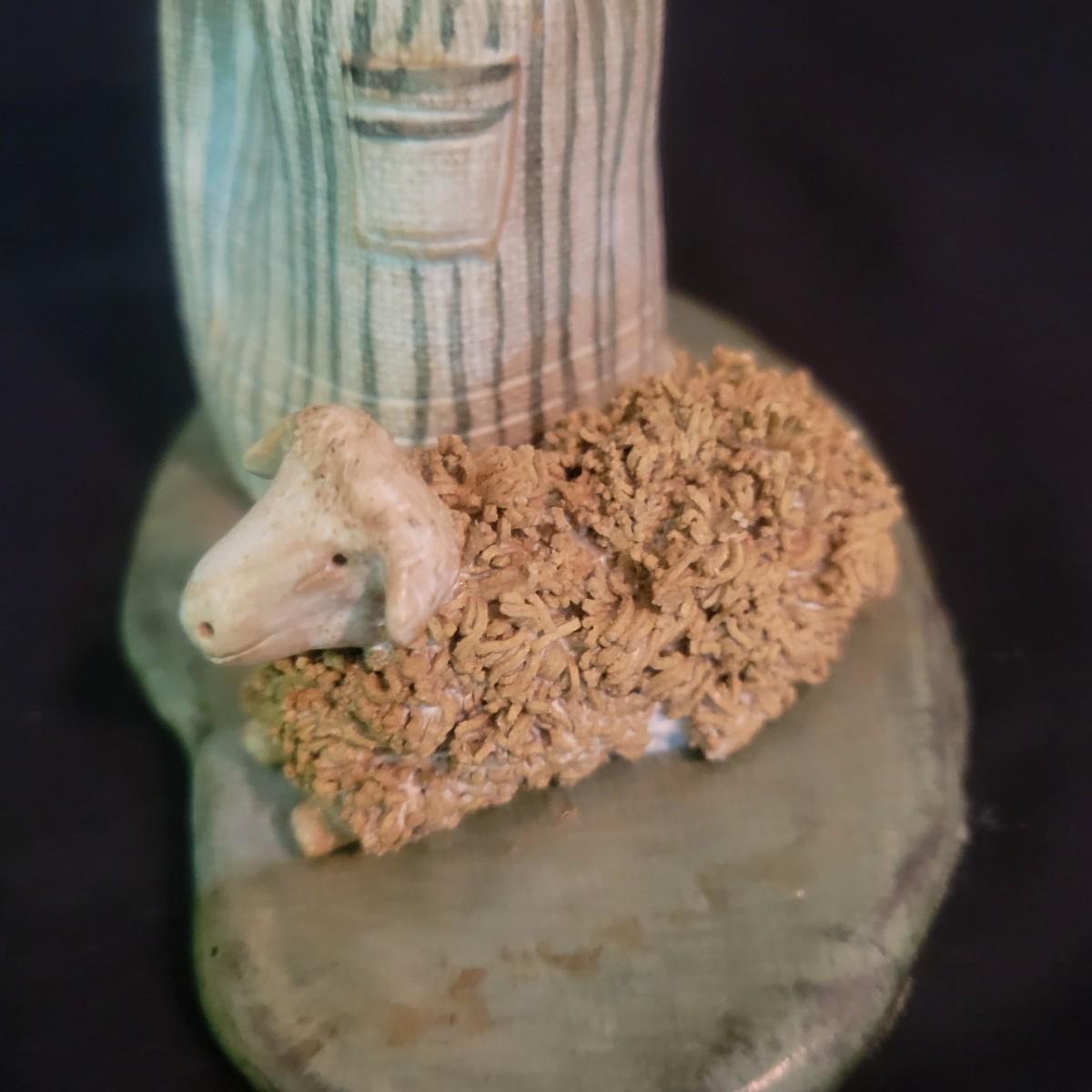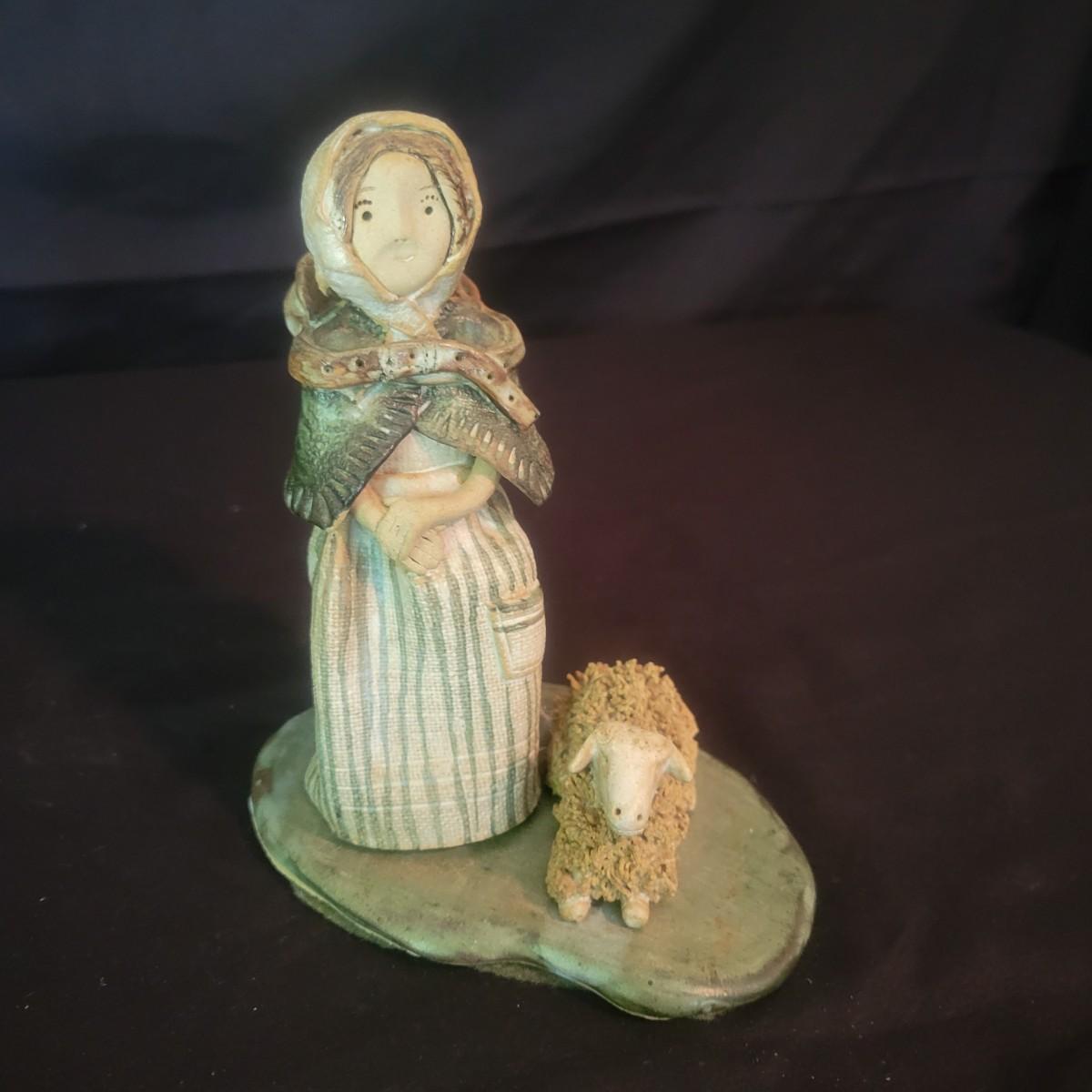 A ceramic statue of a woman and a sheep. It appears to be hand crafted and hand painted, but has no artist signature. It measures approximately 5" x 3.5" x 6.5". Shipping available