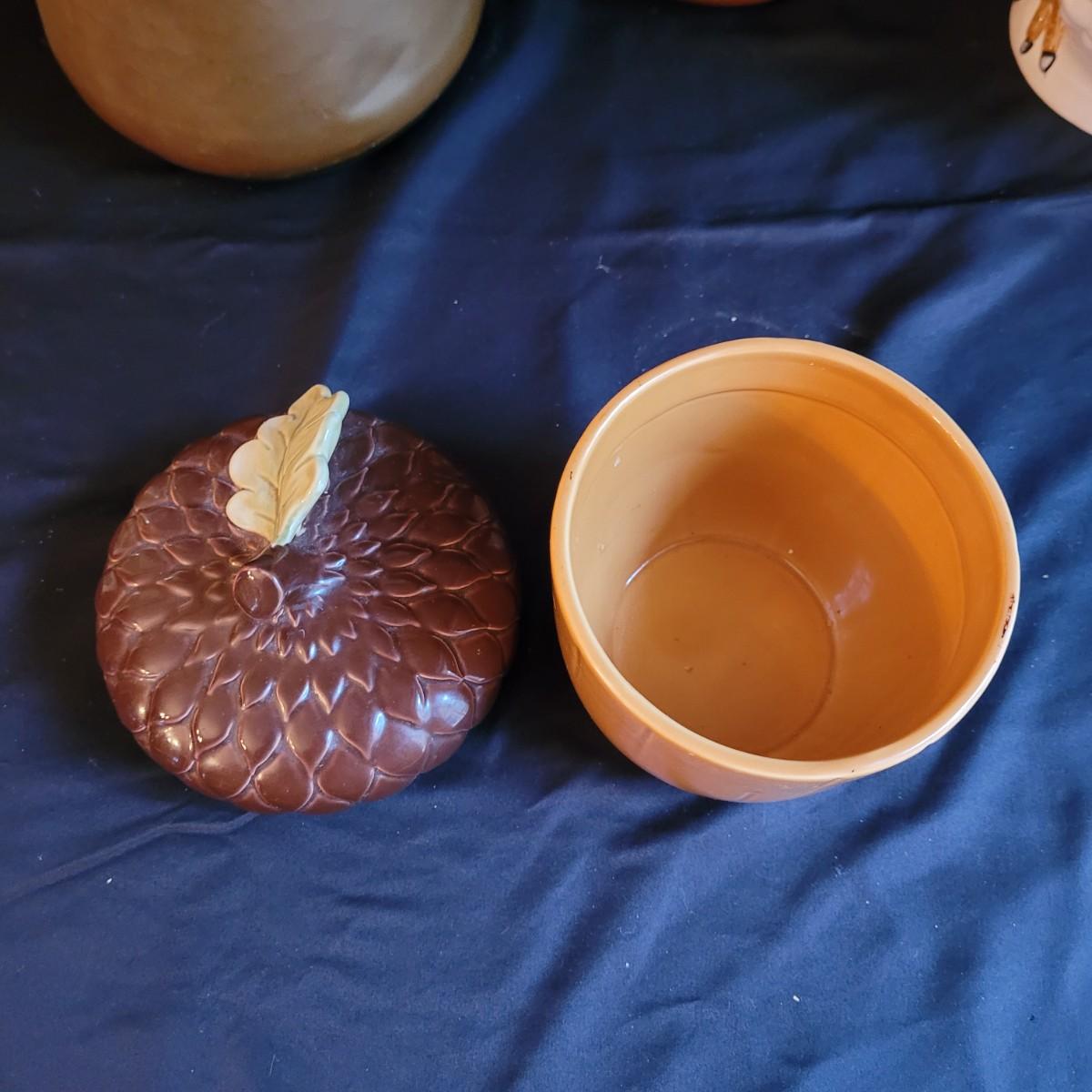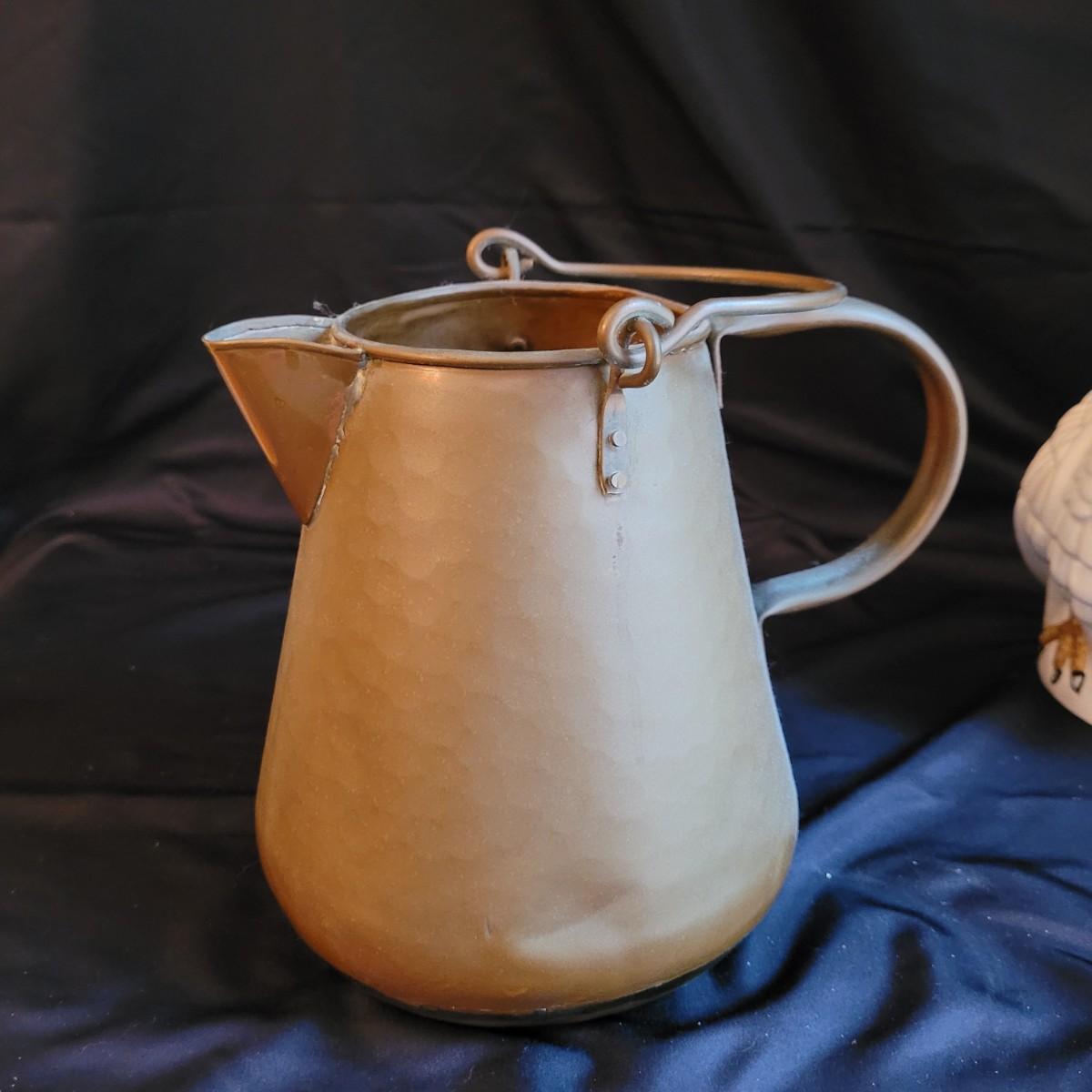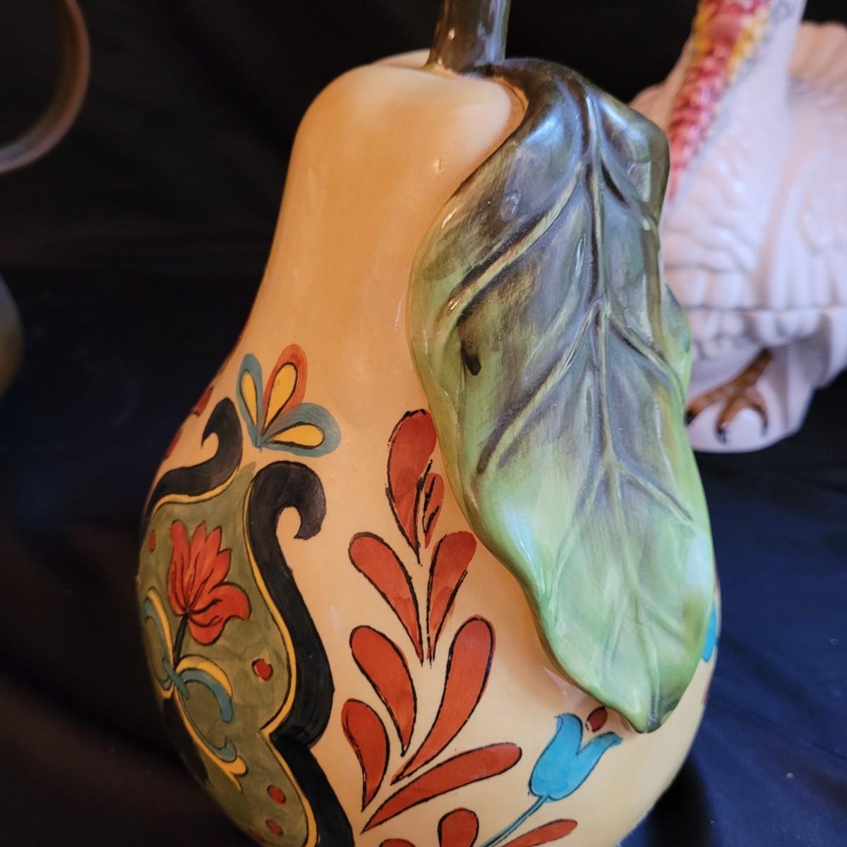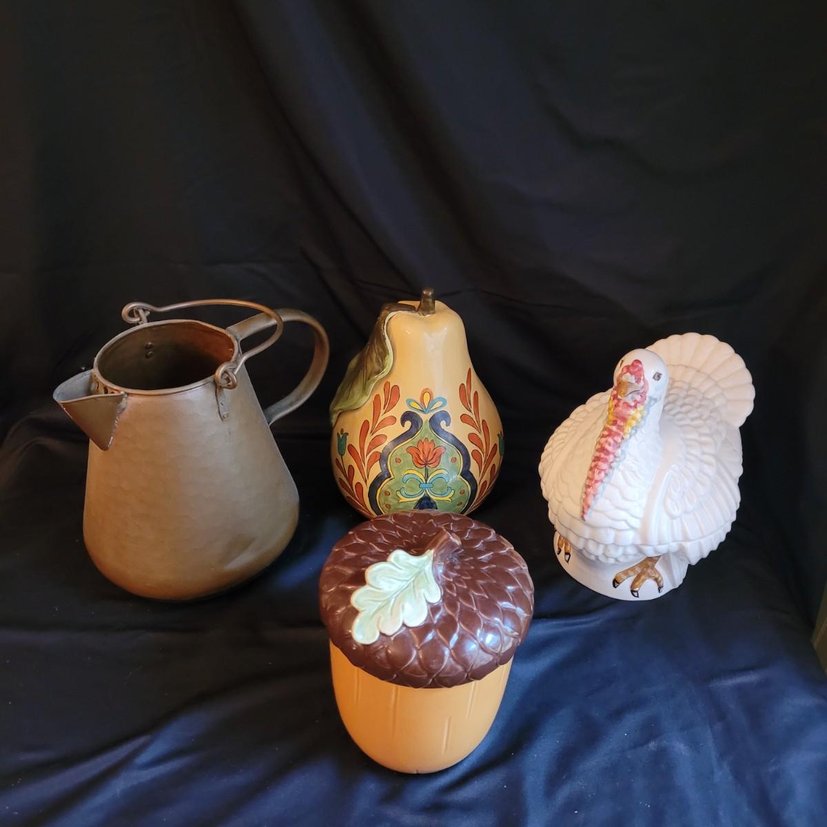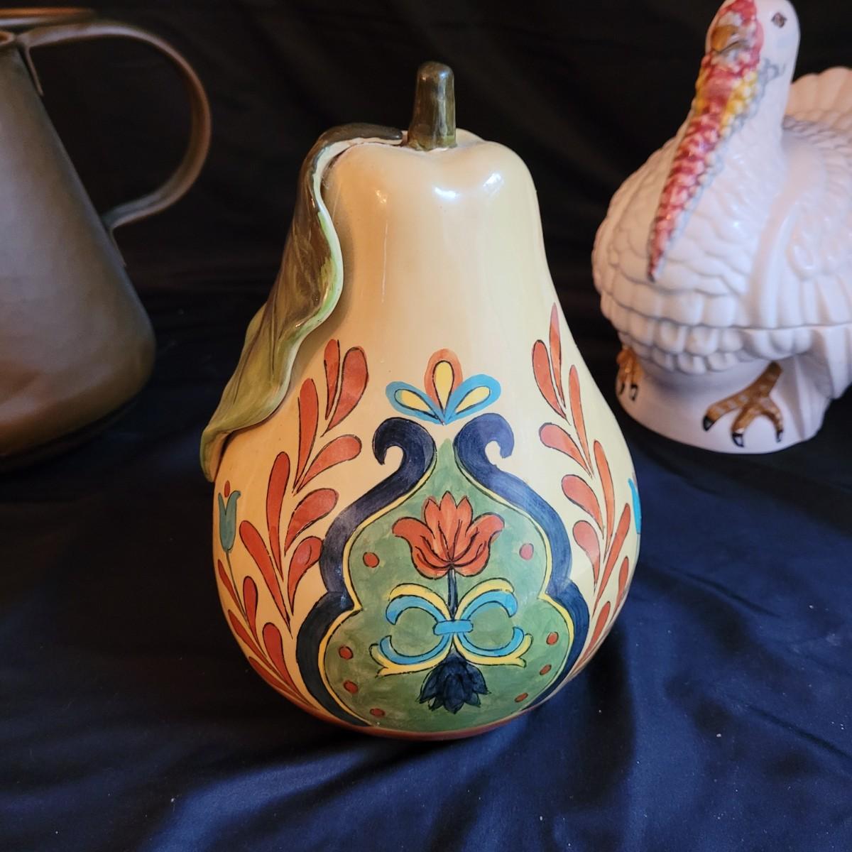 This lot of kitchen decor includes two ceramic storage jars, a painted ceramic pear and a copper style pitcher. Pitcher measures approximately 7”D (at base) x 10”H. Shipping available.