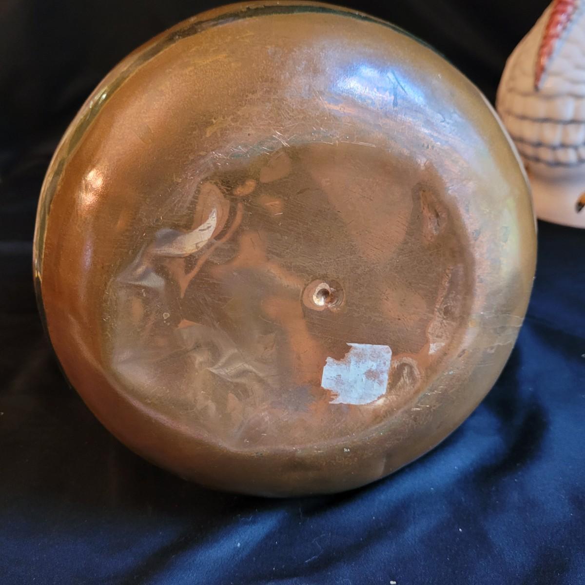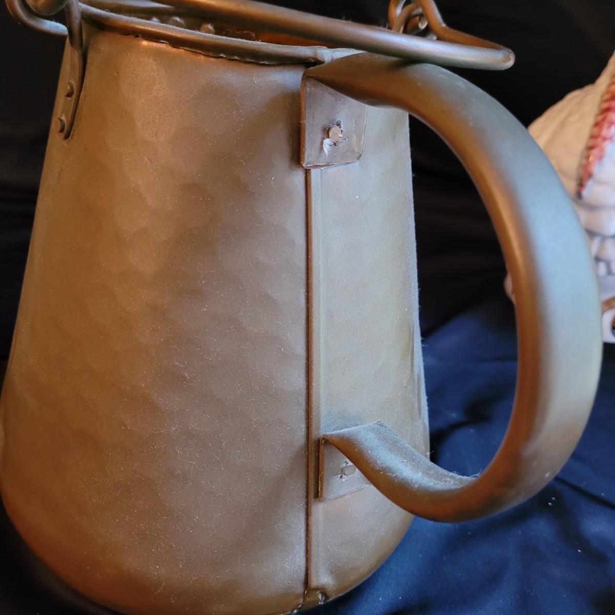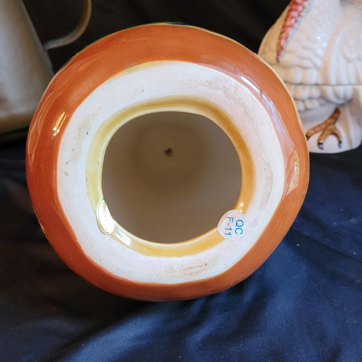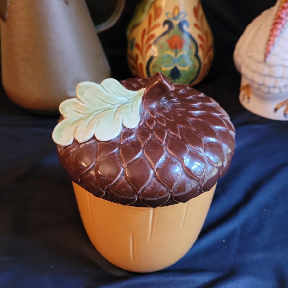 This lot of kitchen decor includes two ceramic storage jars, a painted ceramic pear and a copper style pitcher. Pitcher measures approximately 7”D (at base) x 10”H. Shipping available.