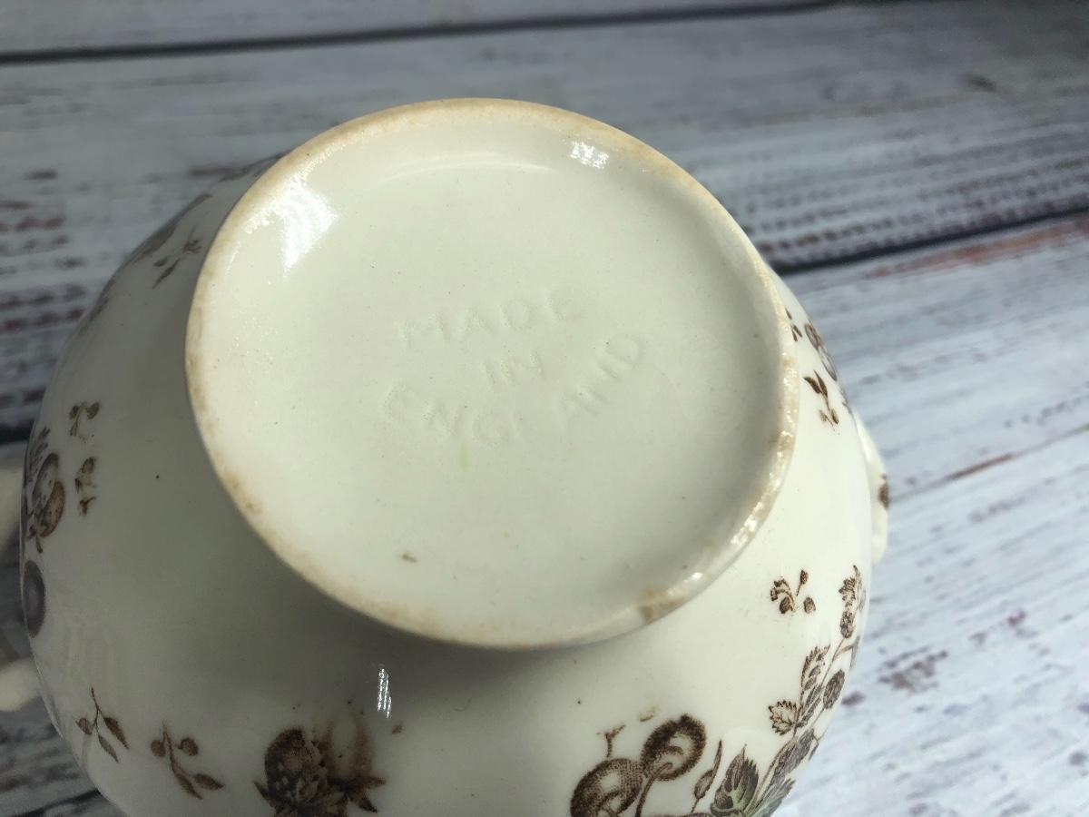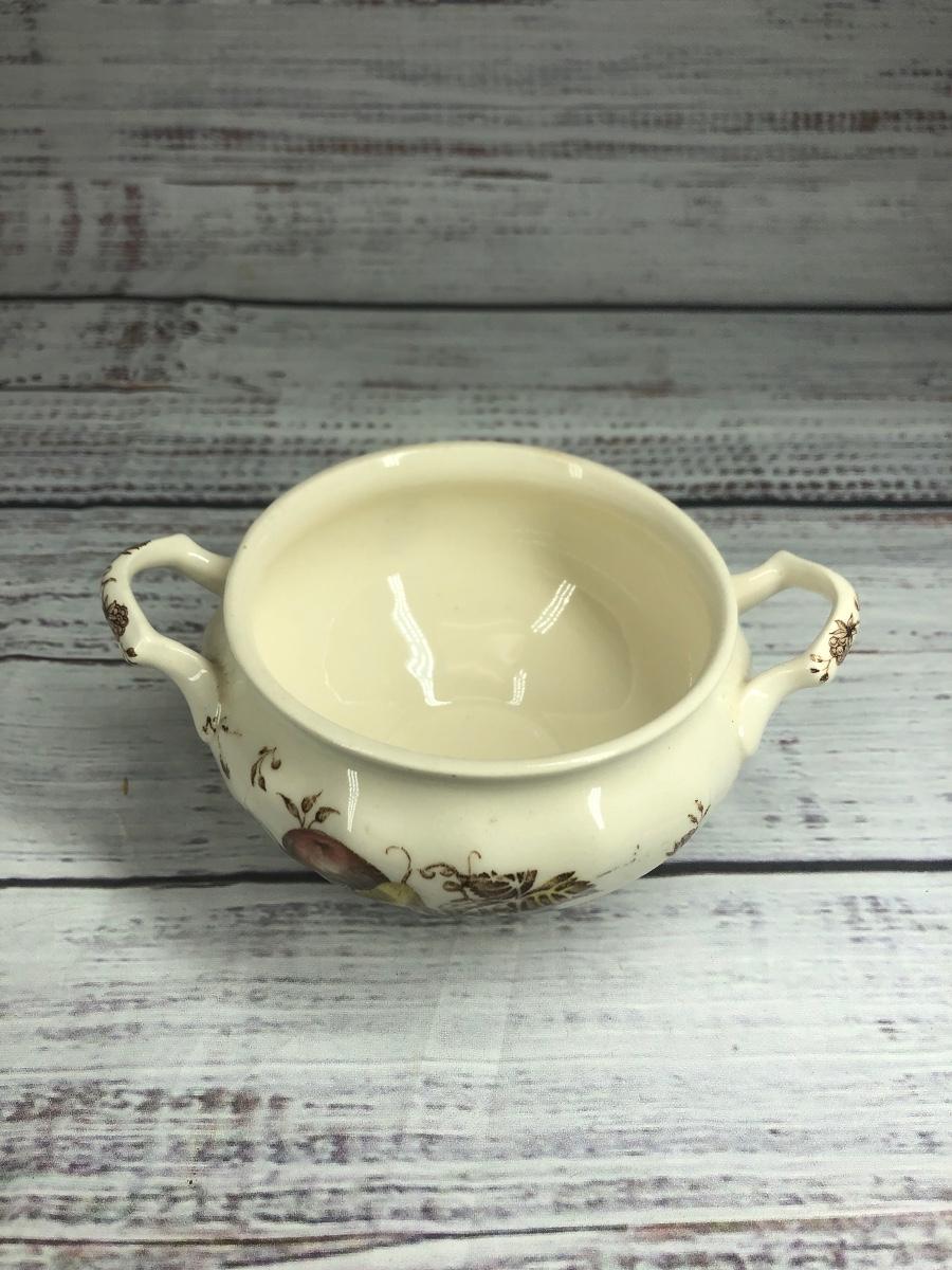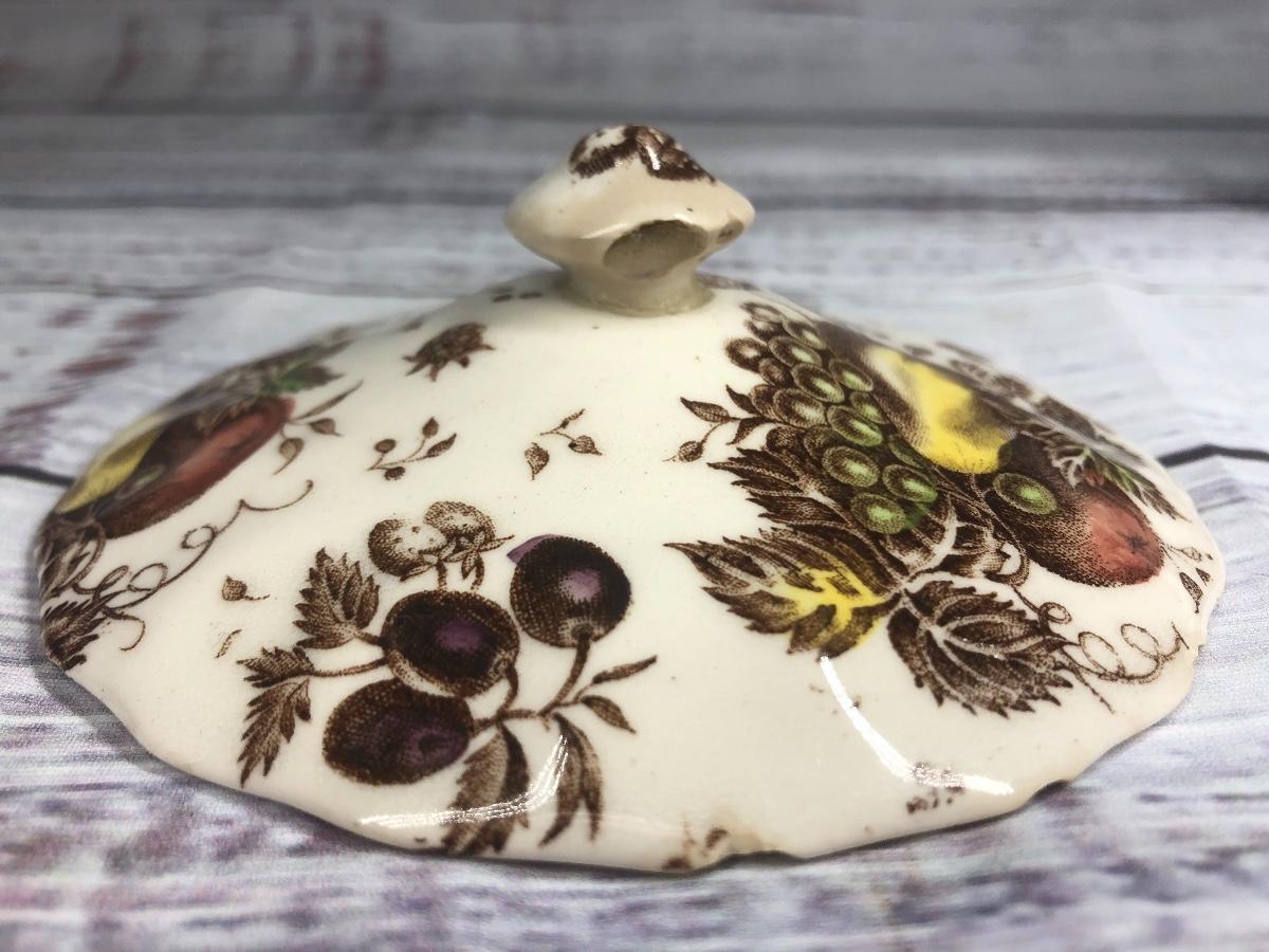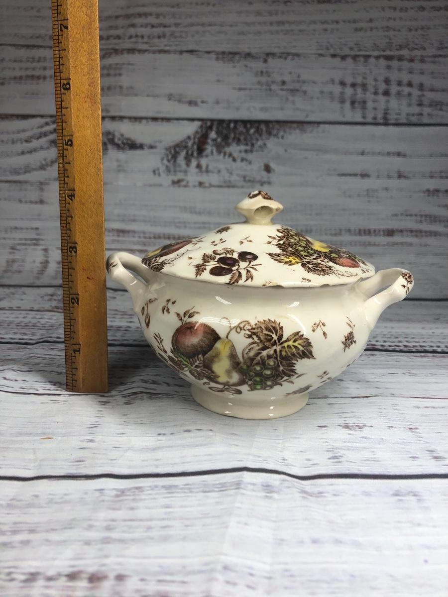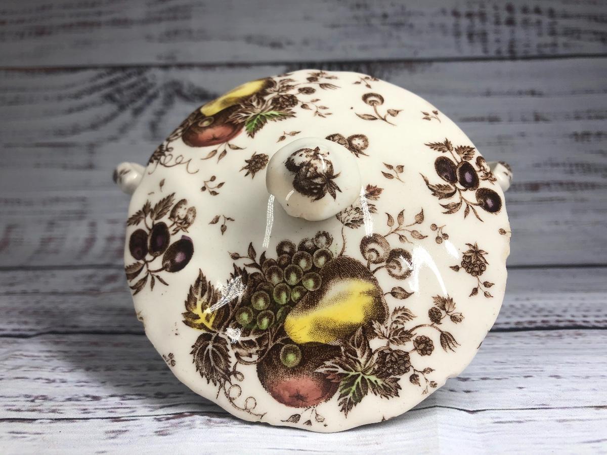Ceramic sugar bowl adorned with fruits and leaves along the lid and bowl. Lid has some chips along the side. Bottom reads: “Made in England.”