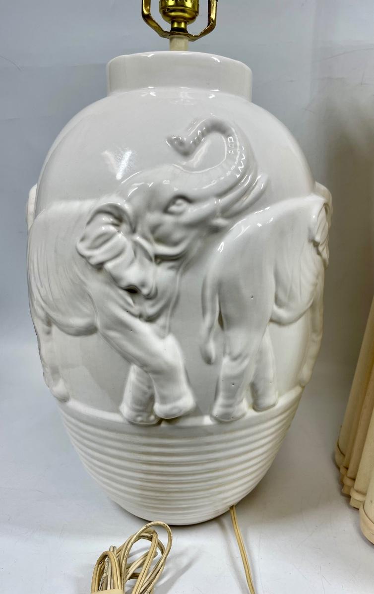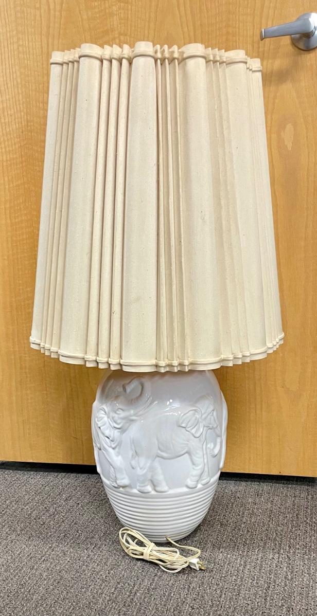 White ceramic body with elephant relief design. Includes vintage shade, tested, works as expected. Approx. 36" tall with shade in place.