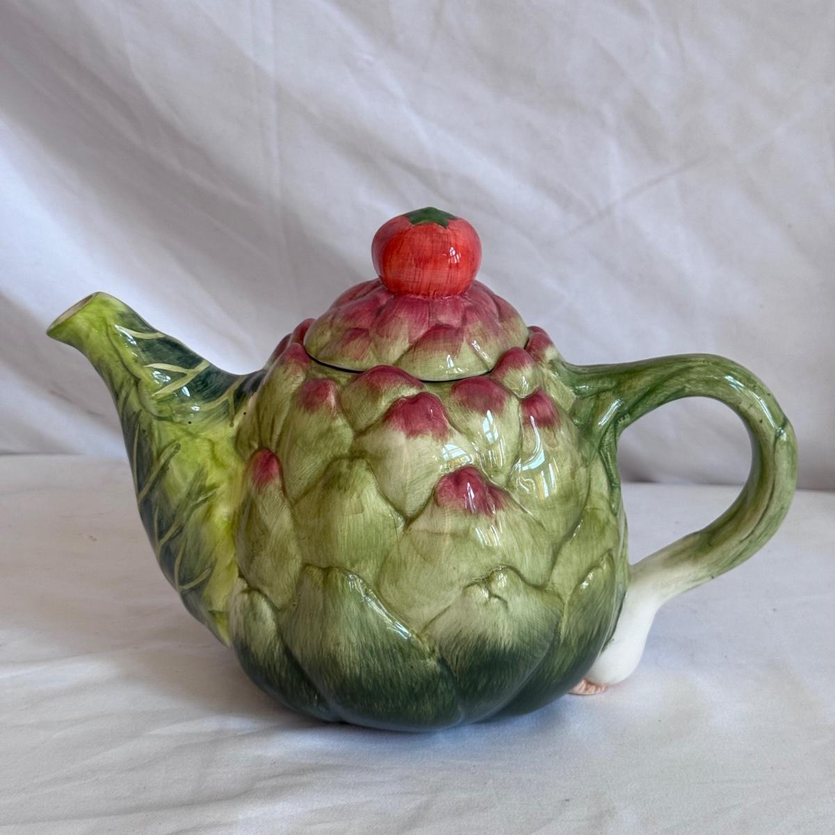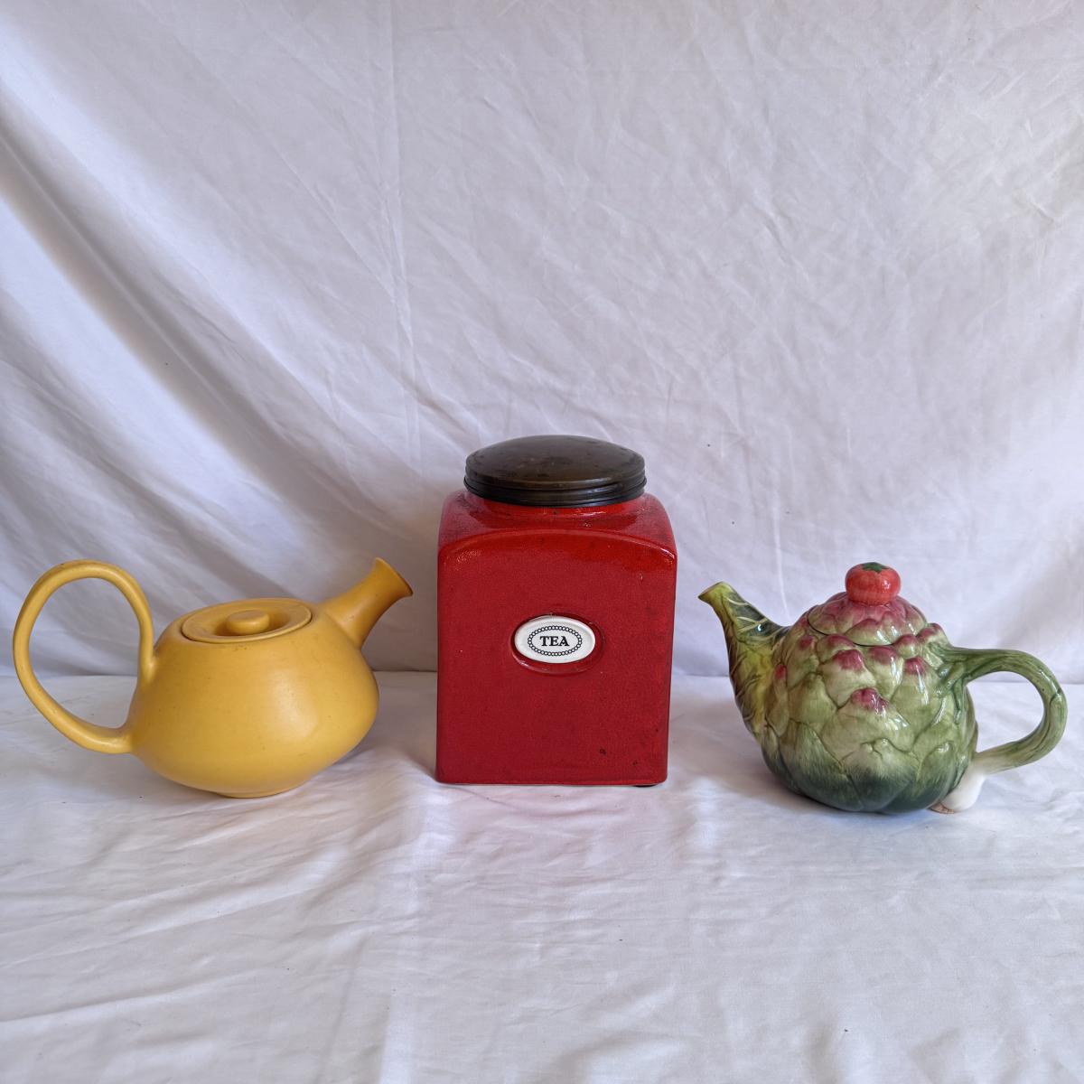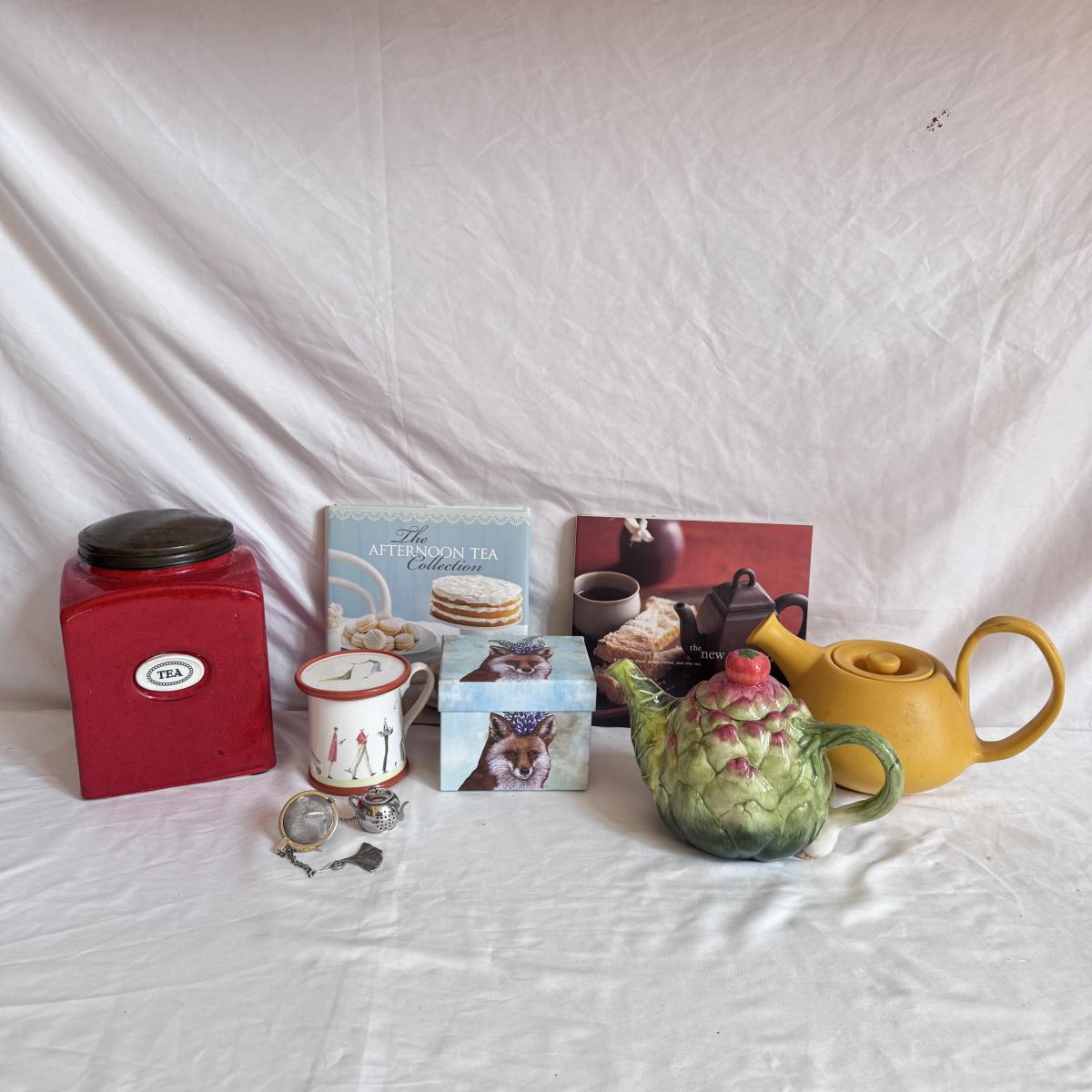 For the tea lovers! This lot includes one ceramic artichoke tea pot, one yellow ceramic tea pot, and a red ceramic tea canister with lid. It also includes “The New Tea Book” by Sara Perry, “The Afternoon Tea Collection” by Sterling, two mugs by Port Meirion and Vicki Sawyer, and two stainless steel tea infuser balls. The tea canister is the largest item that measures 6.25” x 6.25” x 8”H. Shipping available.