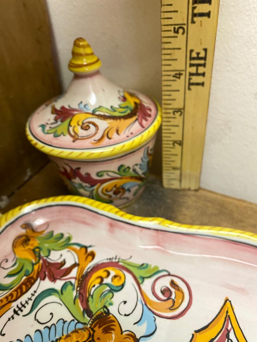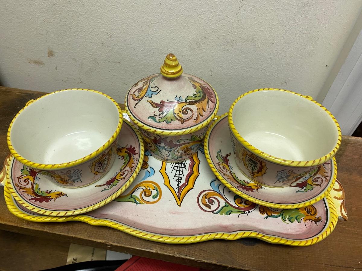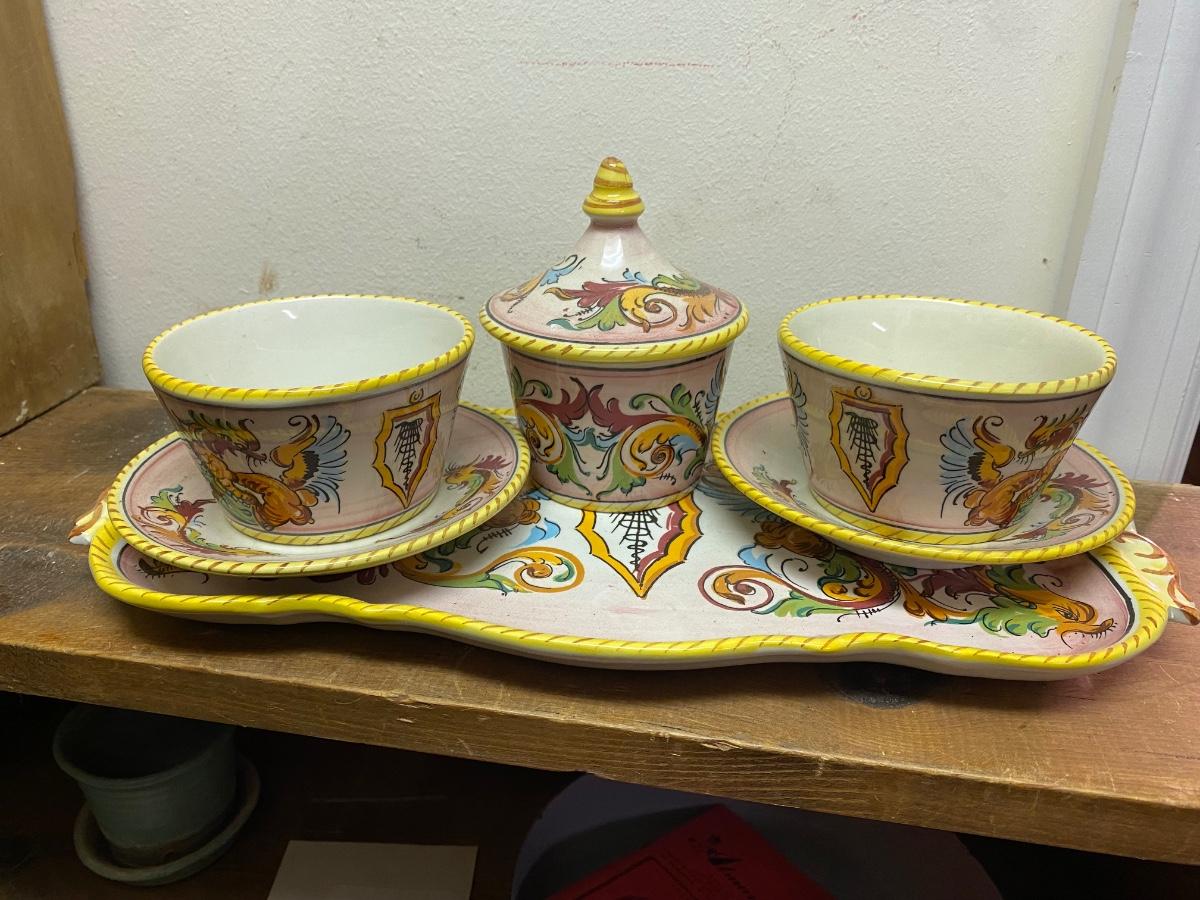 Sweet ceramic tea set, 2 4" diameter cups with saucers on 14" tray with sugar bowl.