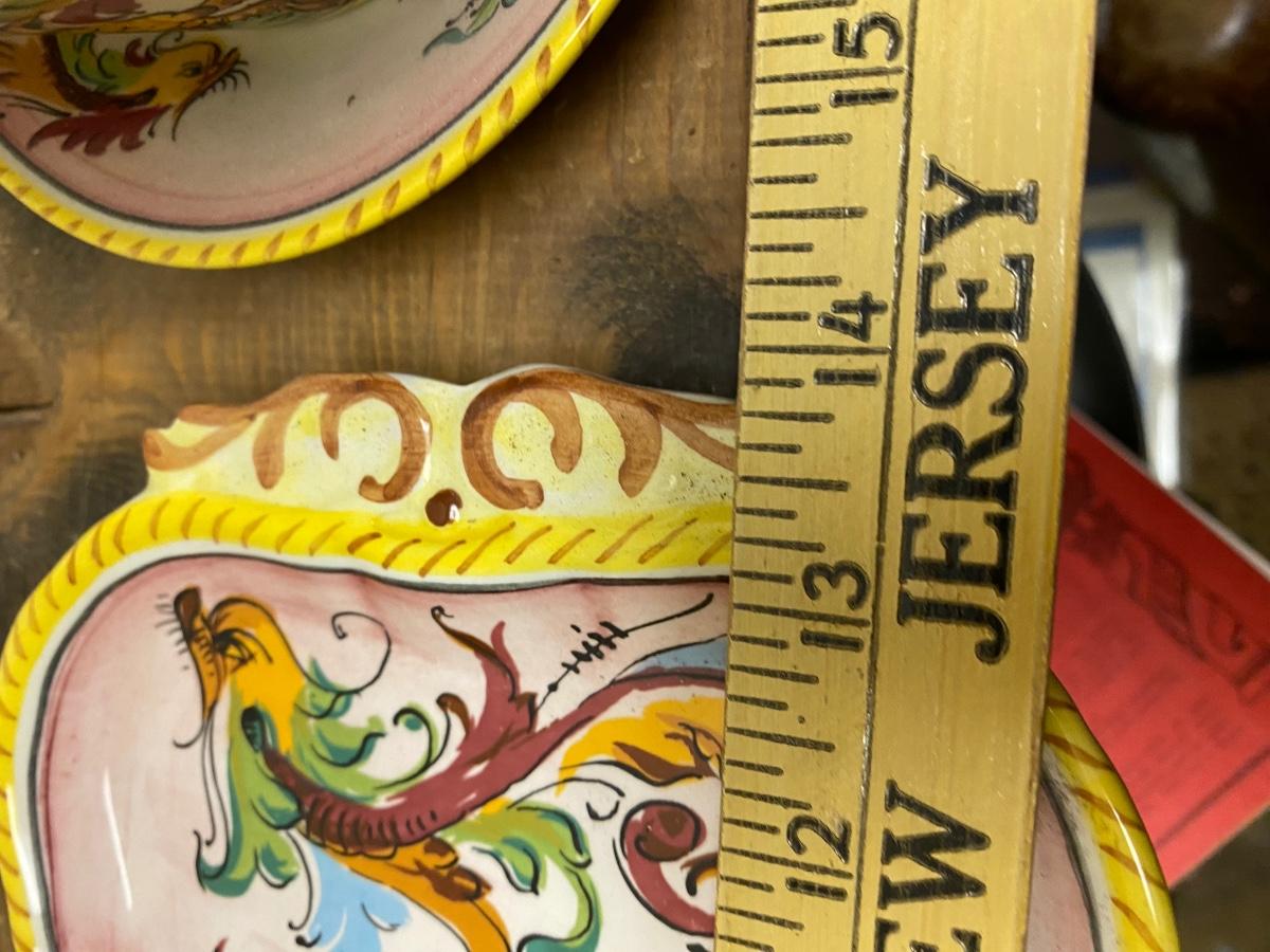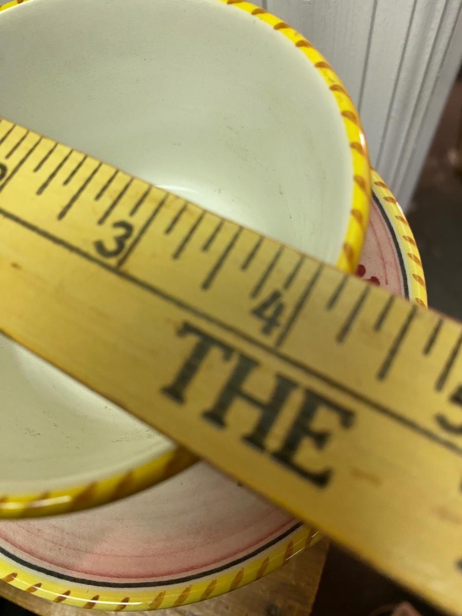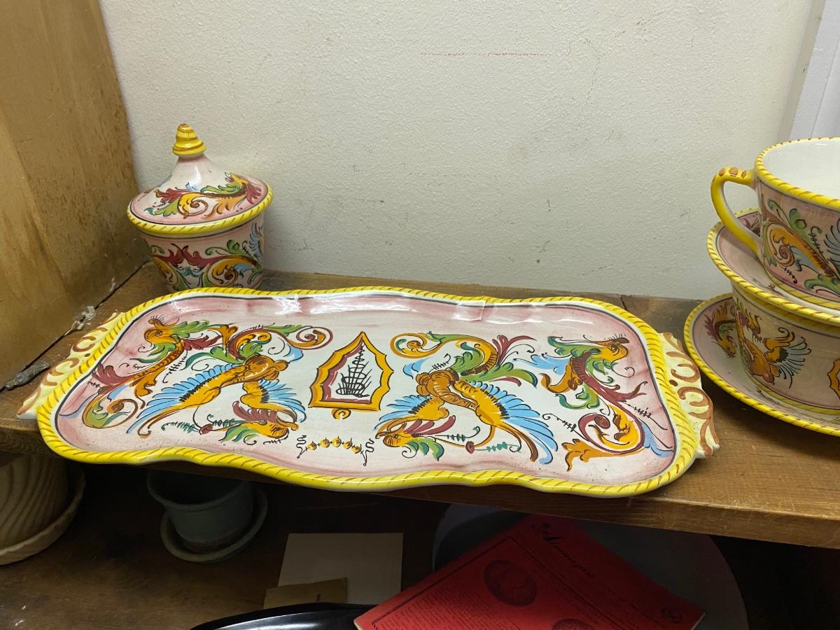 Sweet ceramic tea set, 2 4" diameter cups with saucers on 14" tray with sugar bowl.