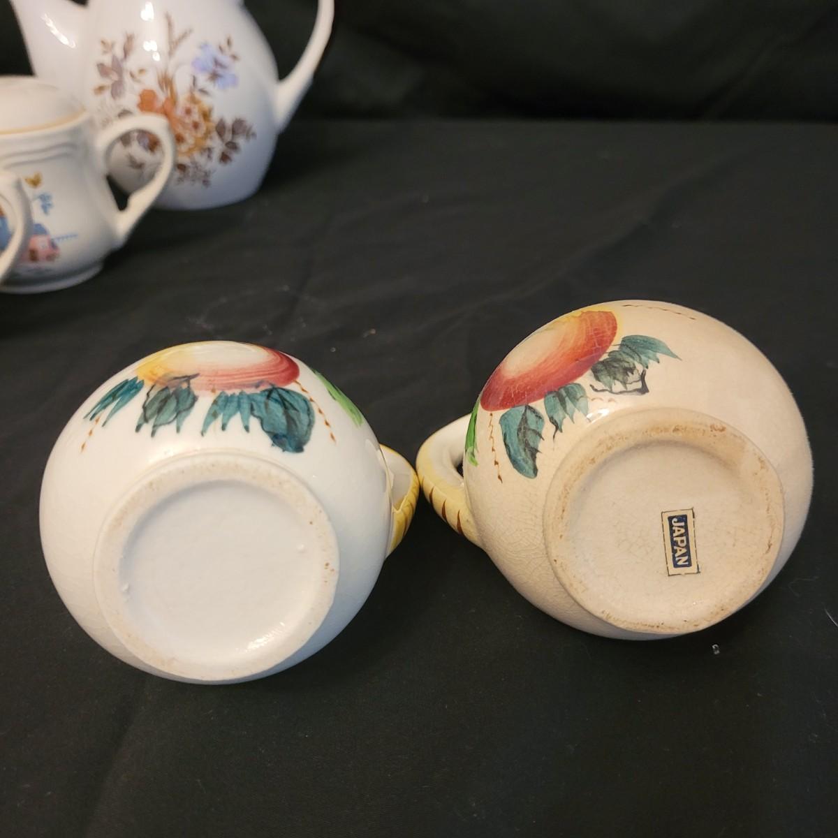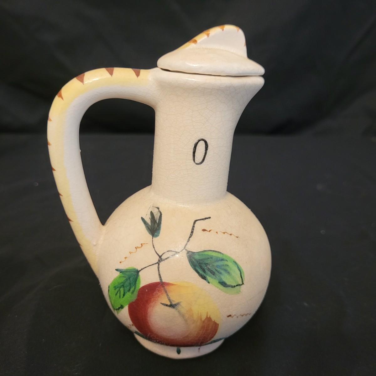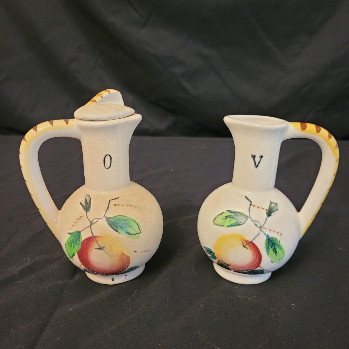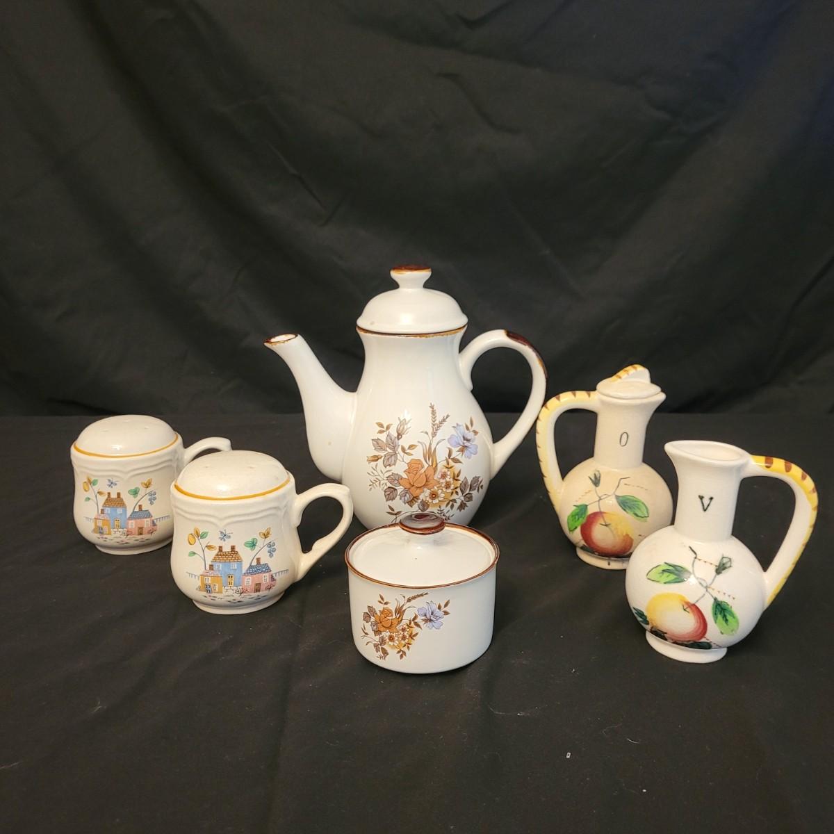 Cute collection of ceramic kitchen items, including a teapot with locking lid and matching sugar/cream container, small olive and vinegar pitchers, and a salt and pepper shaker set. Items in good condition with some chips, crazing and grime (appears to be easily cleanable). Teapot measures approximately 8.5"H. Shipping available.