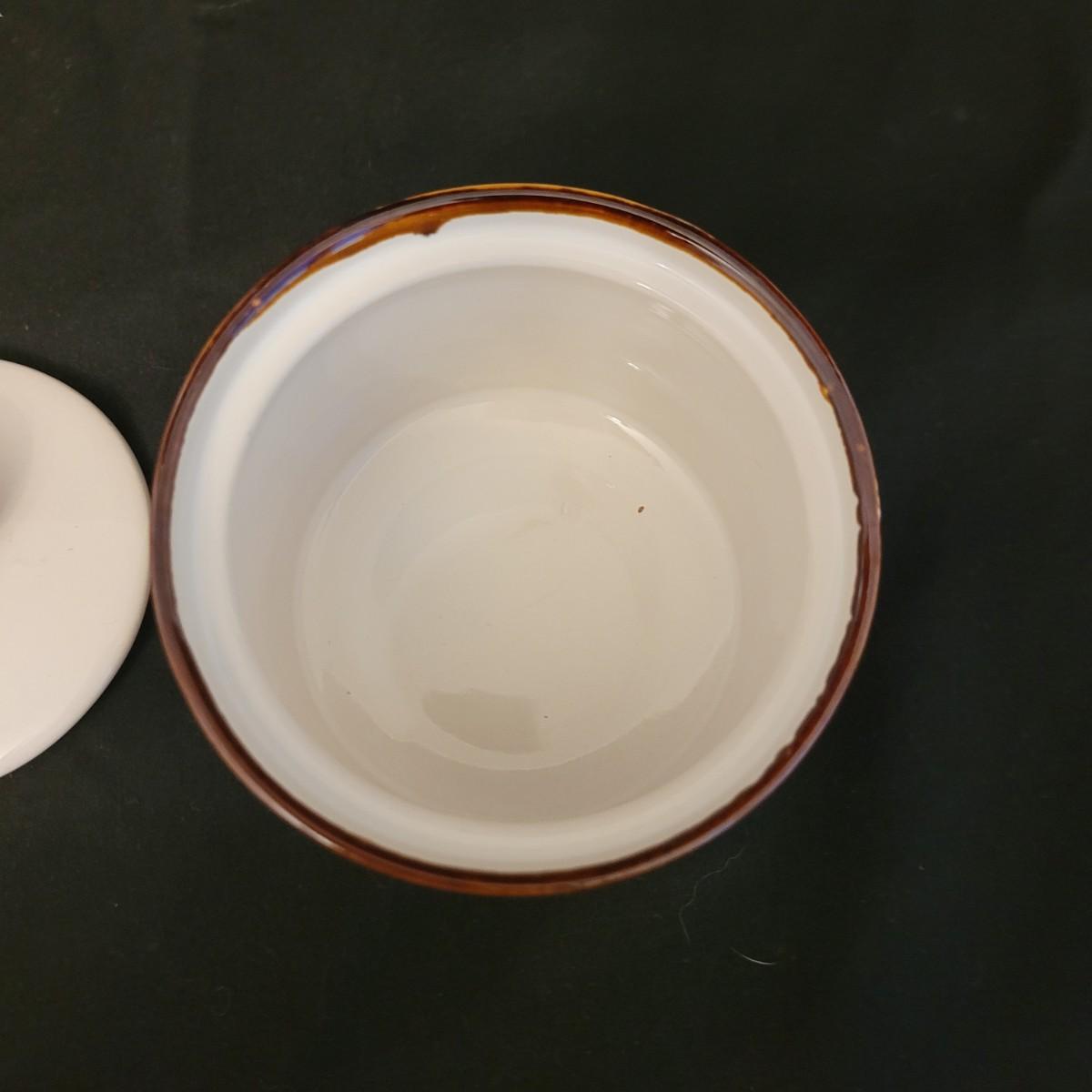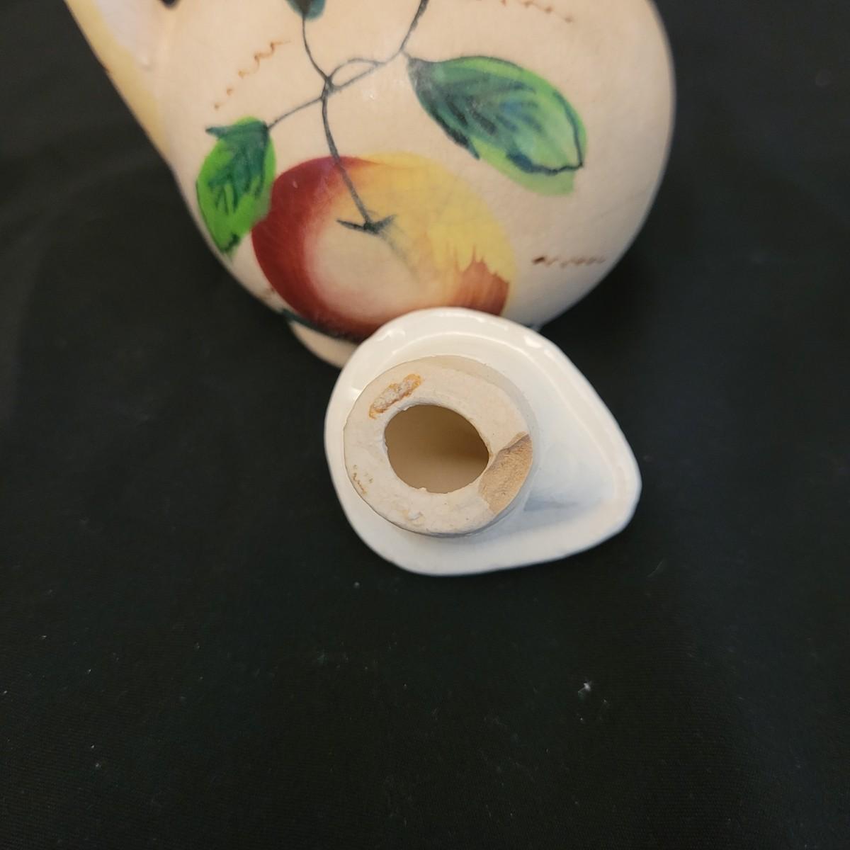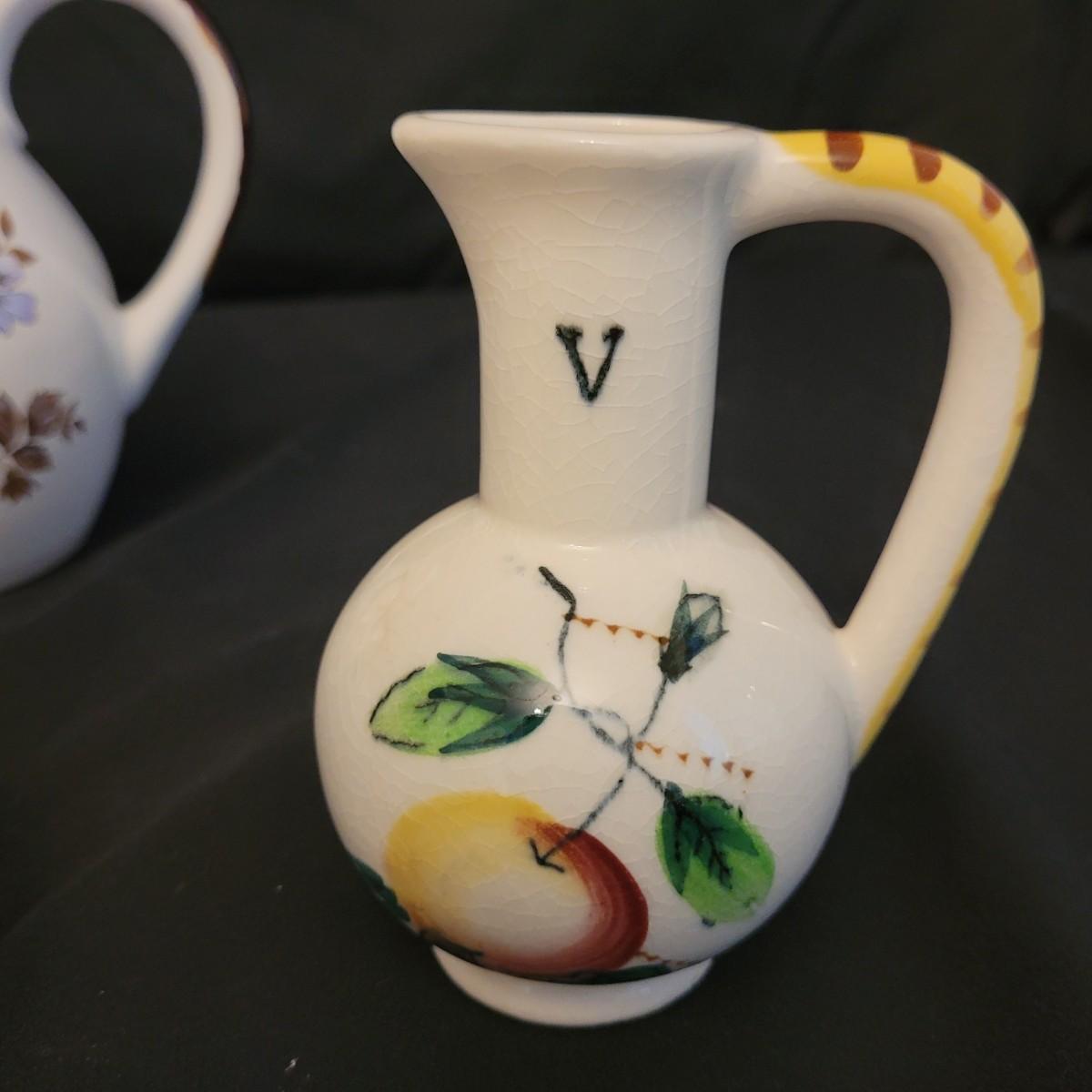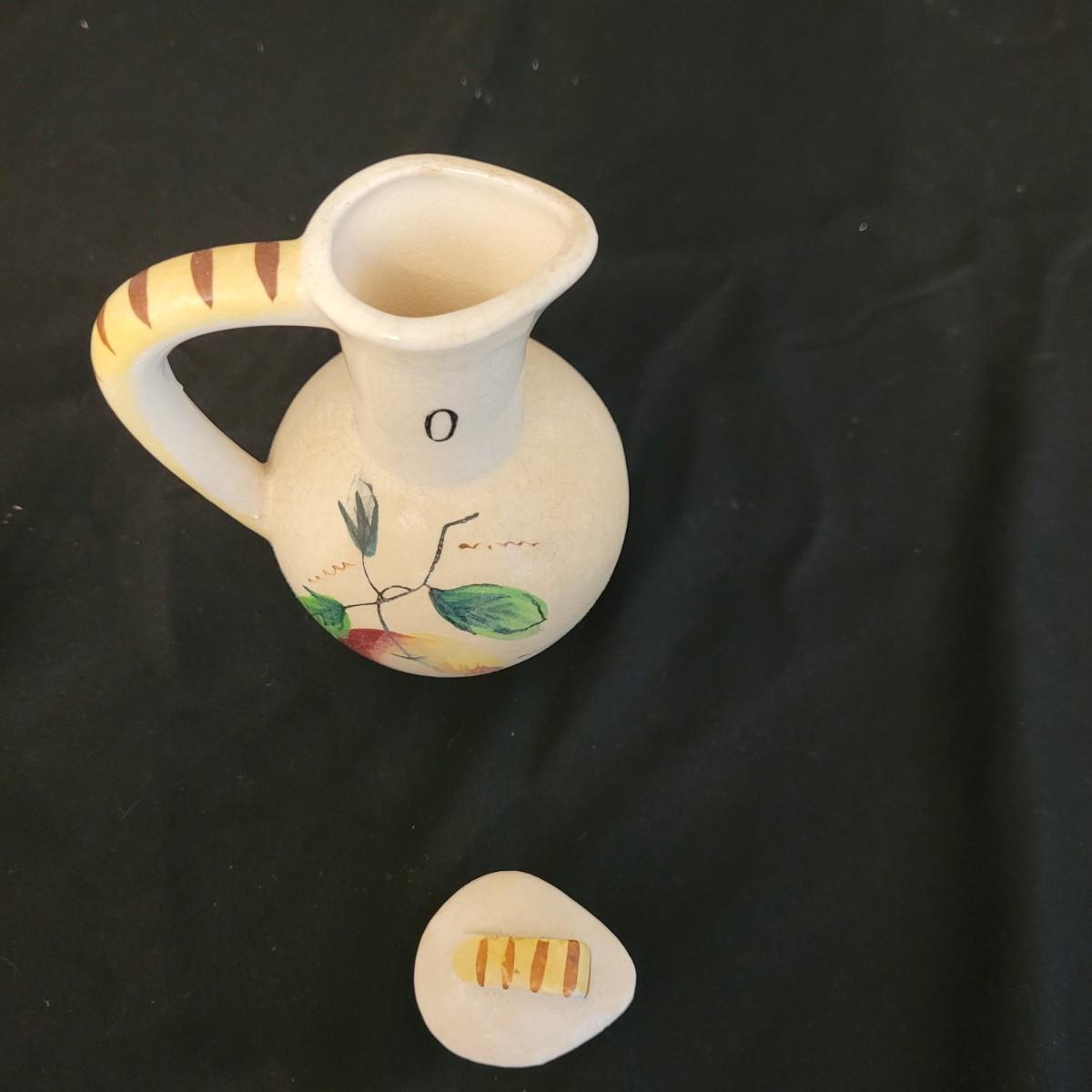 Cute collection of ceramic kitchen items, including a teapot with locking lid and matching sugar/cream container, small olive and vinegar pitchers, and a salt and pepper shaker set. Items in good condition with some chips, crazing and grime (appears to be easily cleanable). Teapot measures approximately 8.5"H. Shipping available.