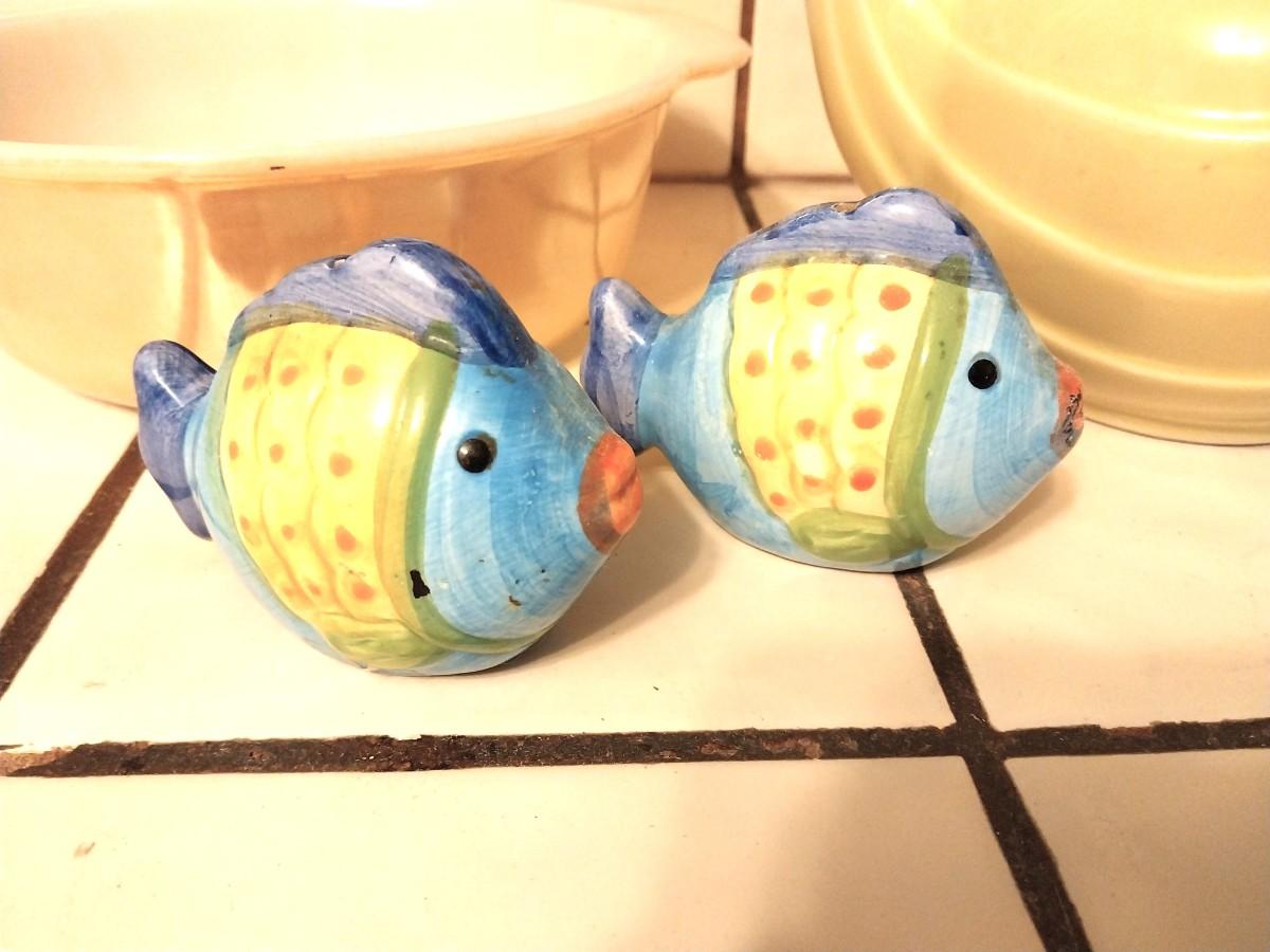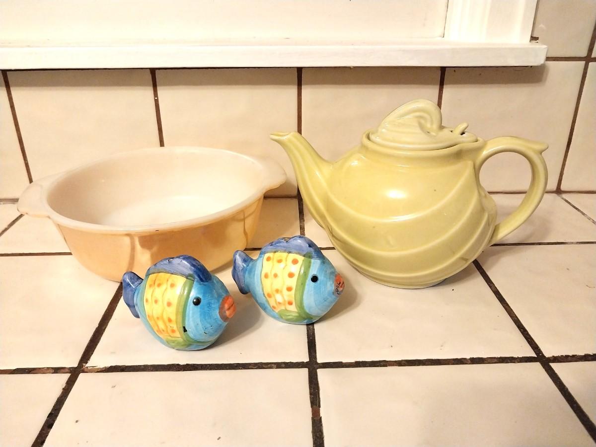 CERAMIC HALL TEAPOT-FISH S&P SHAKERS-FIREKING CASAROLL DISH