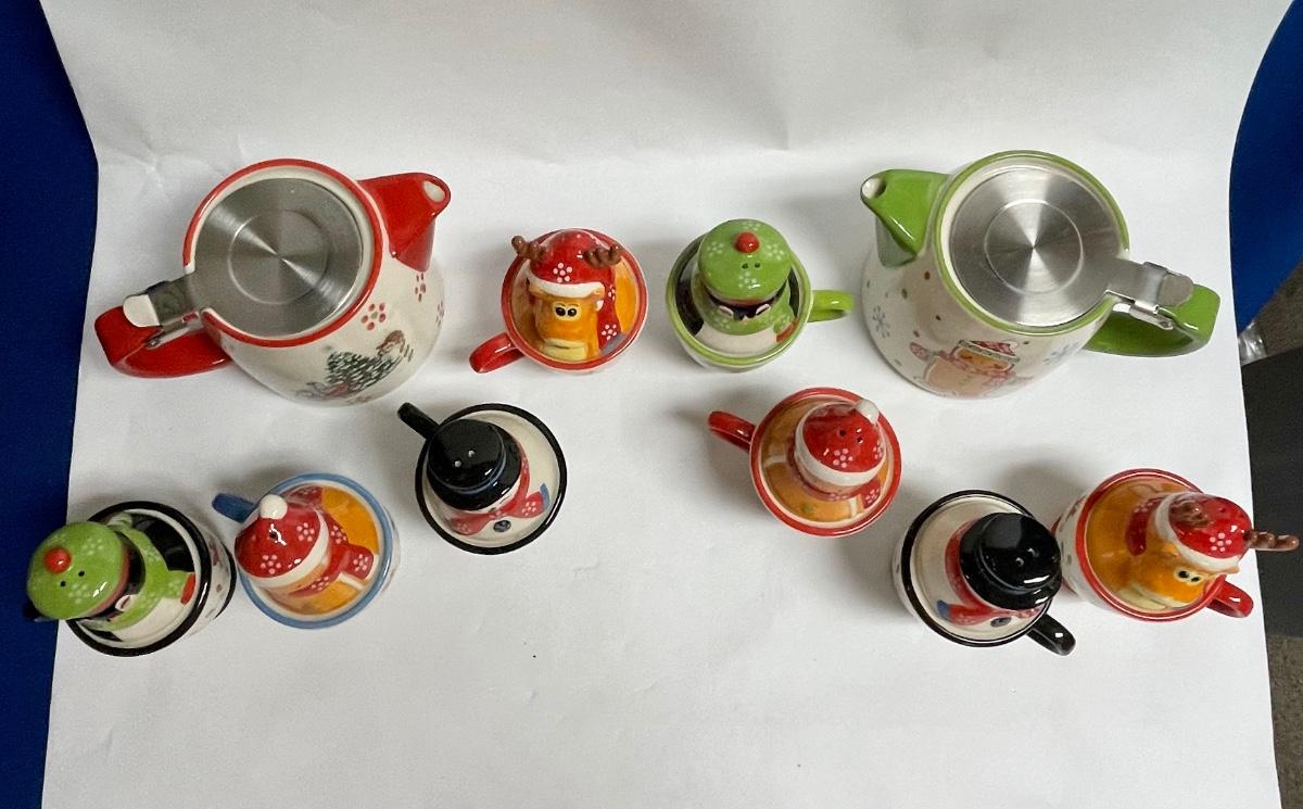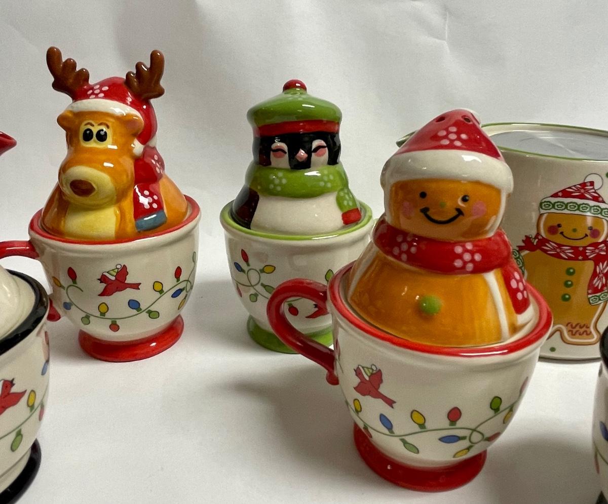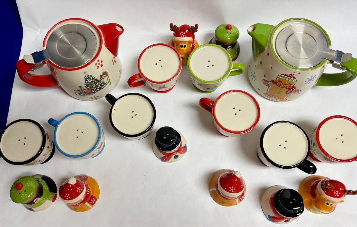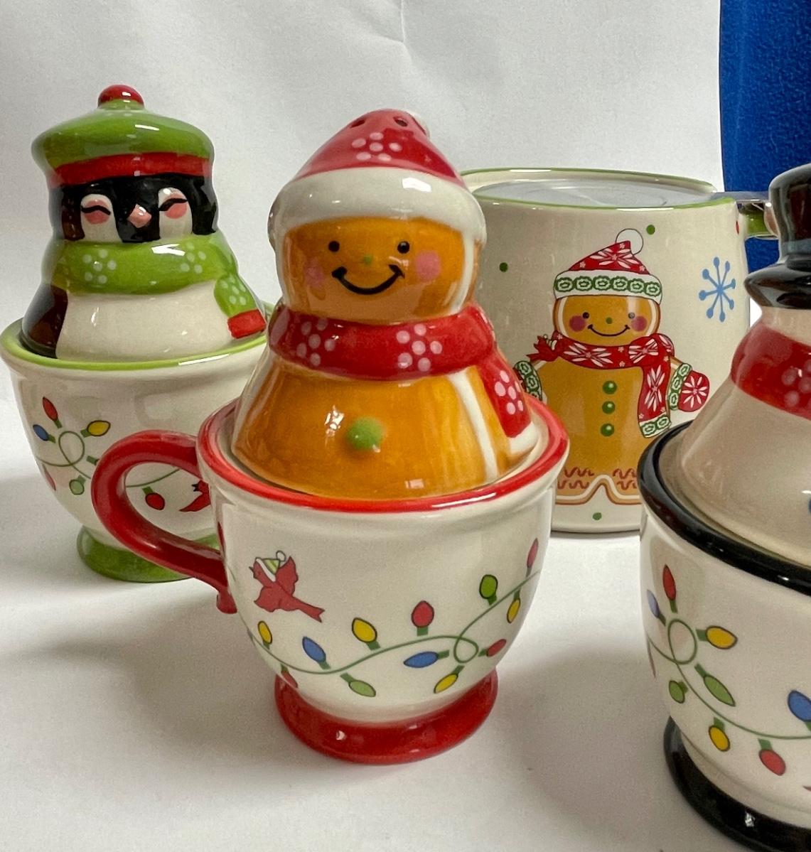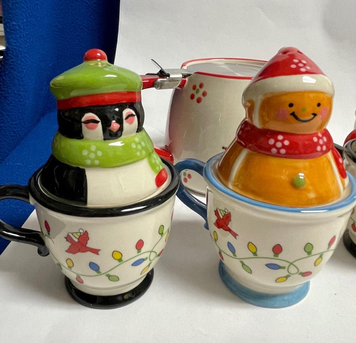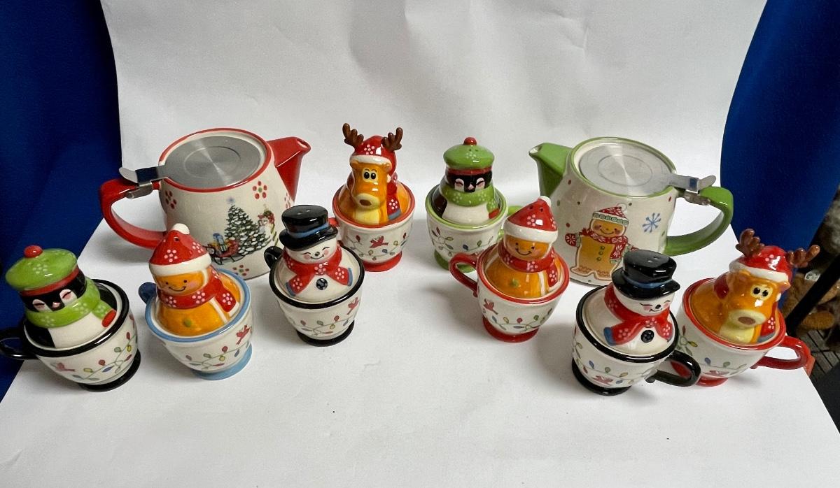 Ceramic Temptations by Tara Lot of Salt & Pepper sets - Gingerbread couple, Snowman couple, Moose & Penguin - plus teapots