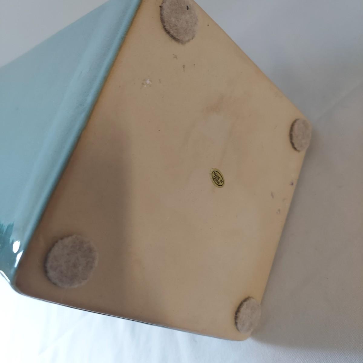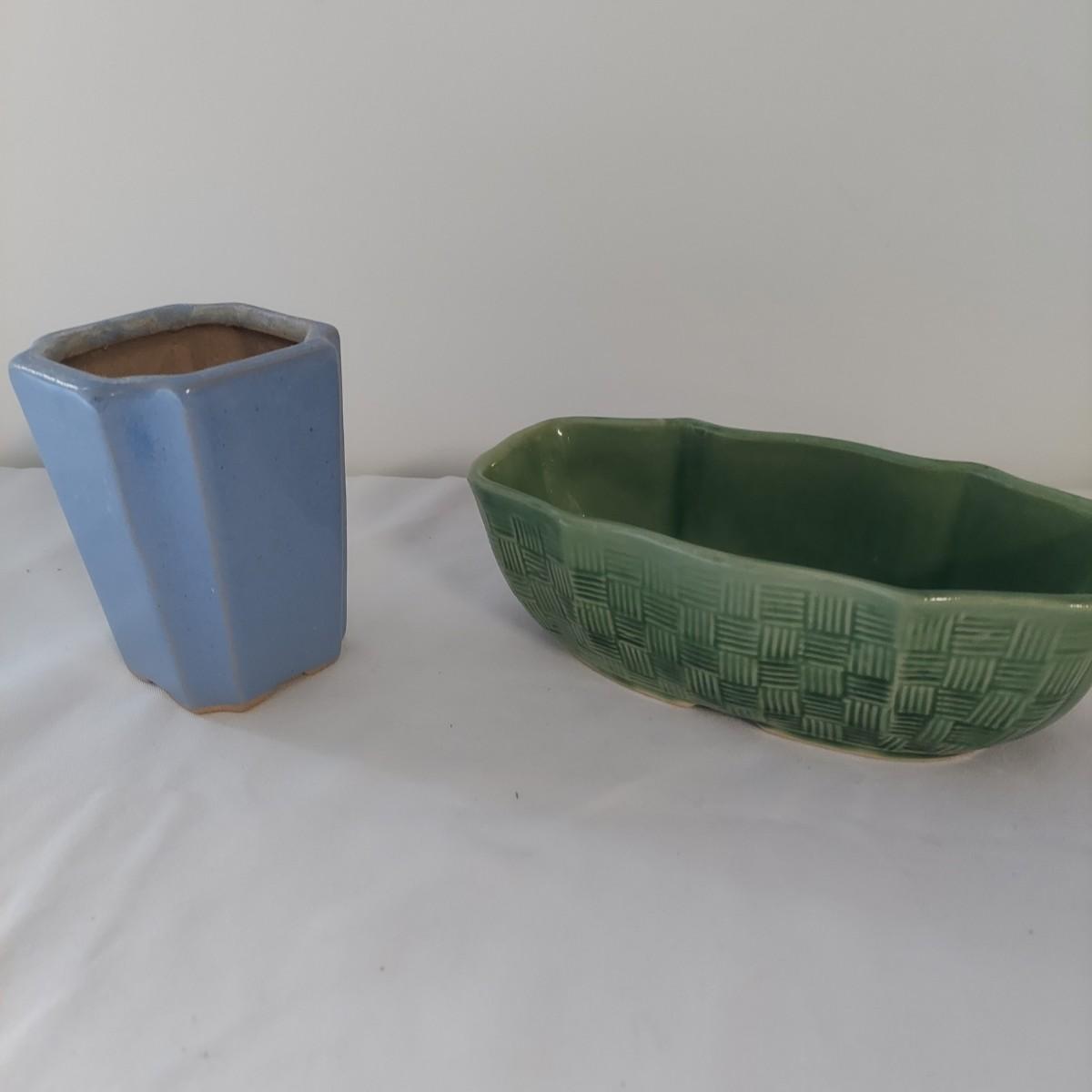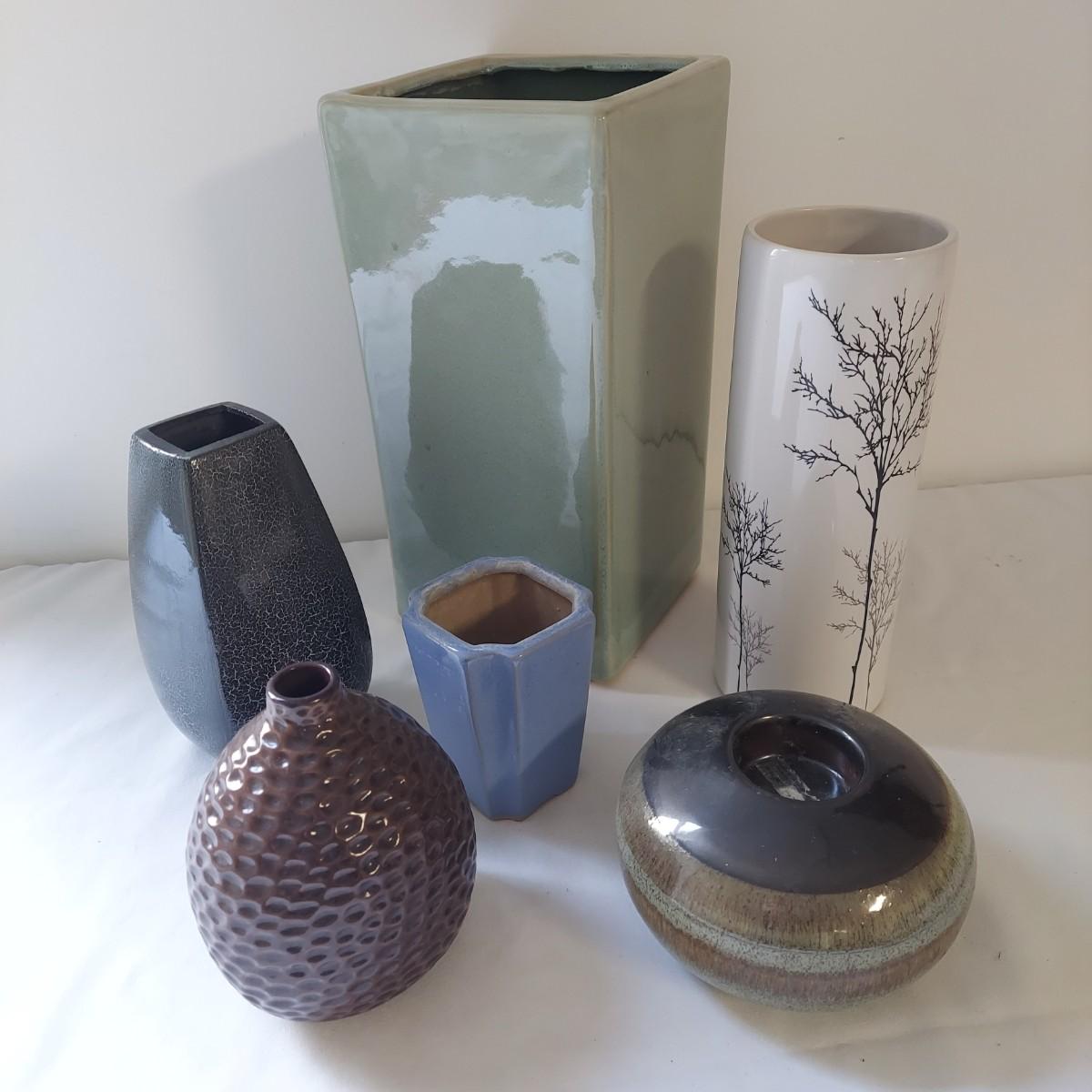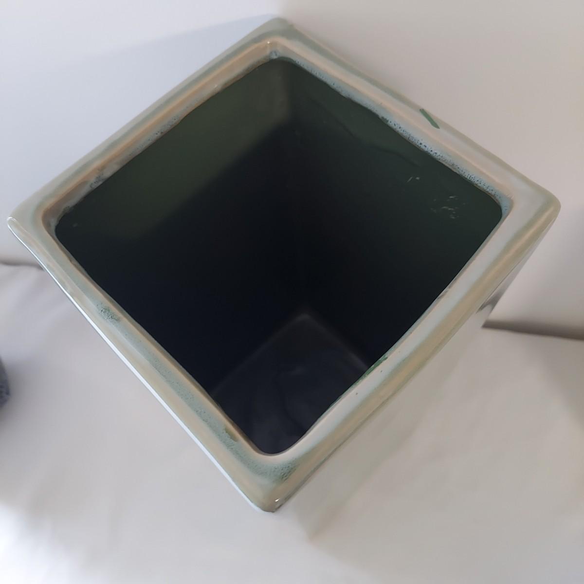 Nine pieces of ceramics by Potterybarn and more. The green dish appears to be vintage Shawnee USA mold 150. The largest square vase measures 6"SQ x 12"H. Please see photos for details. Shipping available