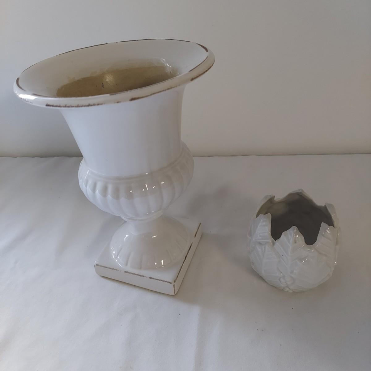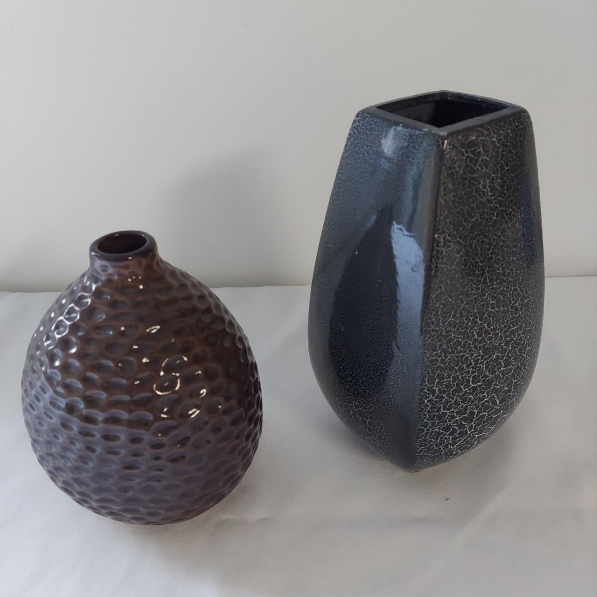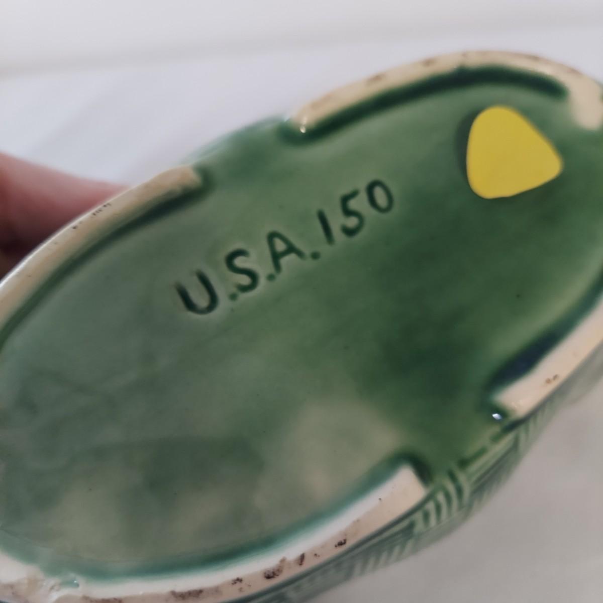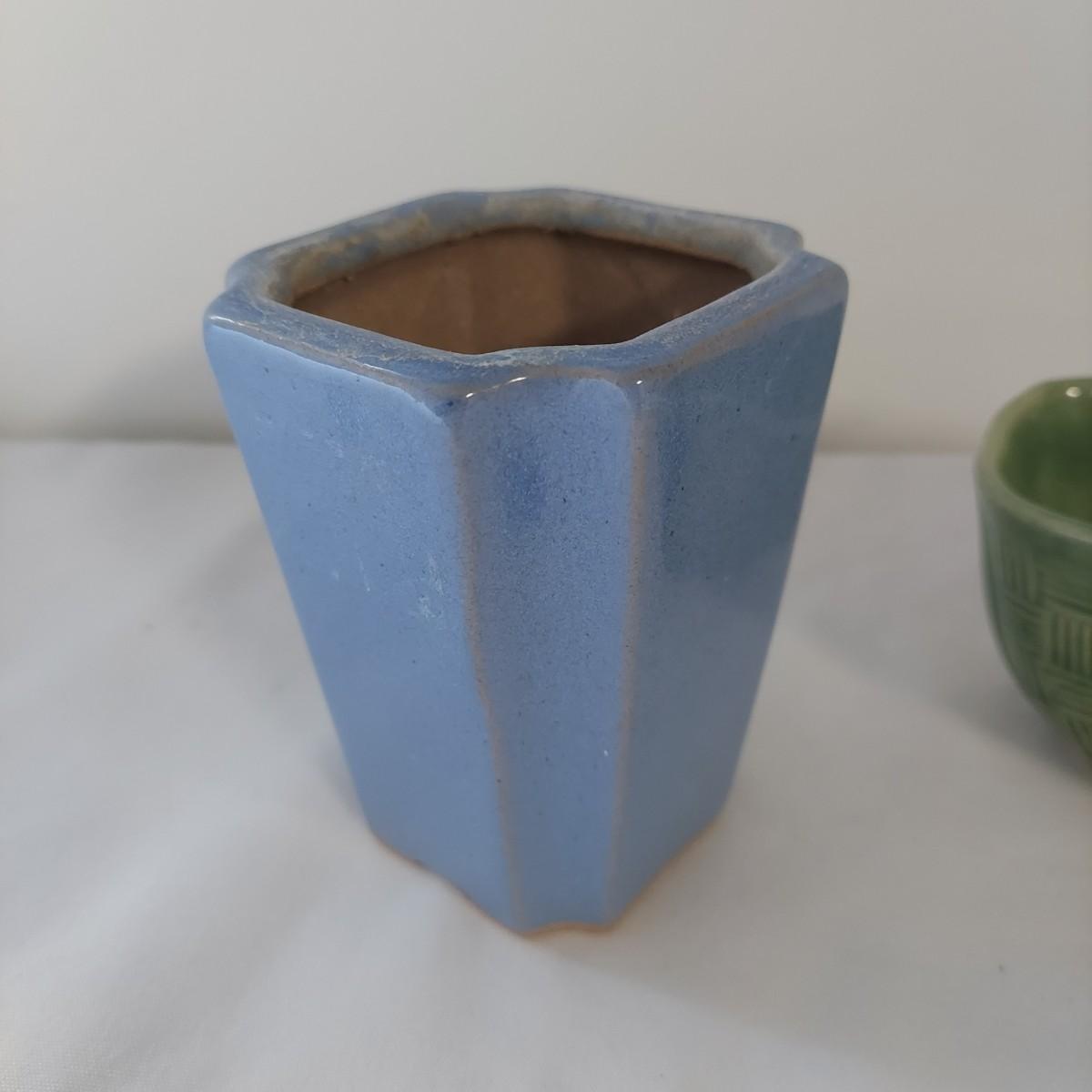 Nine pieces of ceramics by Potterybarn and more. The green dish appears to be vintage Shawnee USA mold 150. The largest square vase measures 6"SQ x 12"H. Please see photos for details. Shipping available