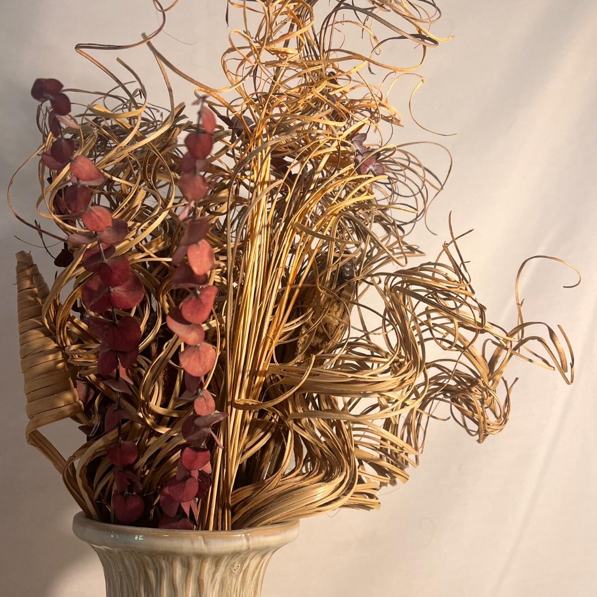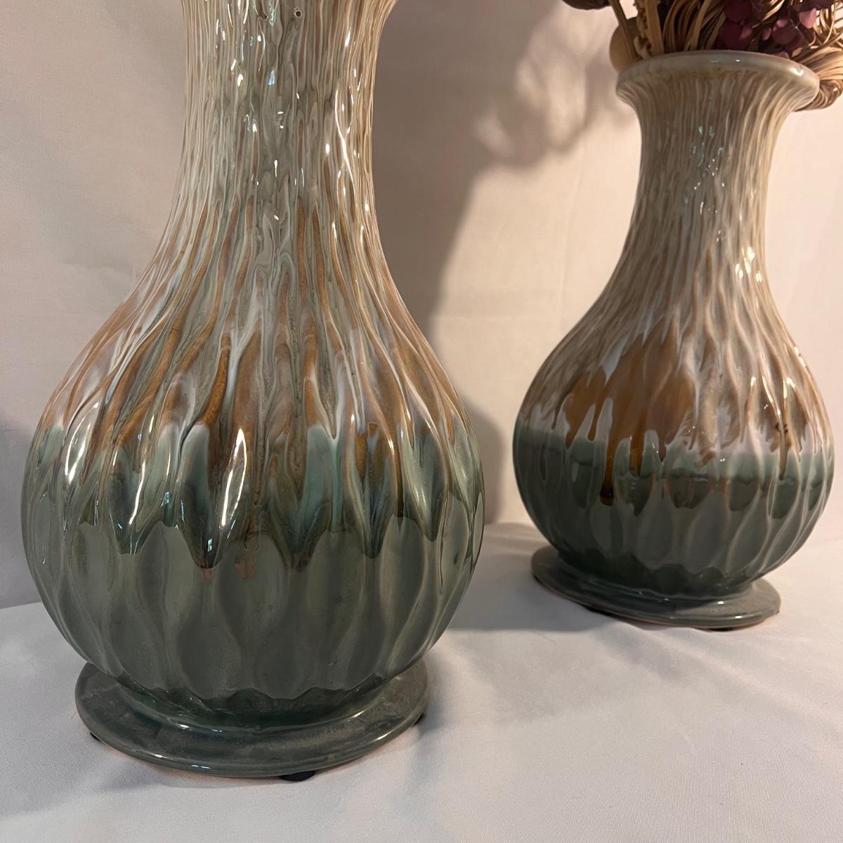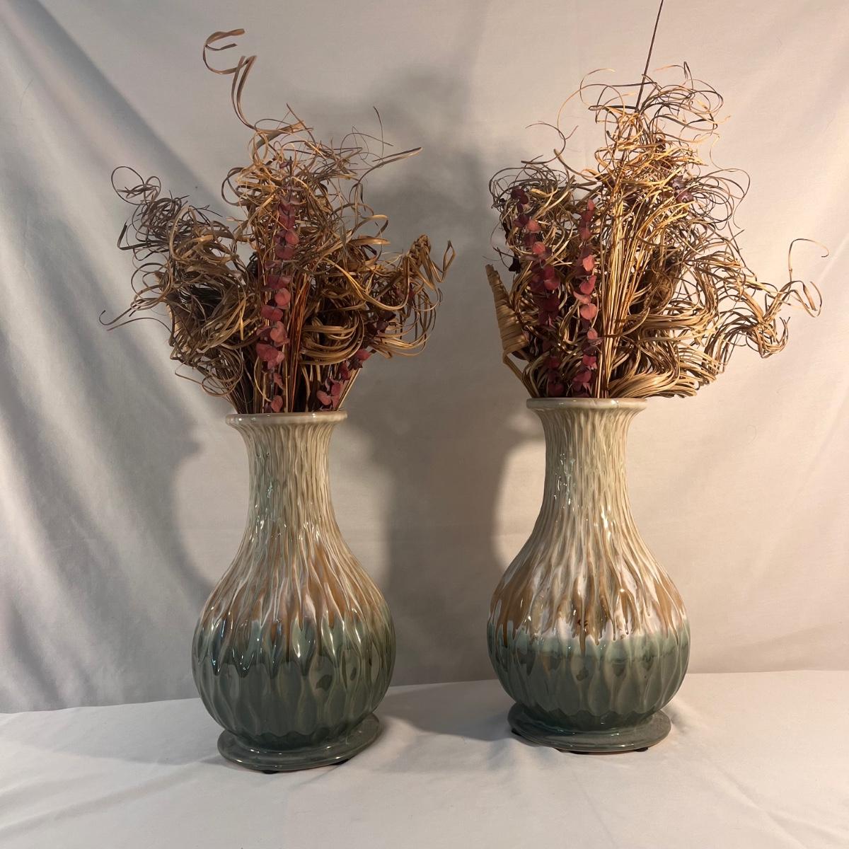 This lot includes two large ceramic vases with two similar faux flower arrangements. The vases measure 13”D x 14”H, but with the flowers included it is 26”H. Shipping available. Shipping can be costly. We suggest contacting our preferred local shipping provider, Postage Express, with dimensions and getting an estimate before bidding: (828) 255-9250 or shipping@postageexpressnc.com.