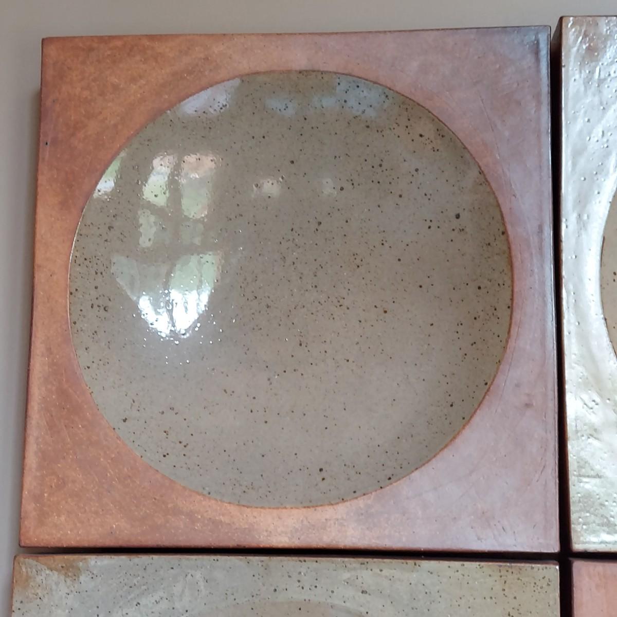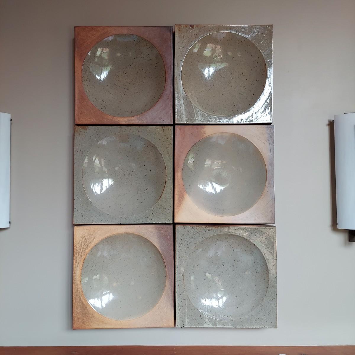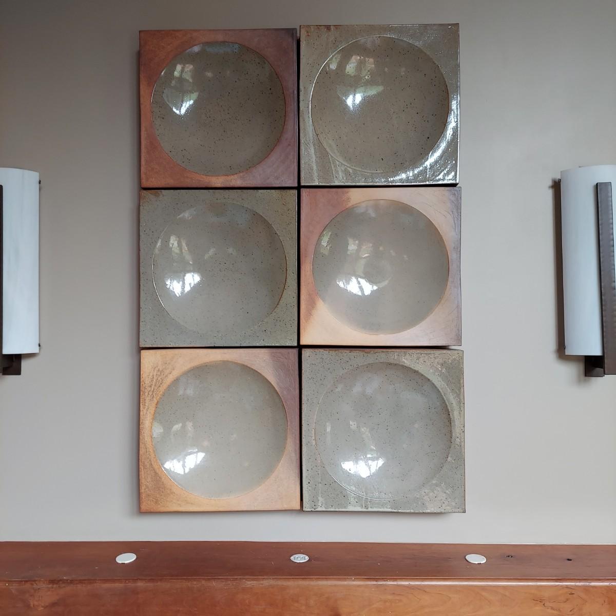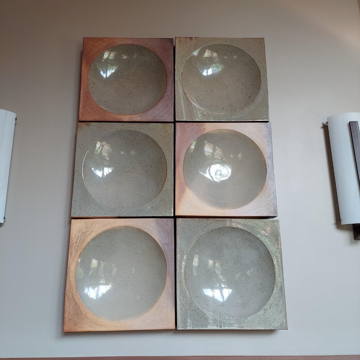 Large ceramic wall art piece. There are six individual signed pieces and each is 17" square and nearly 3" deep. They are glazed in shades of tan, rust and sage green. Winning bidder is required to remove and take the original mounting board. A ladder and socket set will be needed. Local Pickup Only.