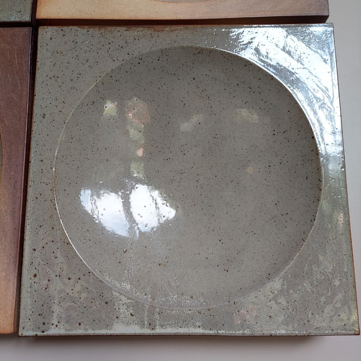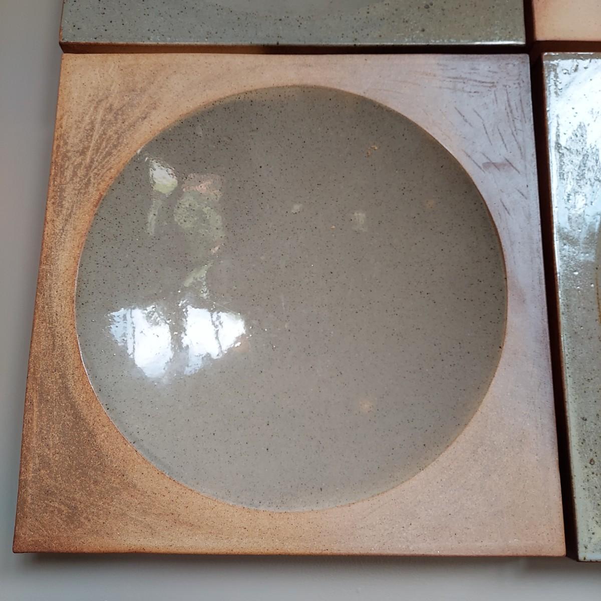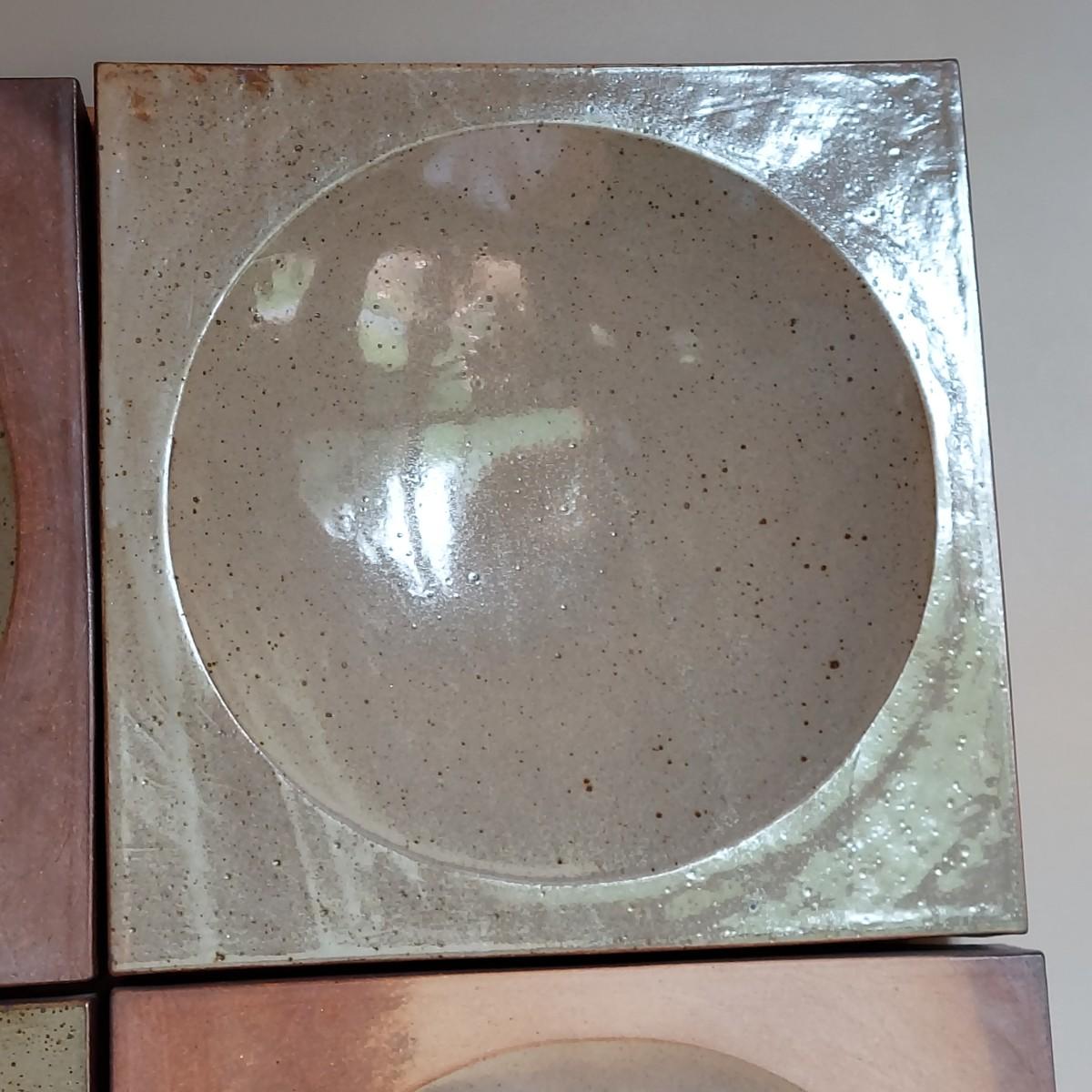 Large ceramic wall art piece. There are six individual signed pieces and each is 17" square and nearly 3" deep. They are glazed in shades of tan, rust and sage green. Winning bidder is required to remove and take the original mounting board. A ladder and socket set will be needed. Local Pickup Only.