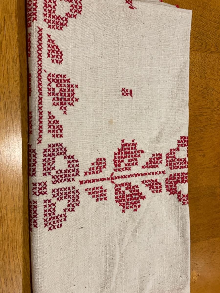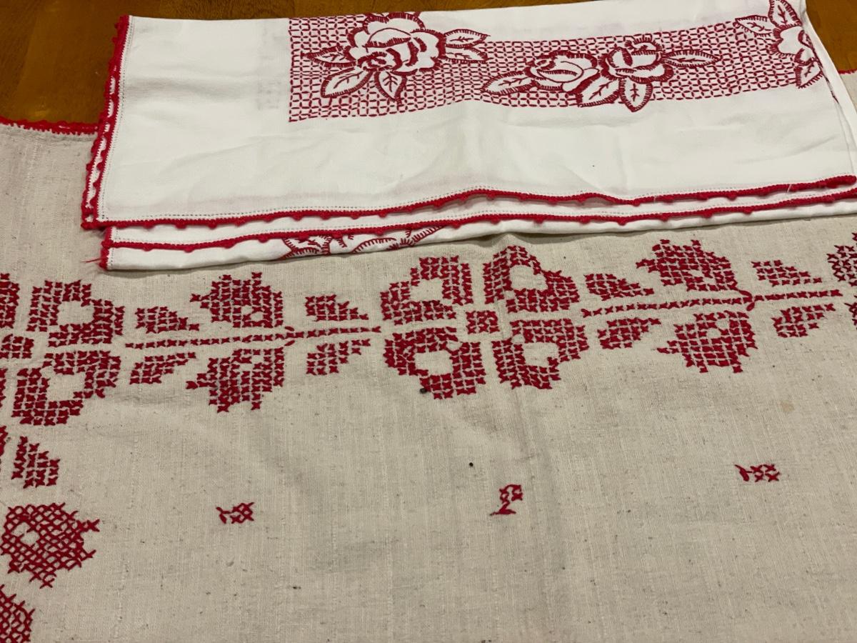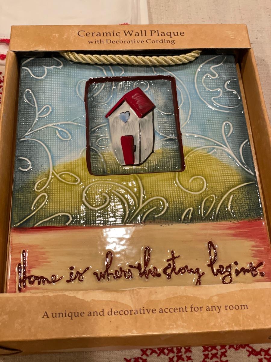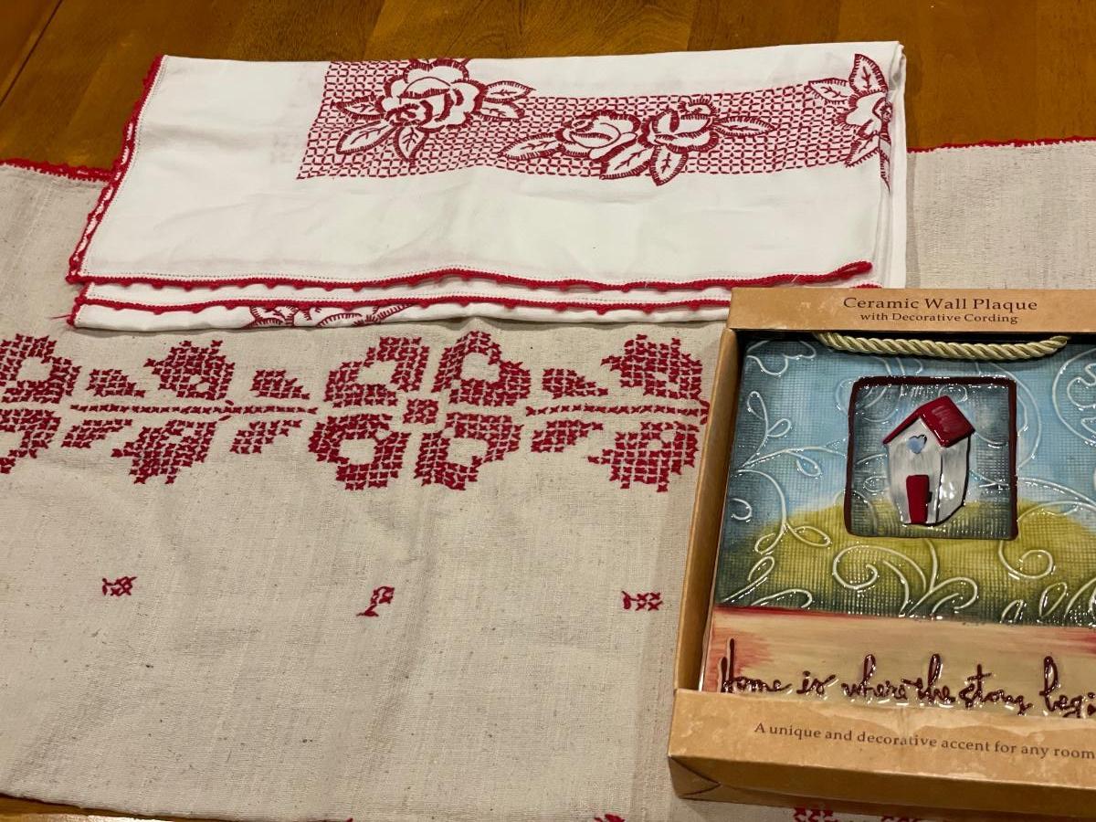 Ceramic wall plaque & red embroidered table cloths