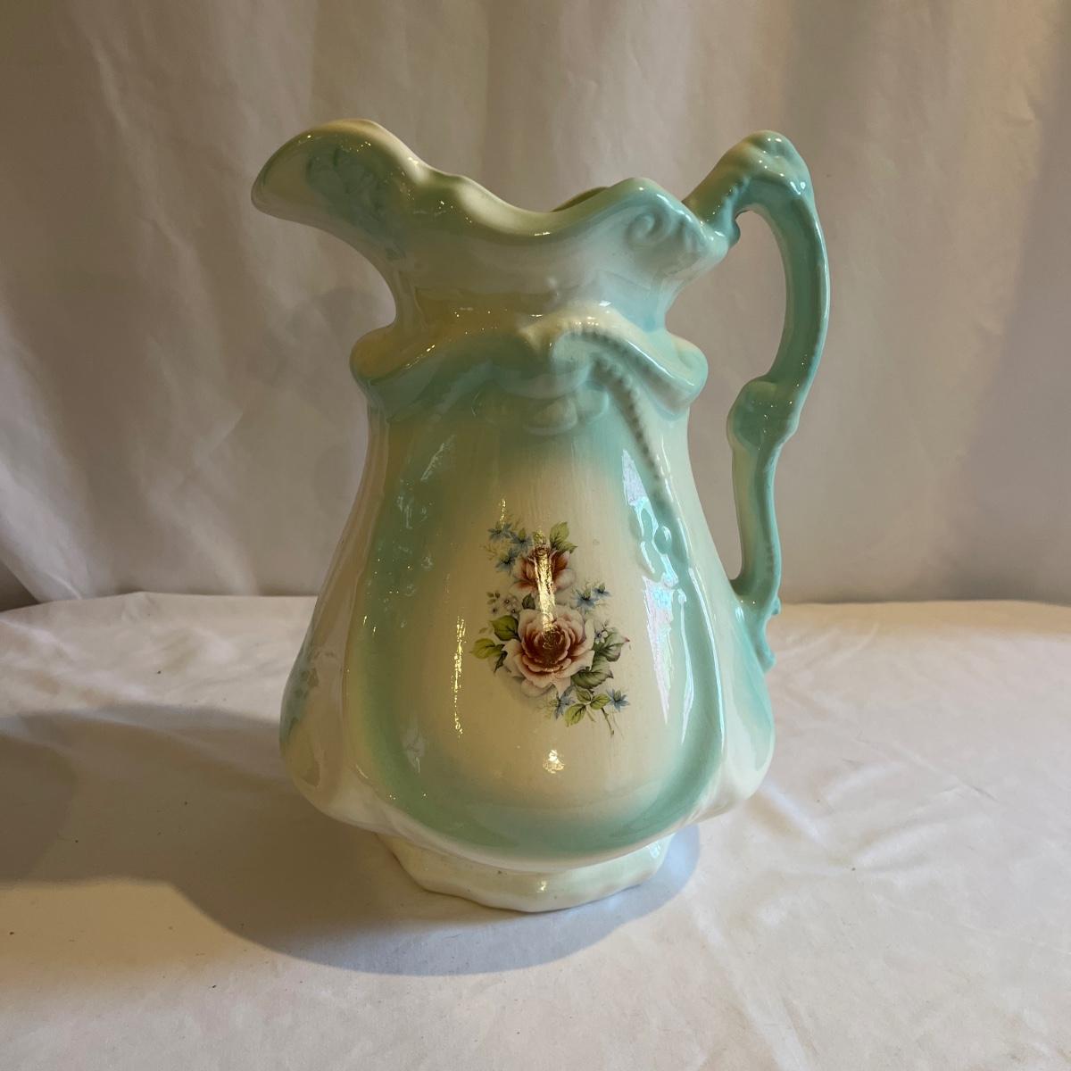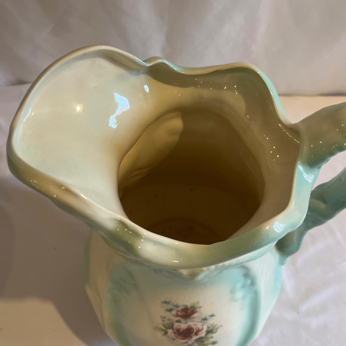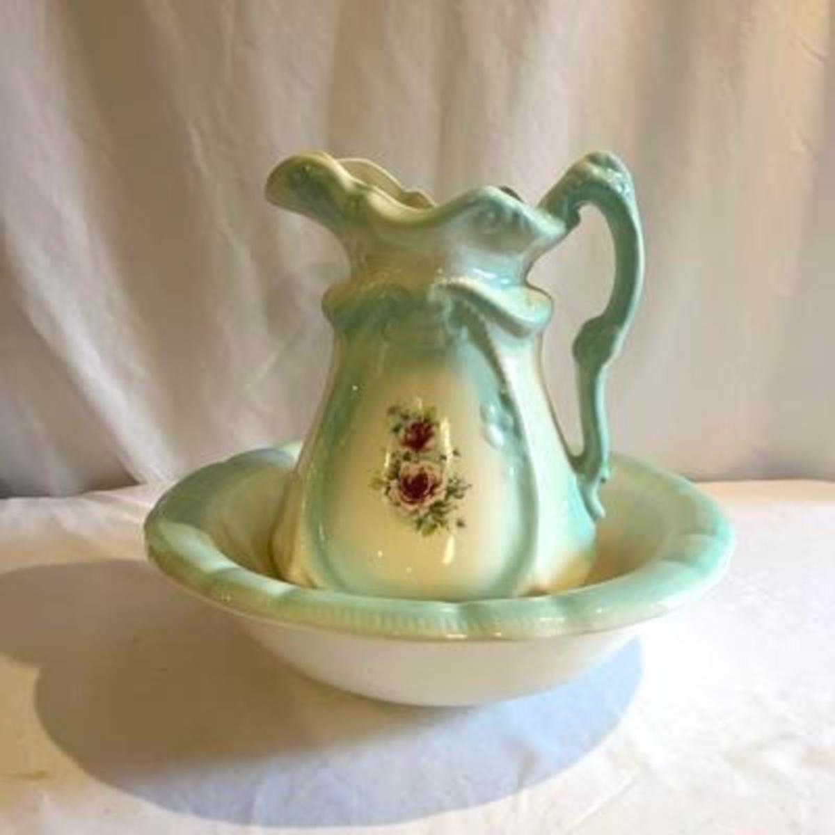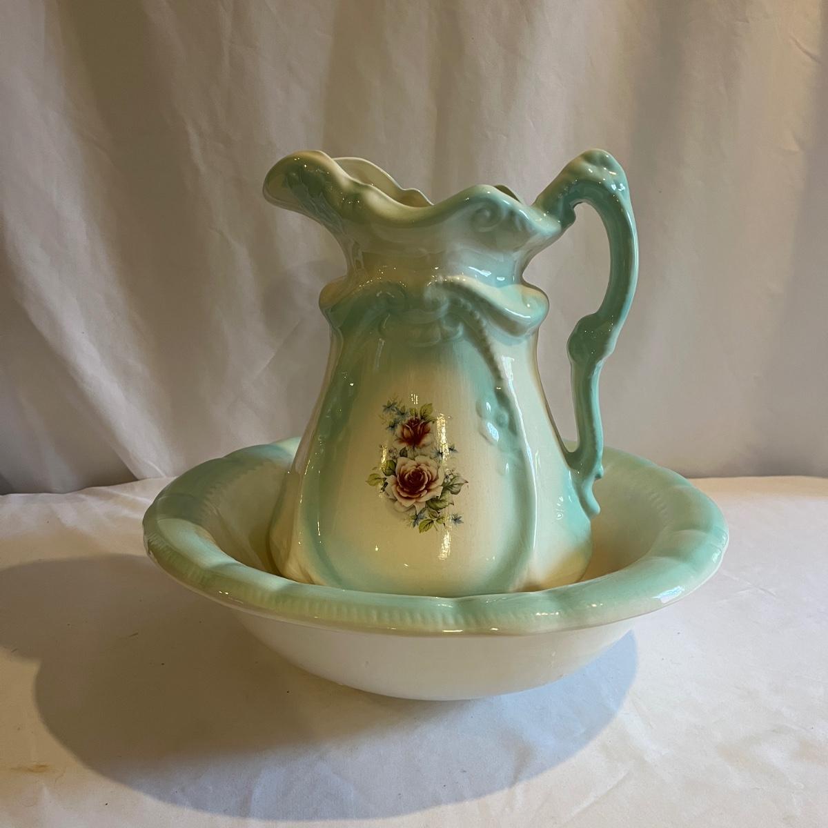This ceramic Wash pitcher and basin set have a floral design. Pitcher measures 9.5”D x 13”H and basin measures 16”D x 5”H.
