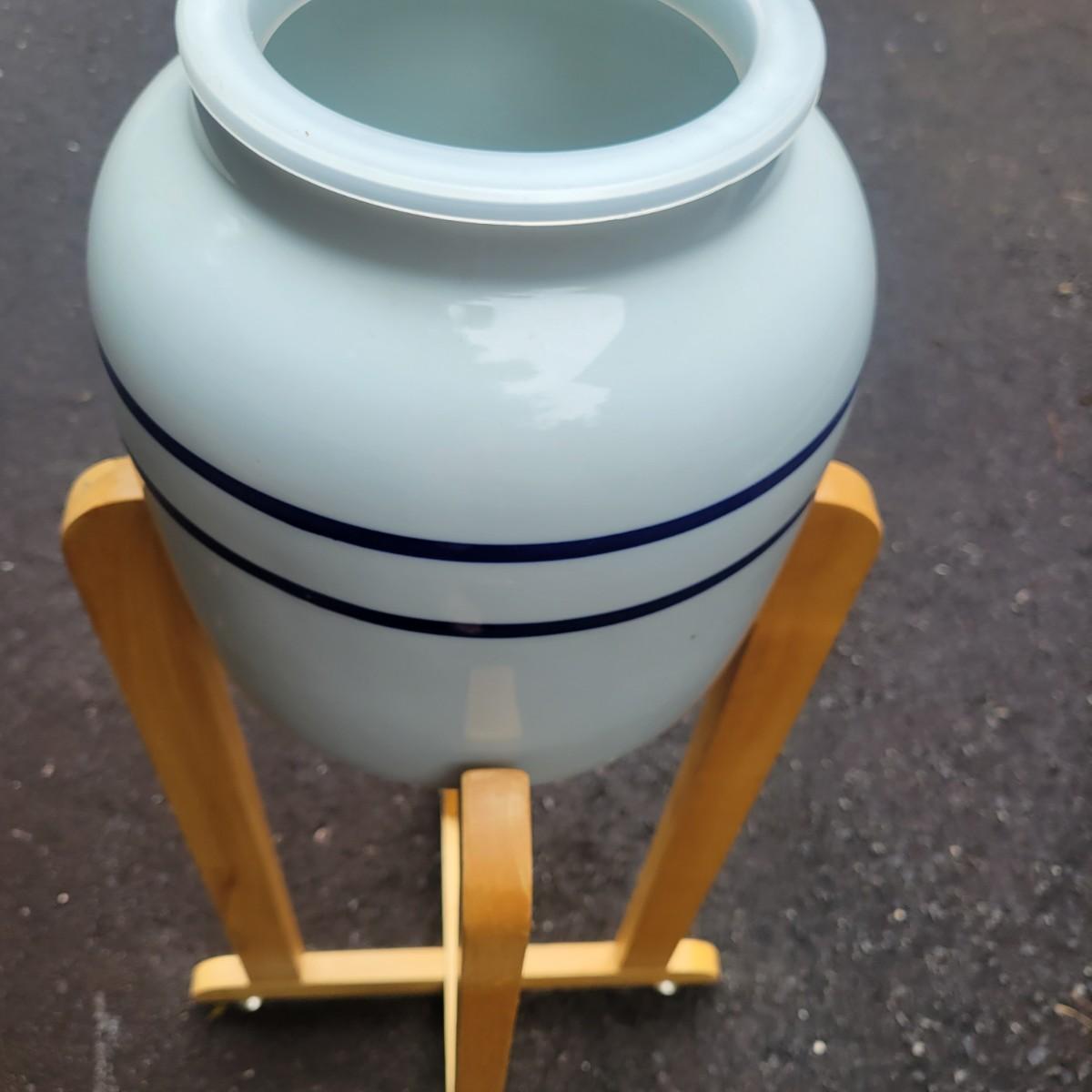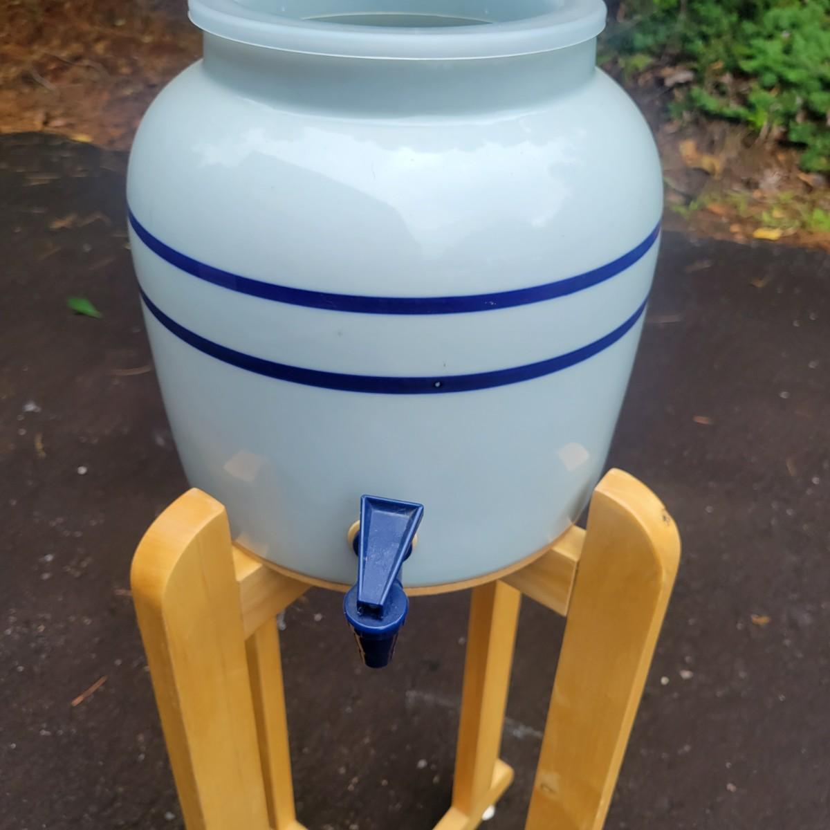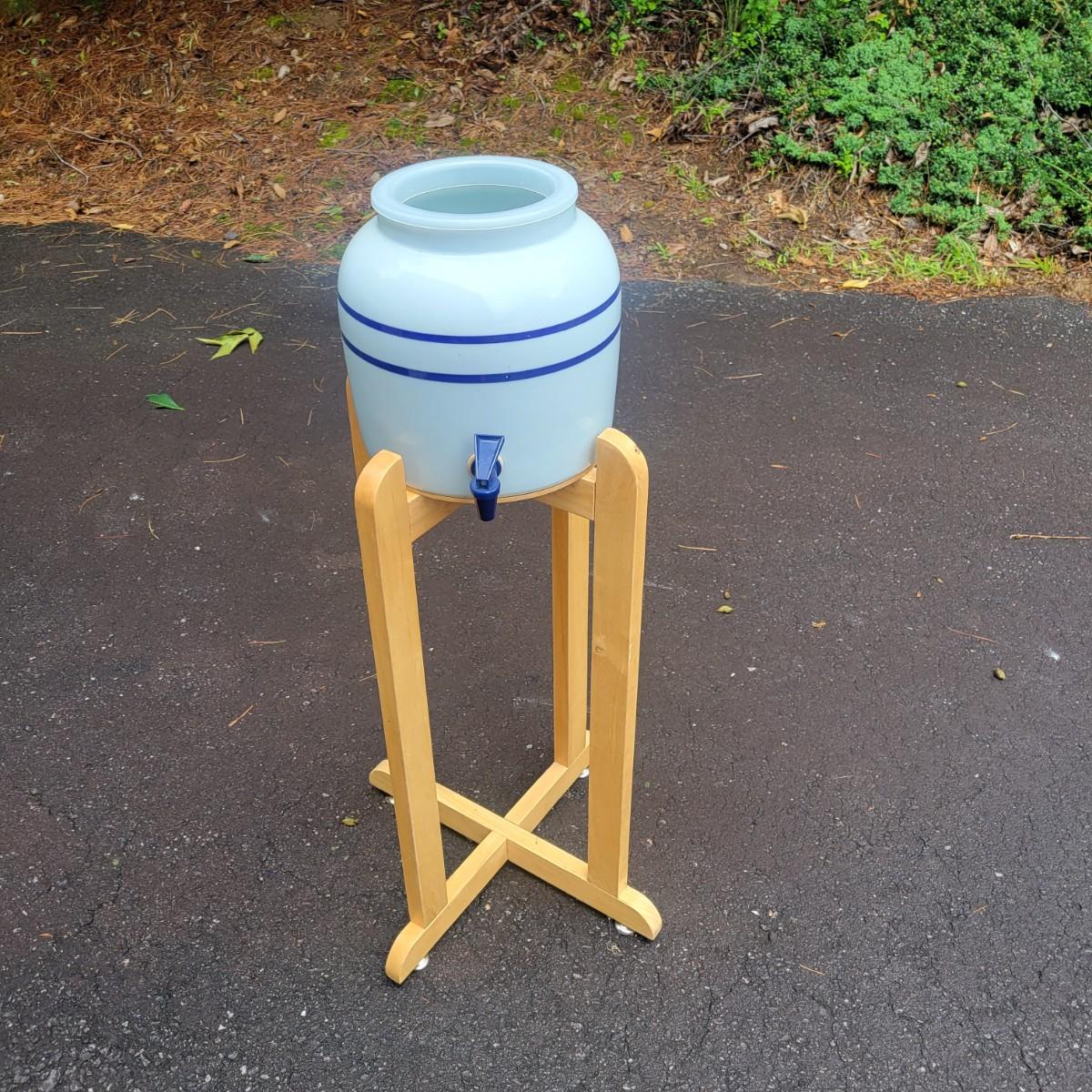 A white with blue accent striped ceramic water bottle dispenser with a blue nozzle. Includes a solid wood stand. The crock and stand measure approximately 14.5"D x 36"H. Local pickup only