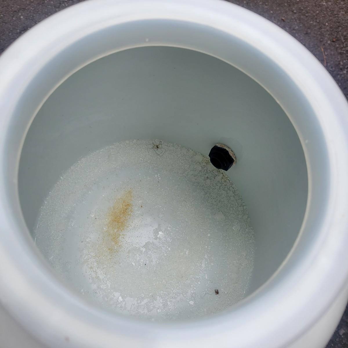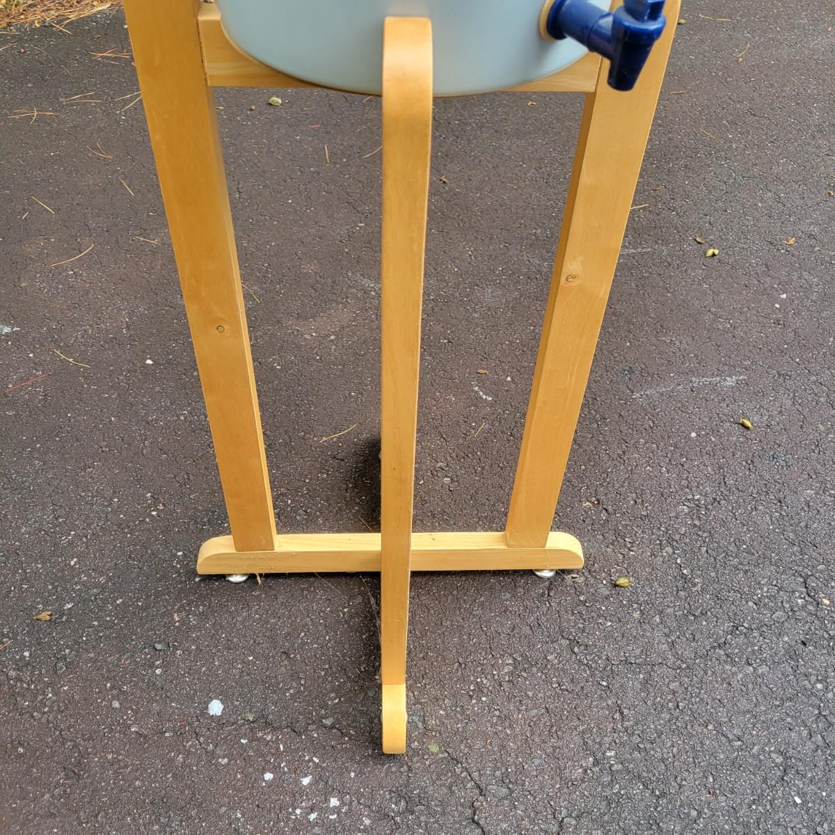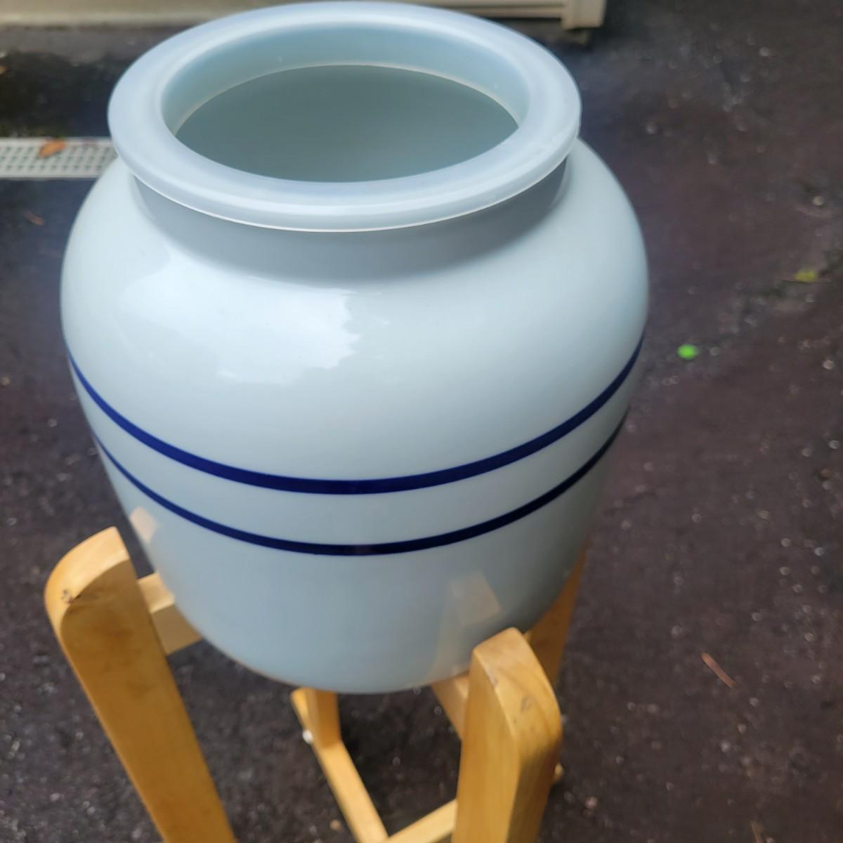 A white with blue accent striped ceramic water bottle dispenser with a blue nozzle. Includes a solid wood stand. The crock and stand measure approximately 14.5"D x 36"H. Local pickup only