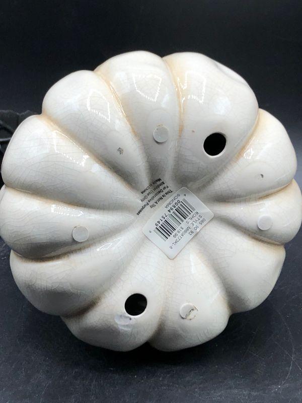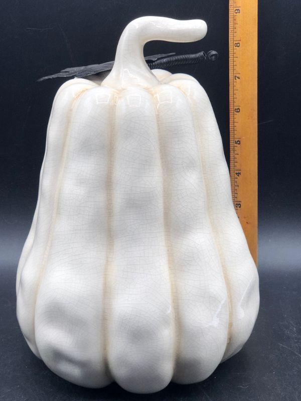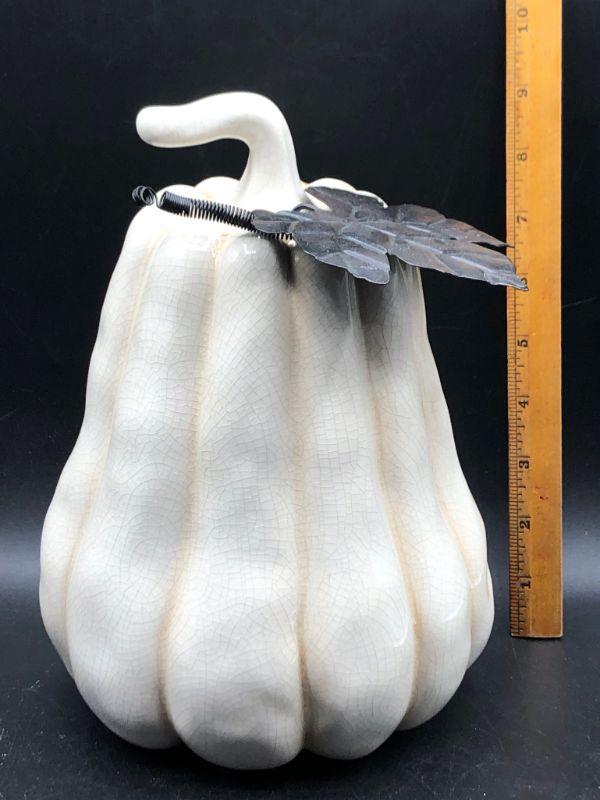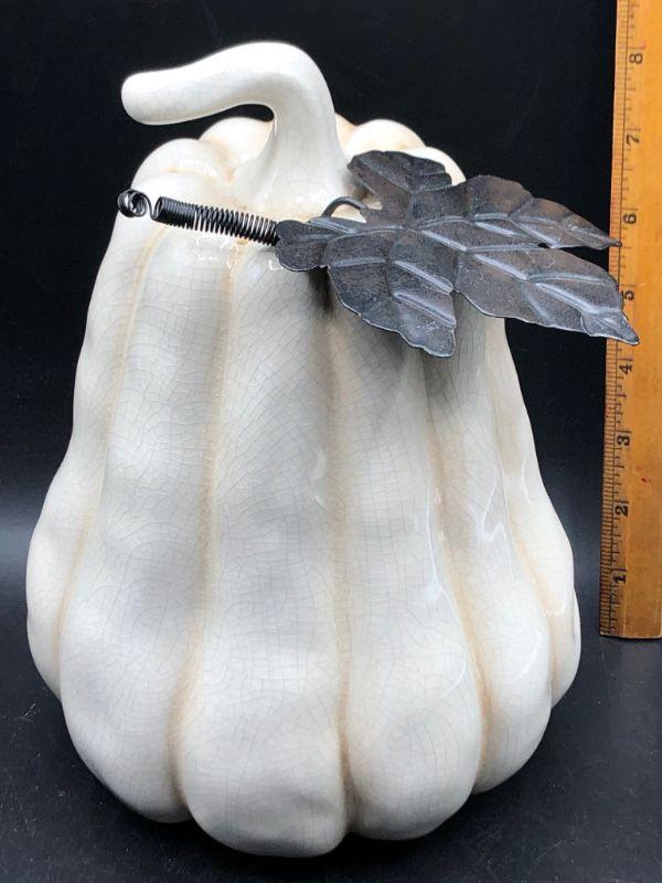 Ceramic White Pumpkin Squash with rustic metal leaves