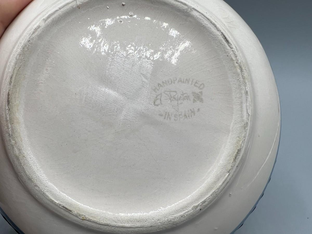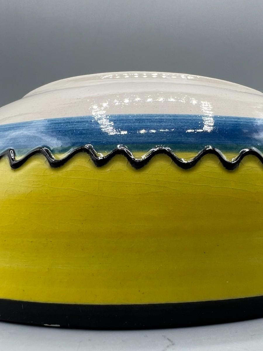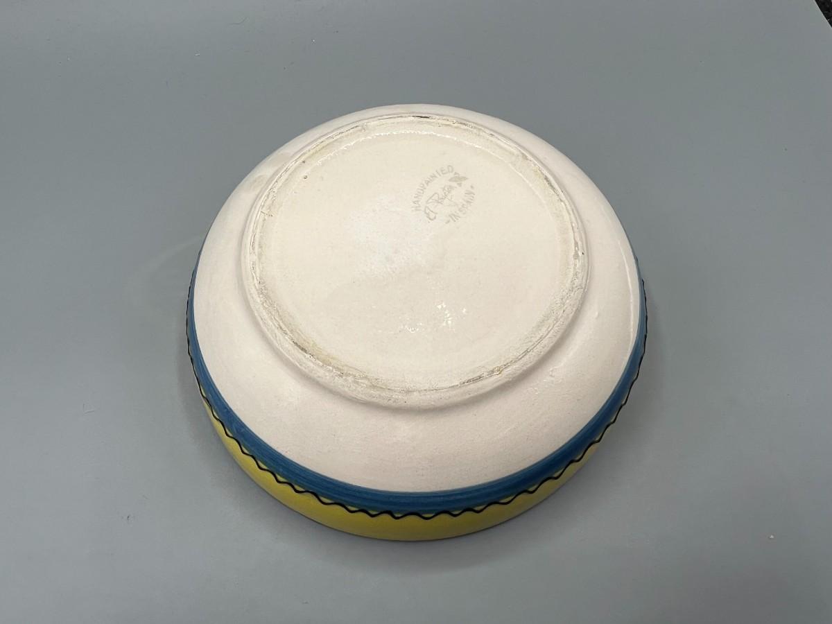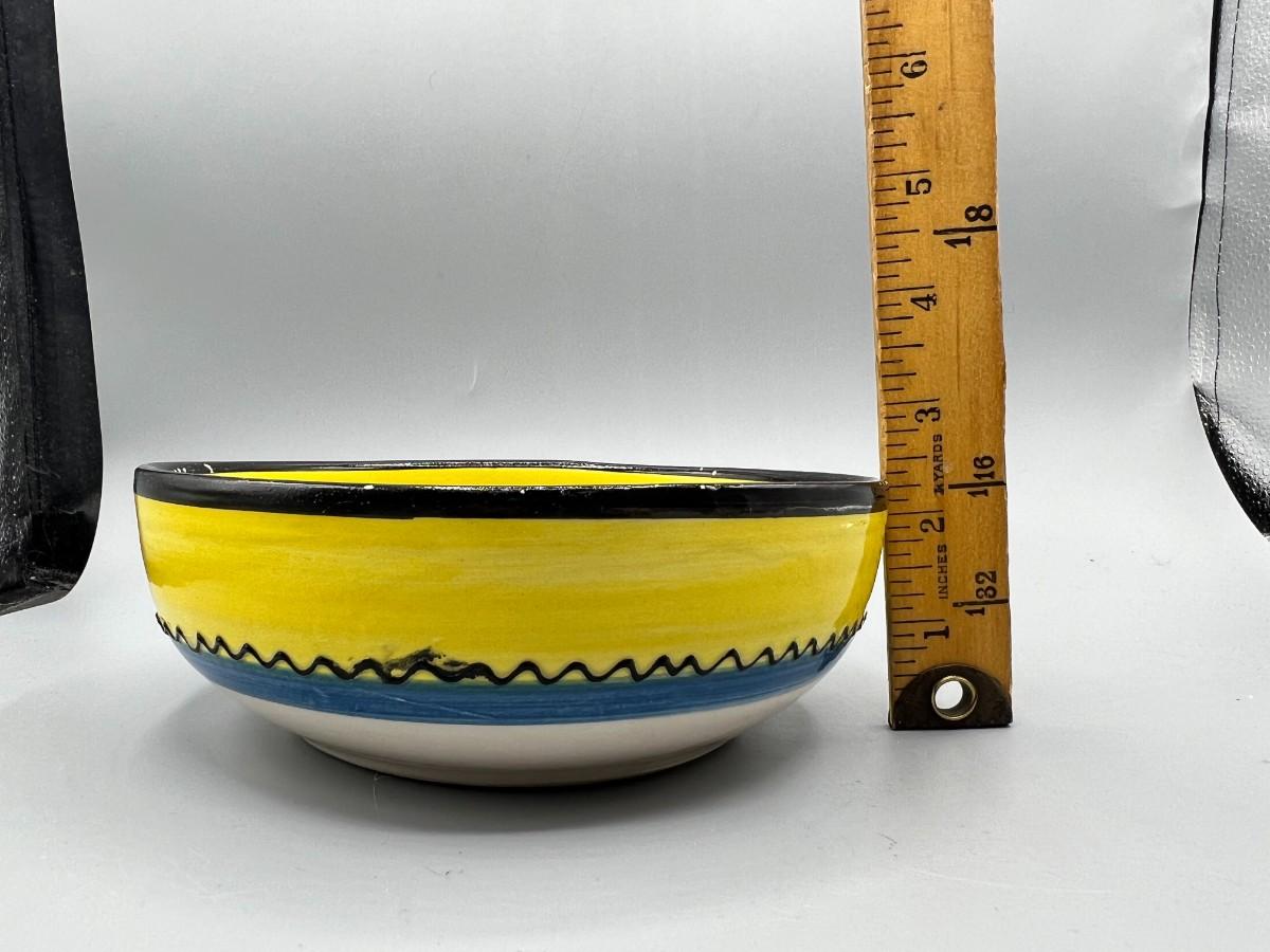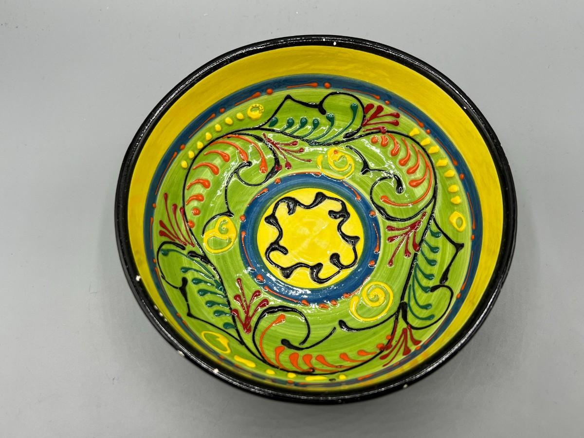 Ceramic bright colored yellow and green mandala pattern bowl. Hand painted in Spain. Good, aged condition does have crazing.