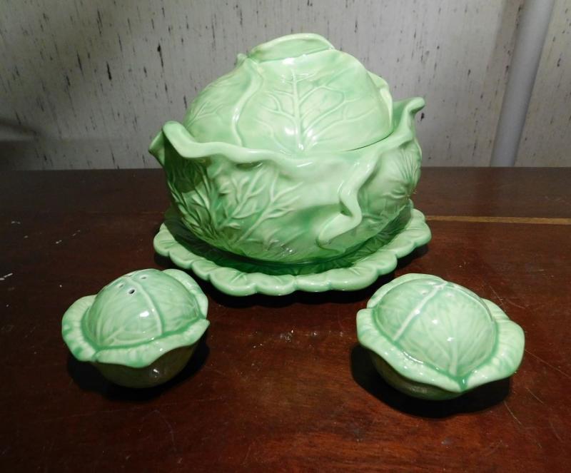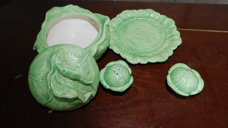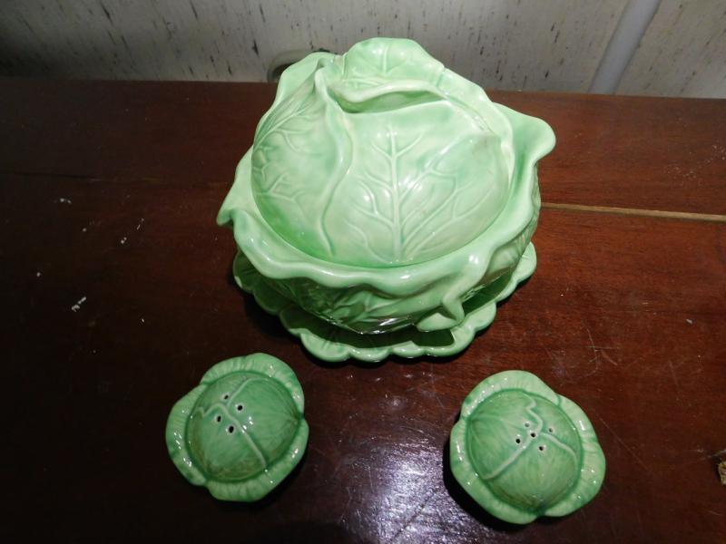 Ceramice Cabbage Shaped Serving Dish with Salt and Pepper Shaker in good condition