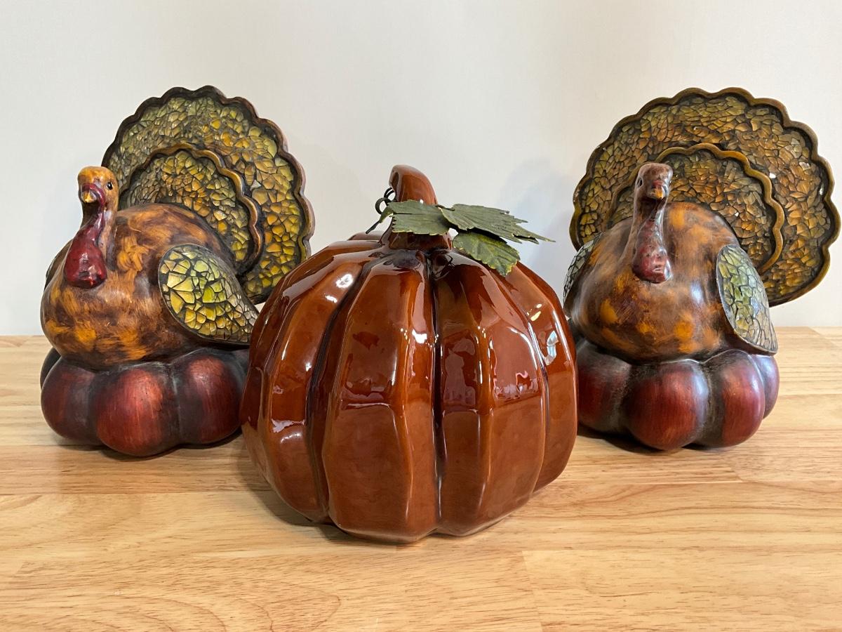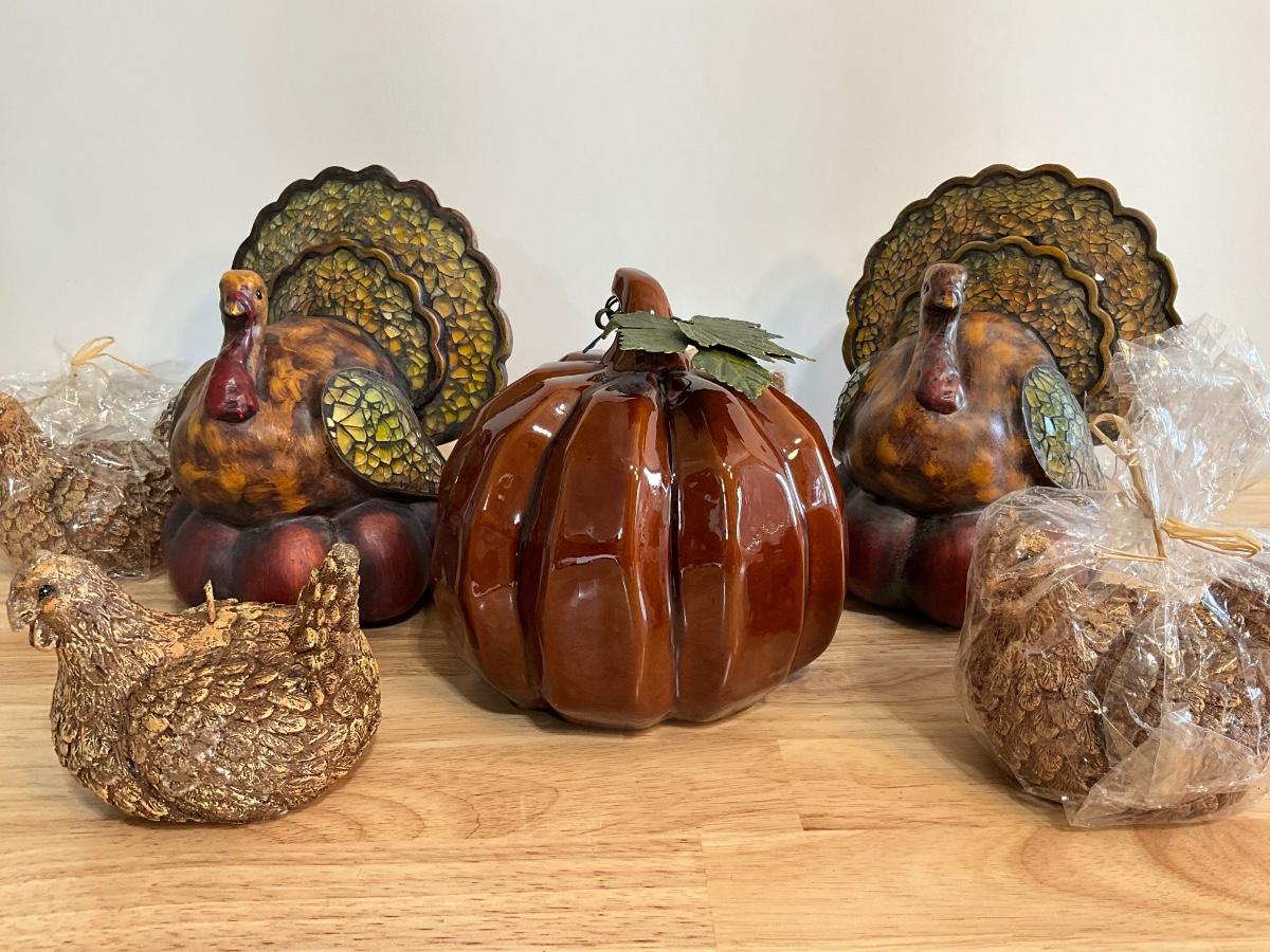 Ceramic/glass turkeys, pumpkin and 4 candle turkeys