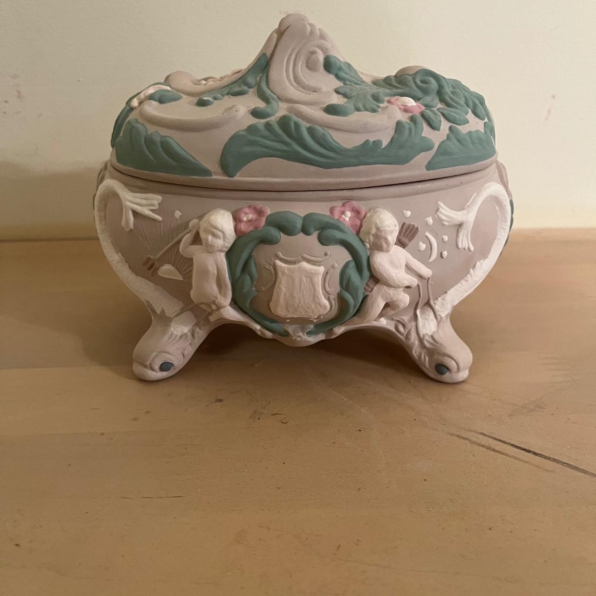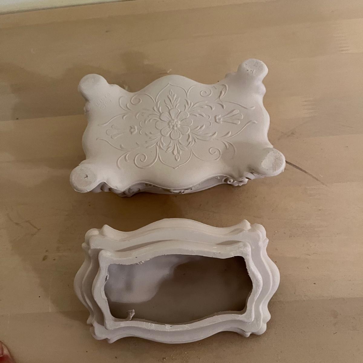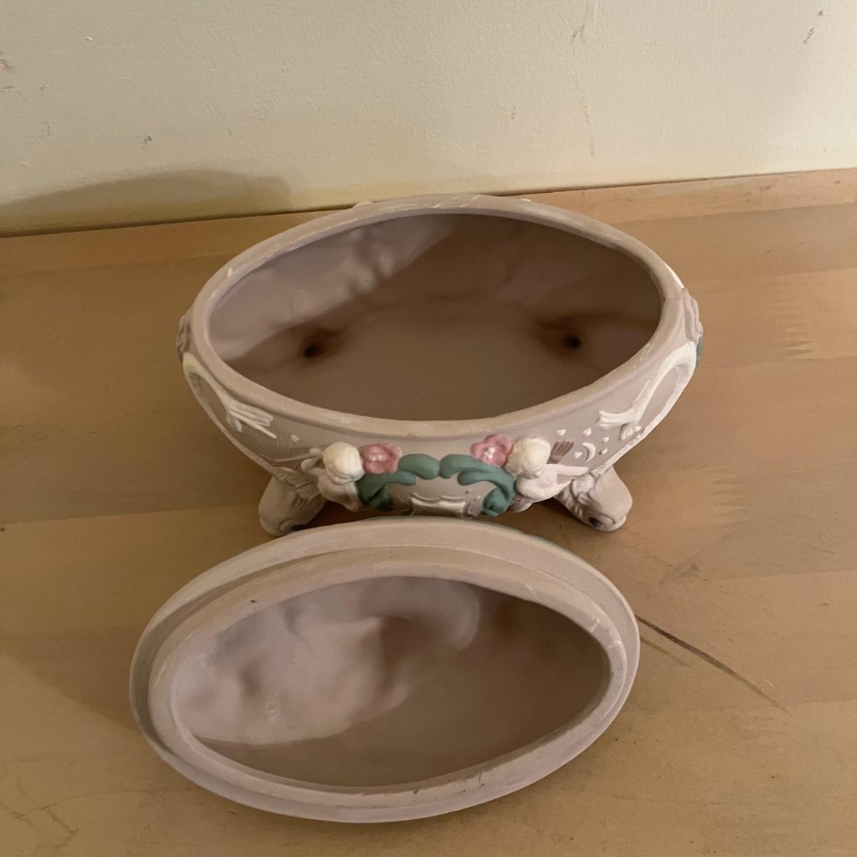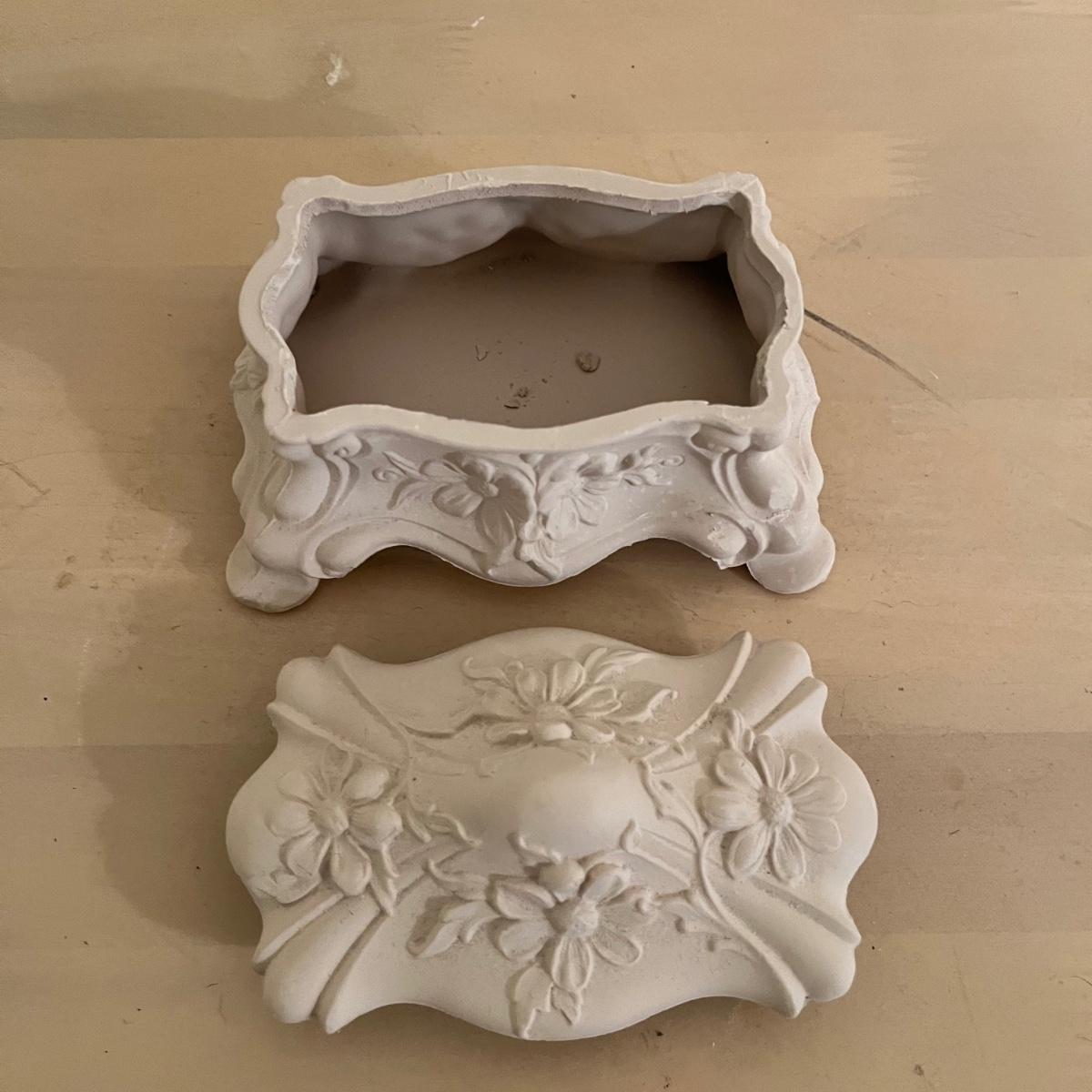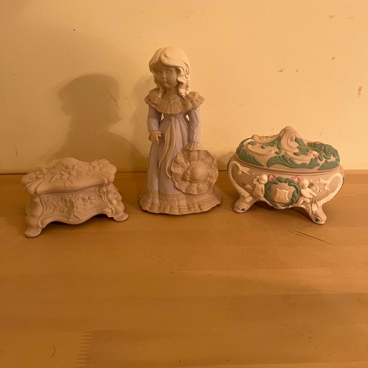 Lot includes one painted and one unpainted ceramic box and a painted ceramic figurine that measures 4.5” D x 8.5” tall.
