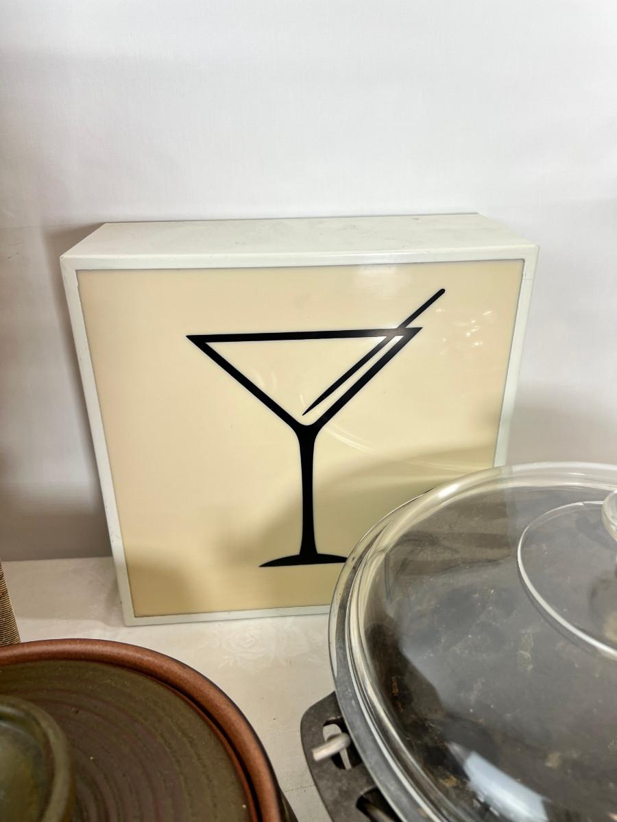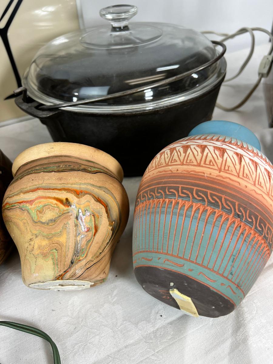 Ceramics, indigenous, stoneware, antique metal ash carrier. Vintage suitcase, David Winter cottage. Martini plastic bar lamp working but burnt out bulb,. cat iron pot with some rust and glass lid.